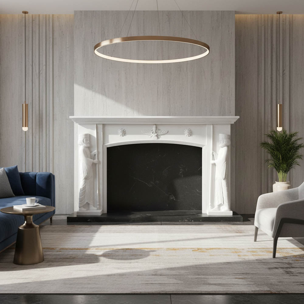 White Marble Fireplace surround hand-carved with Faravahar symbol