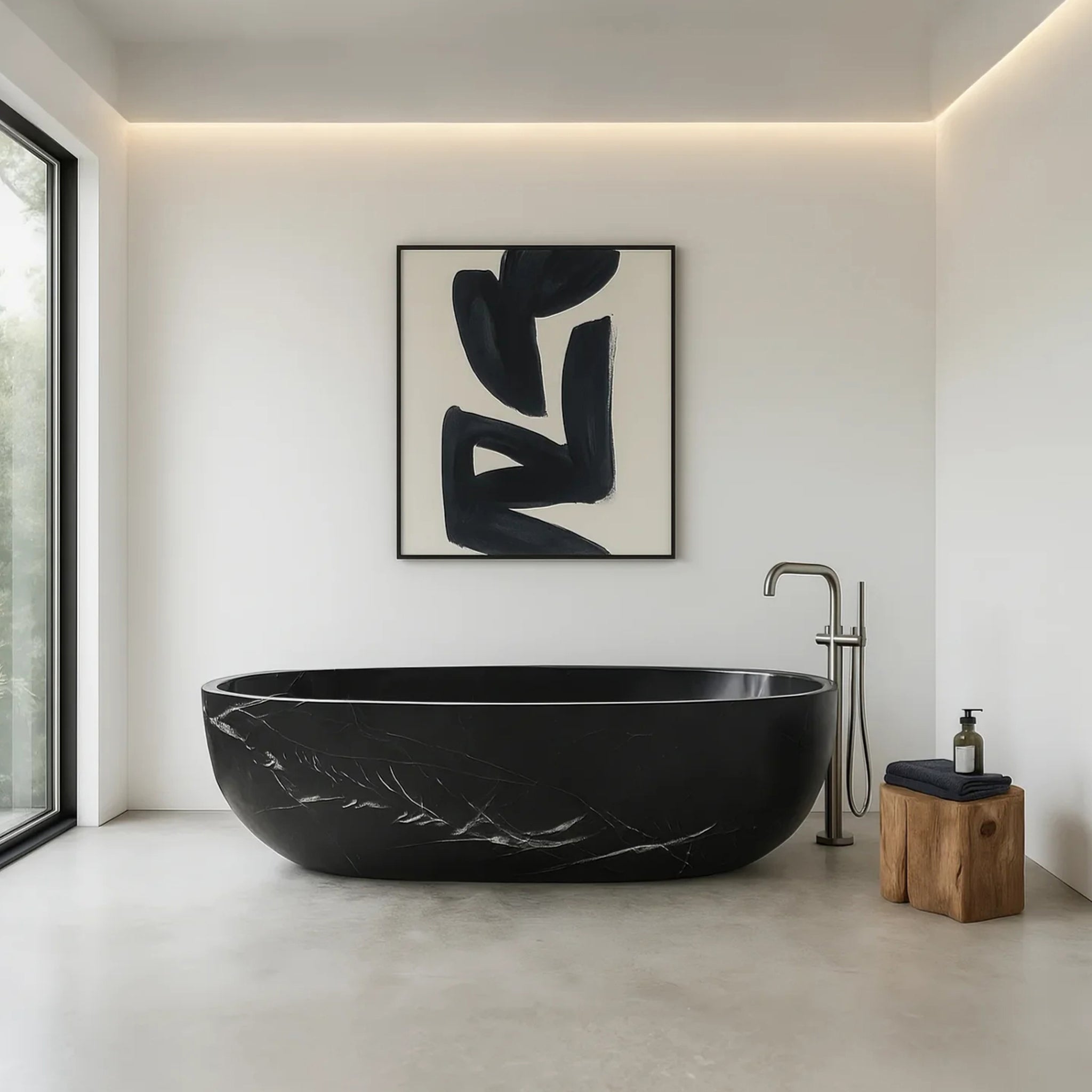 Upgrade your master bathroom with our elegant oval black marble bathtub, featuring stunning white veins and a perfect ergonomic design. This luxurious tub combines sophisticated style with exceptional comfort, creating a stunning centerpiece for your space. Indulge in a touch of modern elegance and relaxation.