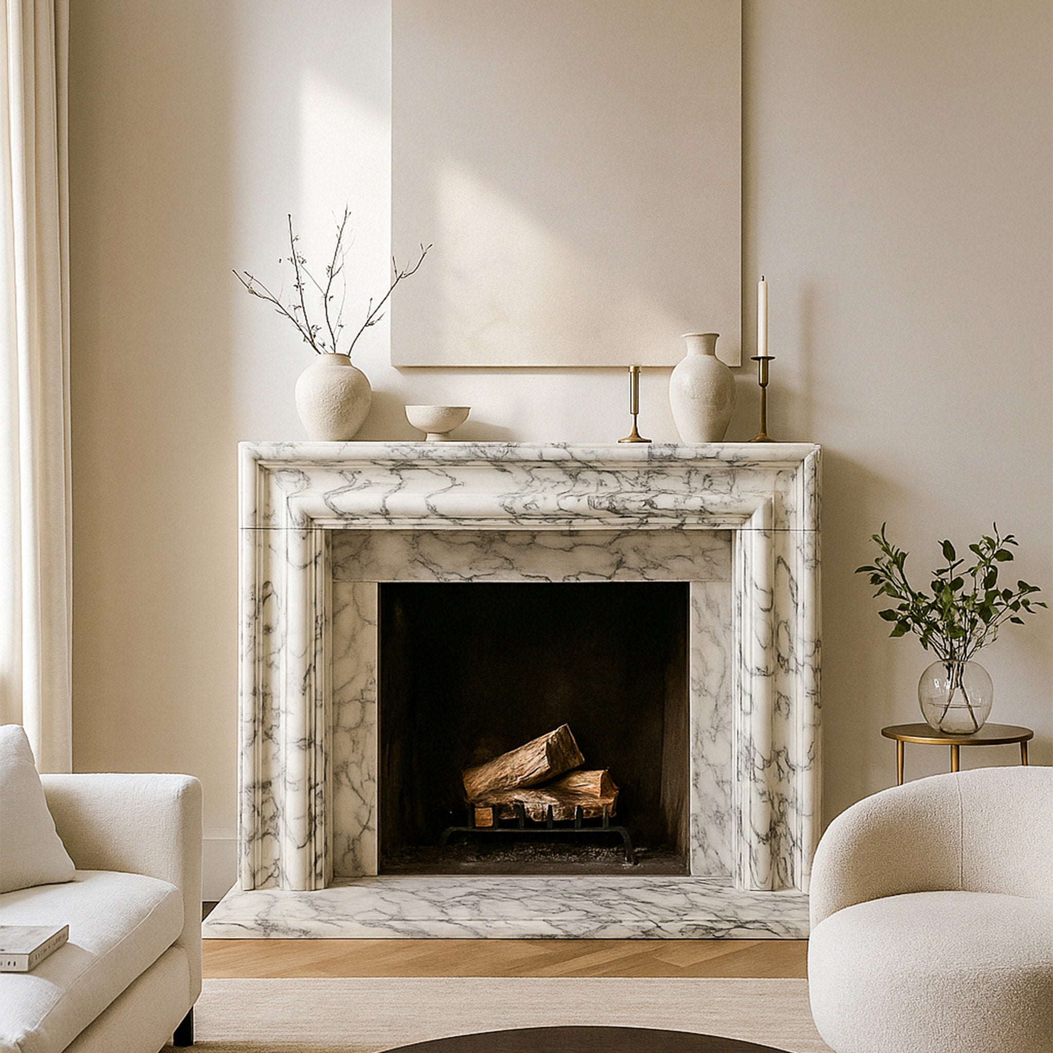 This sleek fireplace surround, crafted from beautifully veined white and grey marble, offers a modern yet timeless aesthetic. Its clean lines and unfussy design highlight the natural artistry of the stone itself. The rectangular frame features subtle, continuous fluting that adds texture and depth without ornate embellishment. This piece is perfect for contemporary or transitional spaces, providing a refined and understated elegance that allows the unique marble patterns to shine.