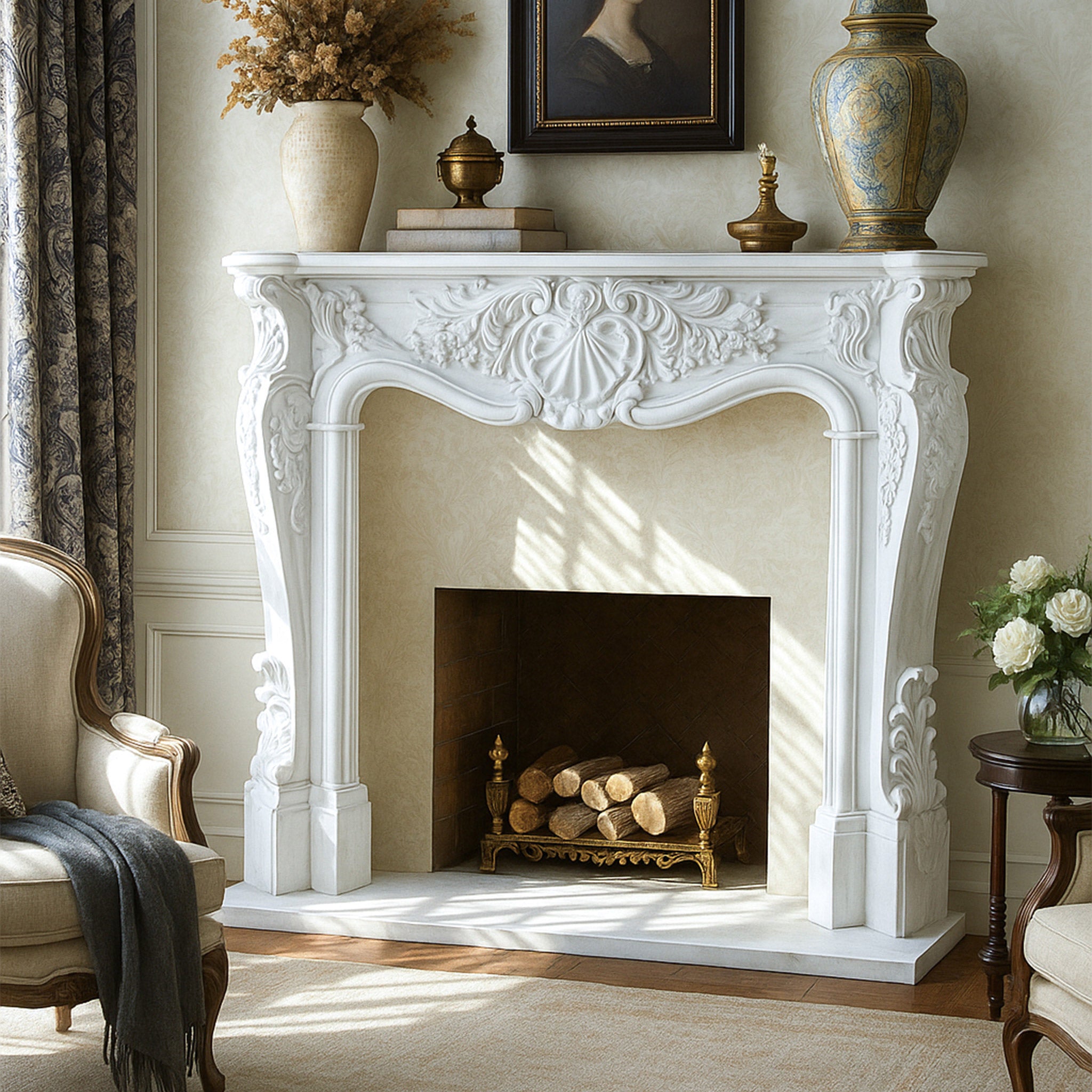 This exquisite fireplace mantel, crafted from luminous Moon White marble, epitomizes Rococo elegance. Its gracefully curved frieze features a central shell motif, flanked by cascading floral garlands and delicate scrolling foliage. The substantial, inwardly curving jambs are adorned with intricate carved details, including further floral accents and subtly fluted elements. Resting on a clean, matching hearth, this piece offers a sophisticated focal point, blending historical charm with timeless beauty, ideal for refined interiors.