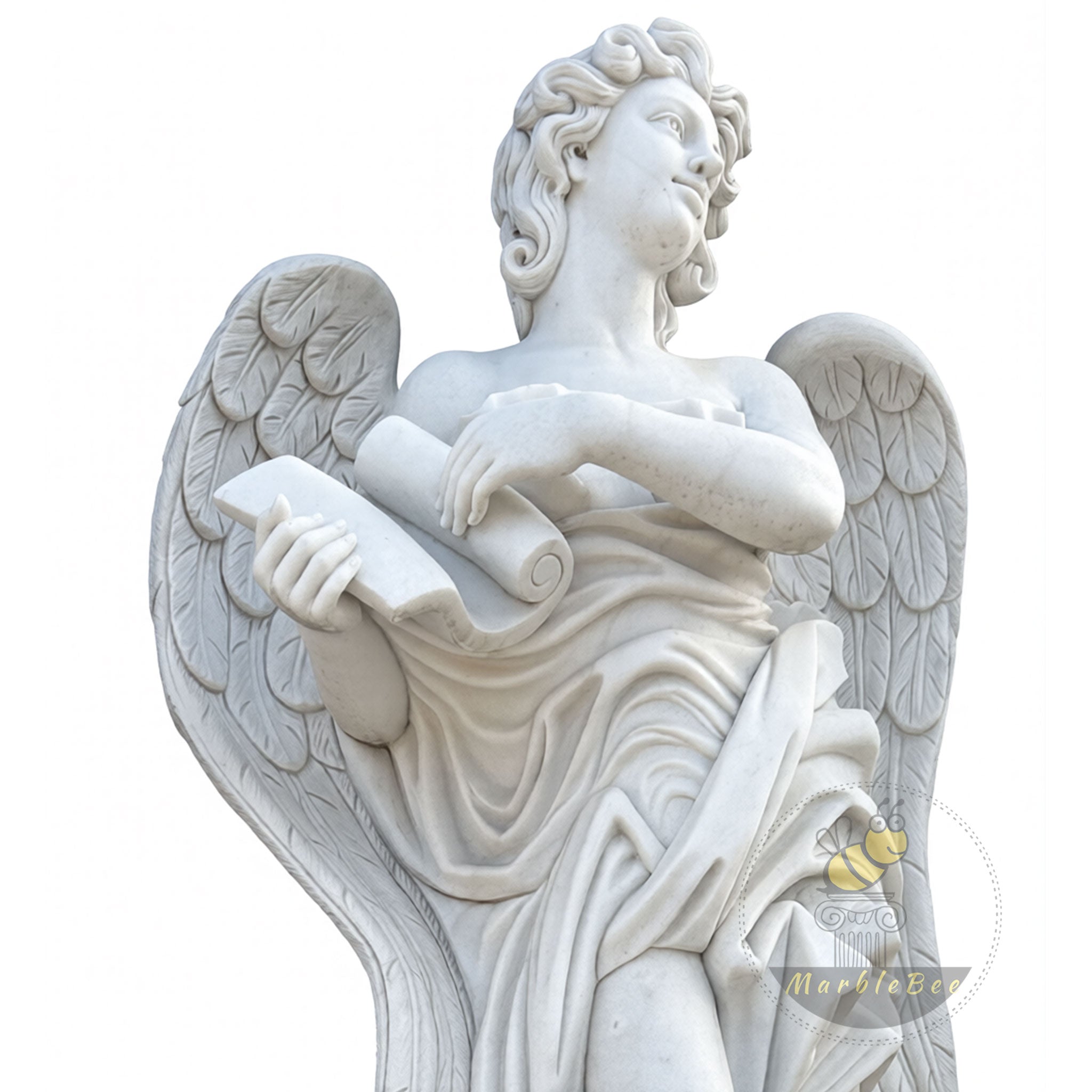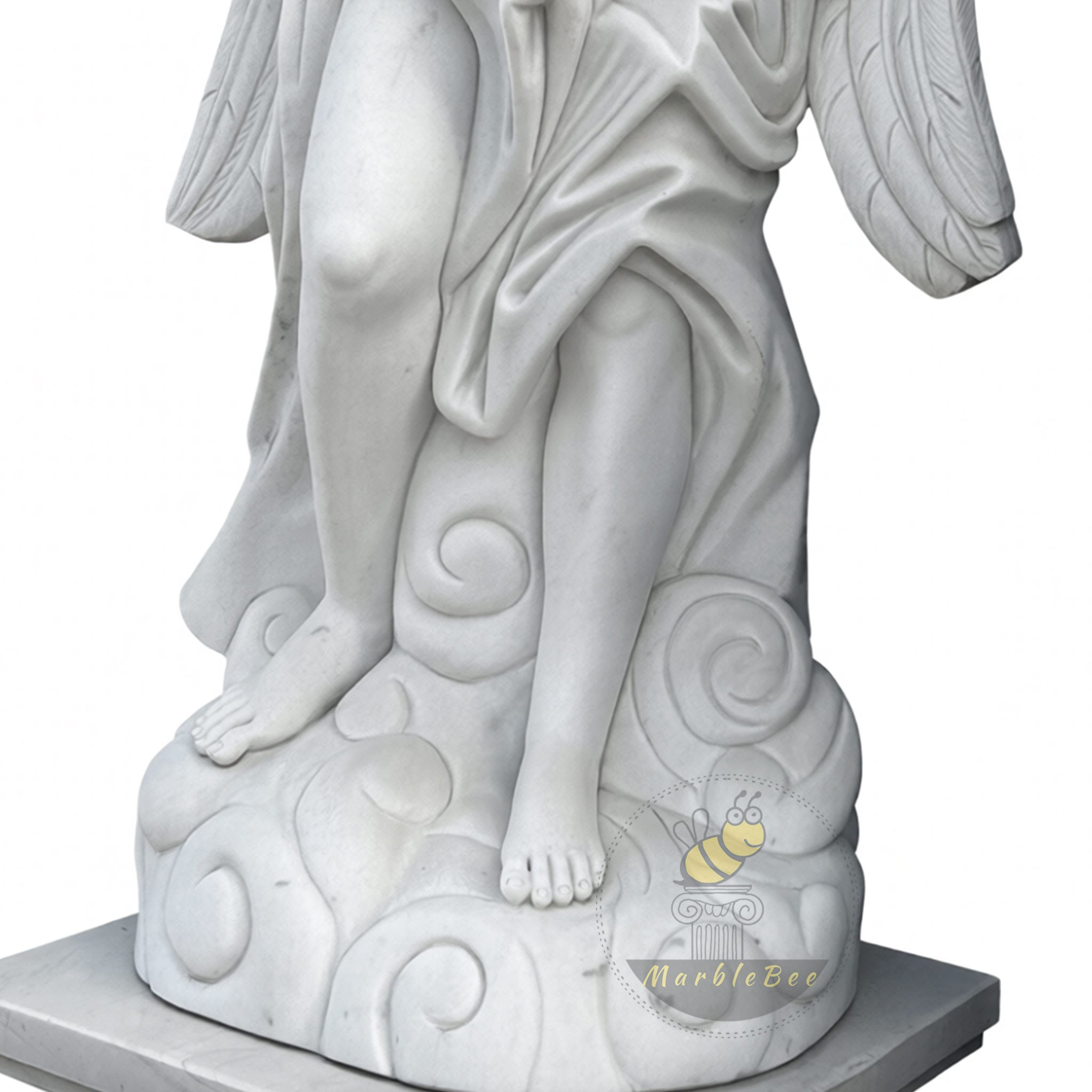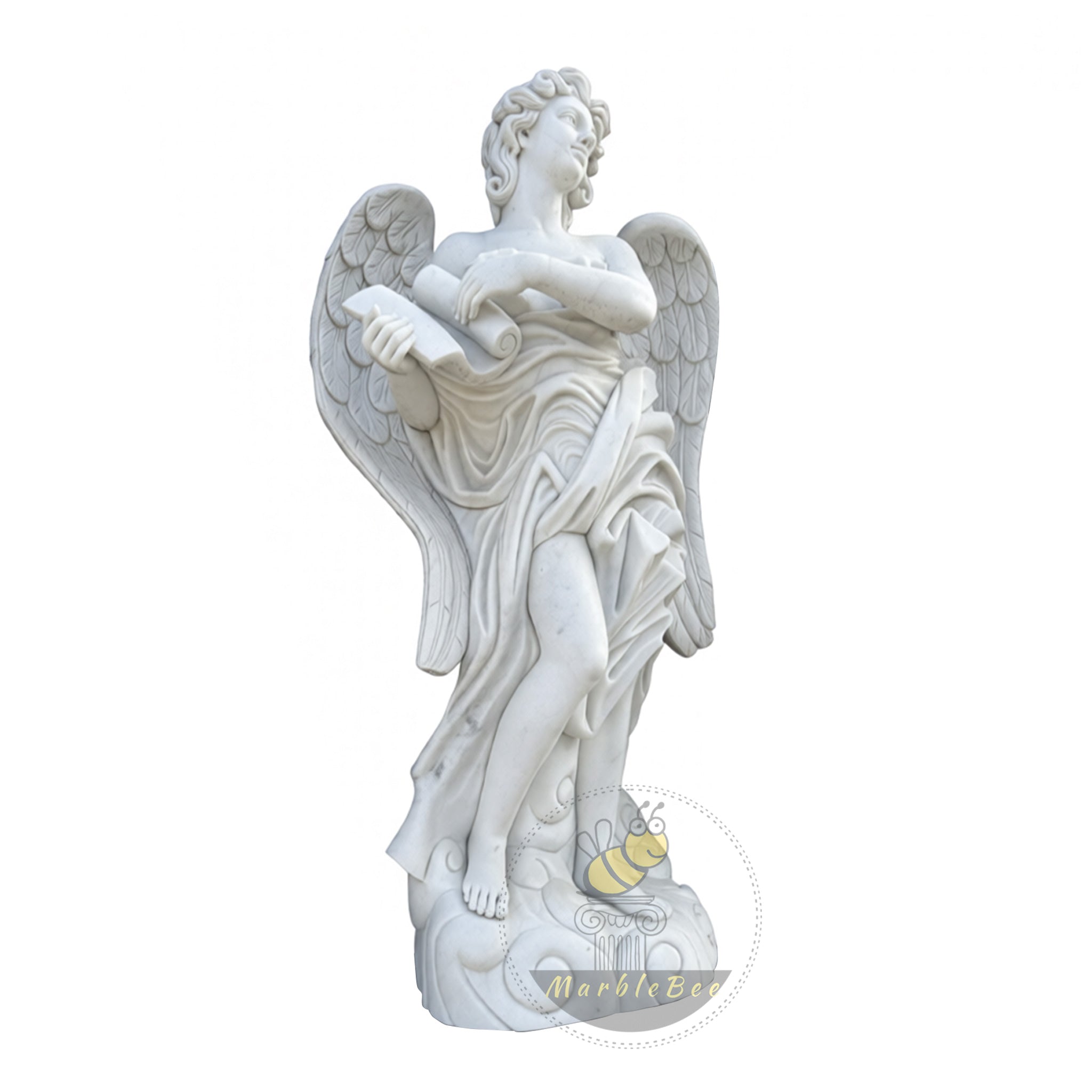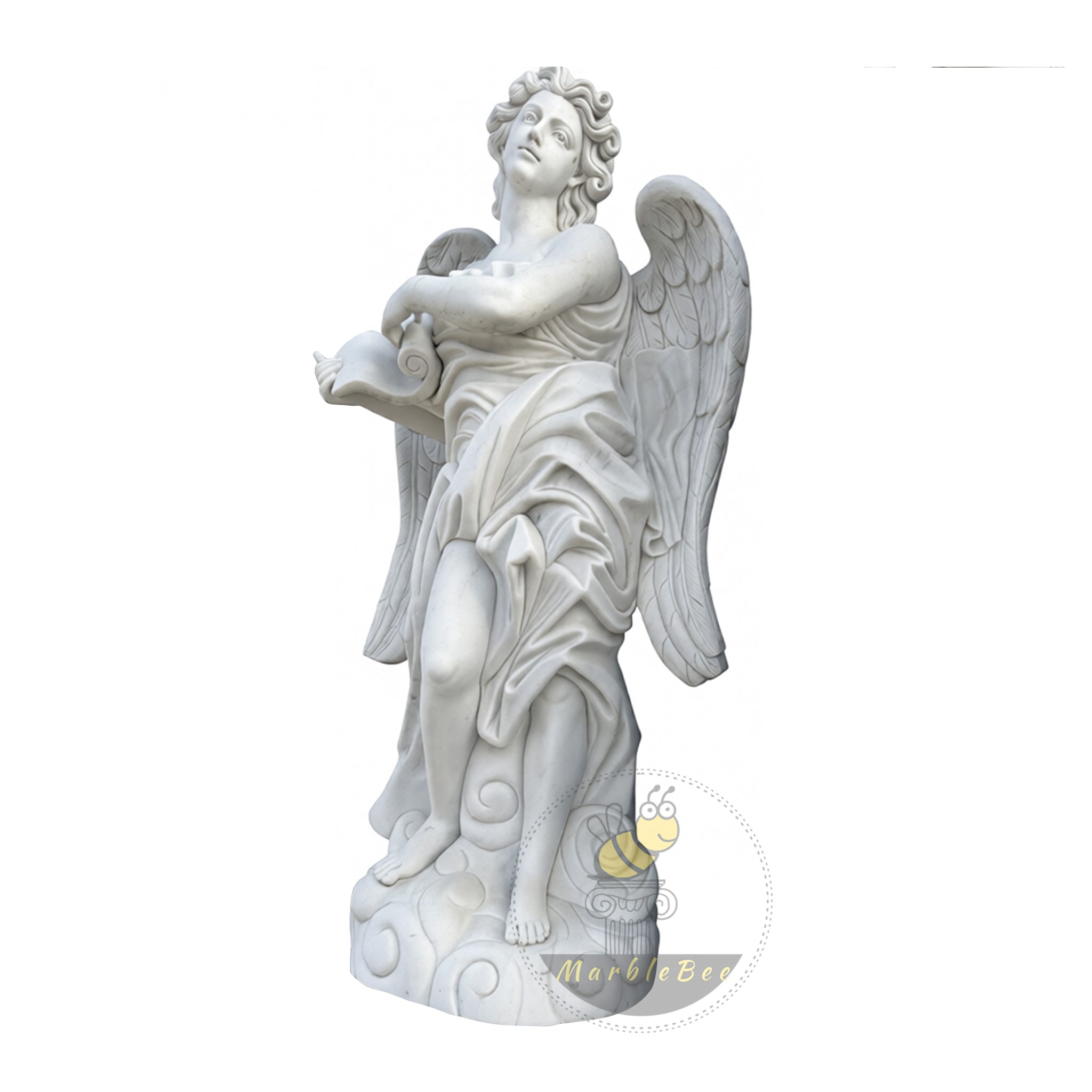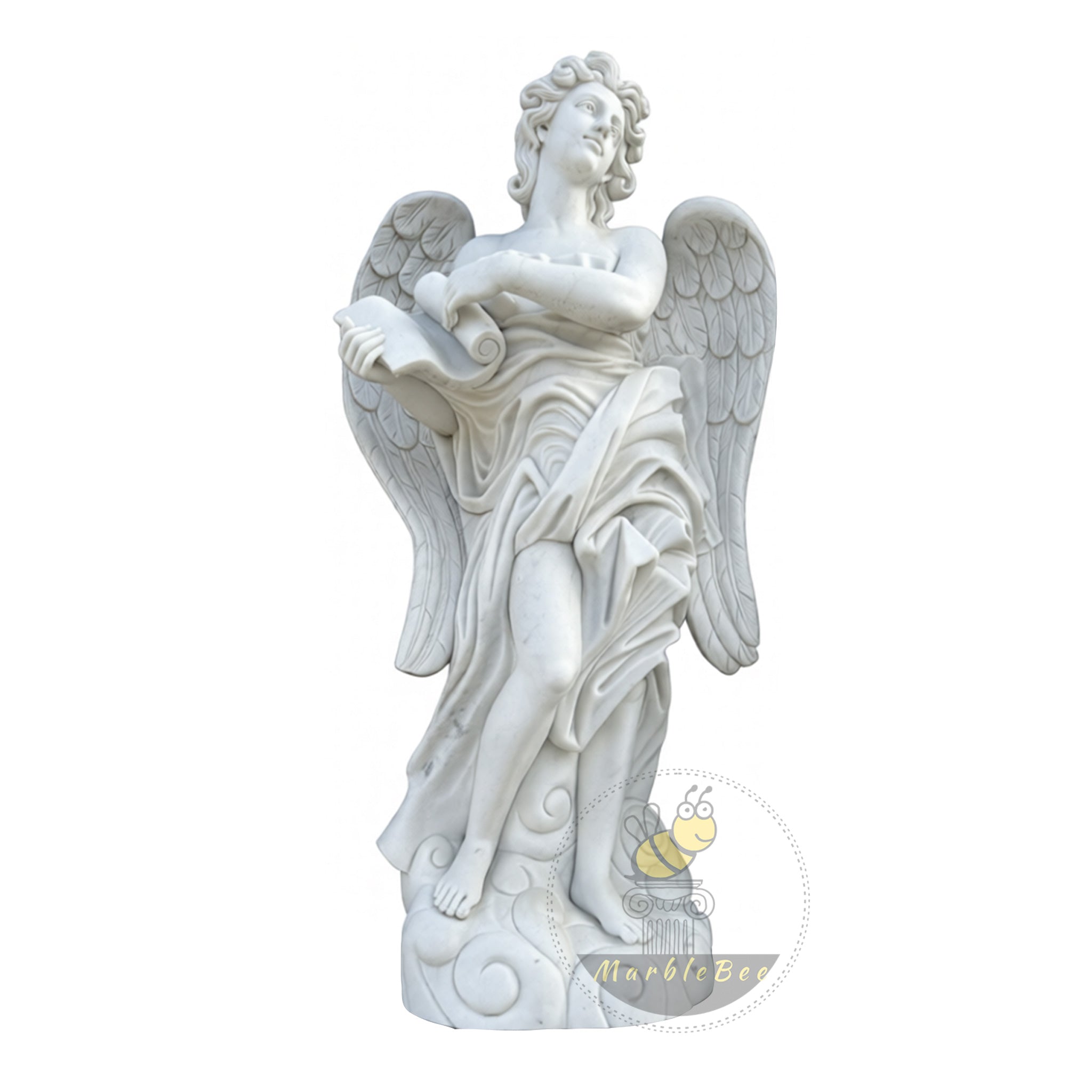 This marble sculpture for sale presents a poised white marble angel stepping lightly onto a cloud‑like base, bare toes emerging from swirling stone currents. Broad, feathered wings rise behind the figure, while a softly draped robe wraps around the torso and falls in layered folds over one extended leg. In both hands, the angel cradles an unfurled scroll, its curled end echoing the spirals of the base and suggesting a timeless message carved in stone.