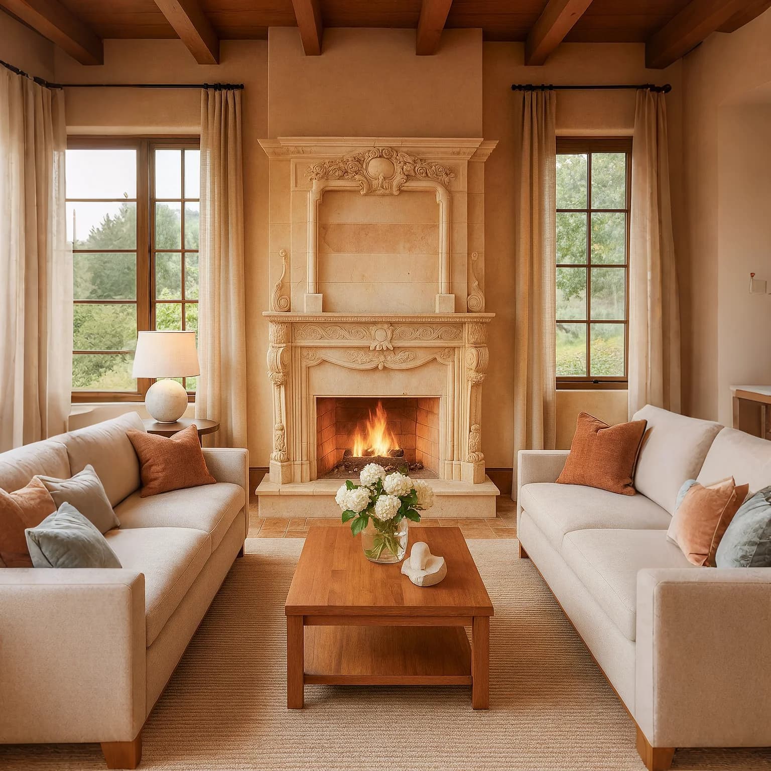 Admire the uniqueness of Custom Marble Fireplace Surround, crafted from Beige Travertine. Its hand-carved floral designs and sturdy frame offer a personalized touch. The warm beige tone ensures lasting elegance.