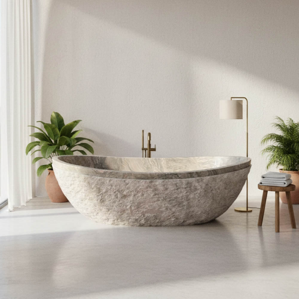 Experience the pinnacle of natural design with this freestanding tub, carved from Verde Rosato Imperiale marble. It features a stunning, hand-chiseled raw exterior that contrasts beautifully with its smooth, polished interior basin and rim. The stone's surface is a captivating swirl of soft rose and deep greys. Among luxury tubs, this piece is a true work of art, measuring 70.08" L x 33.07" W x 24.02" H. It is a perfect fusion of rustic texture and refined elegance.