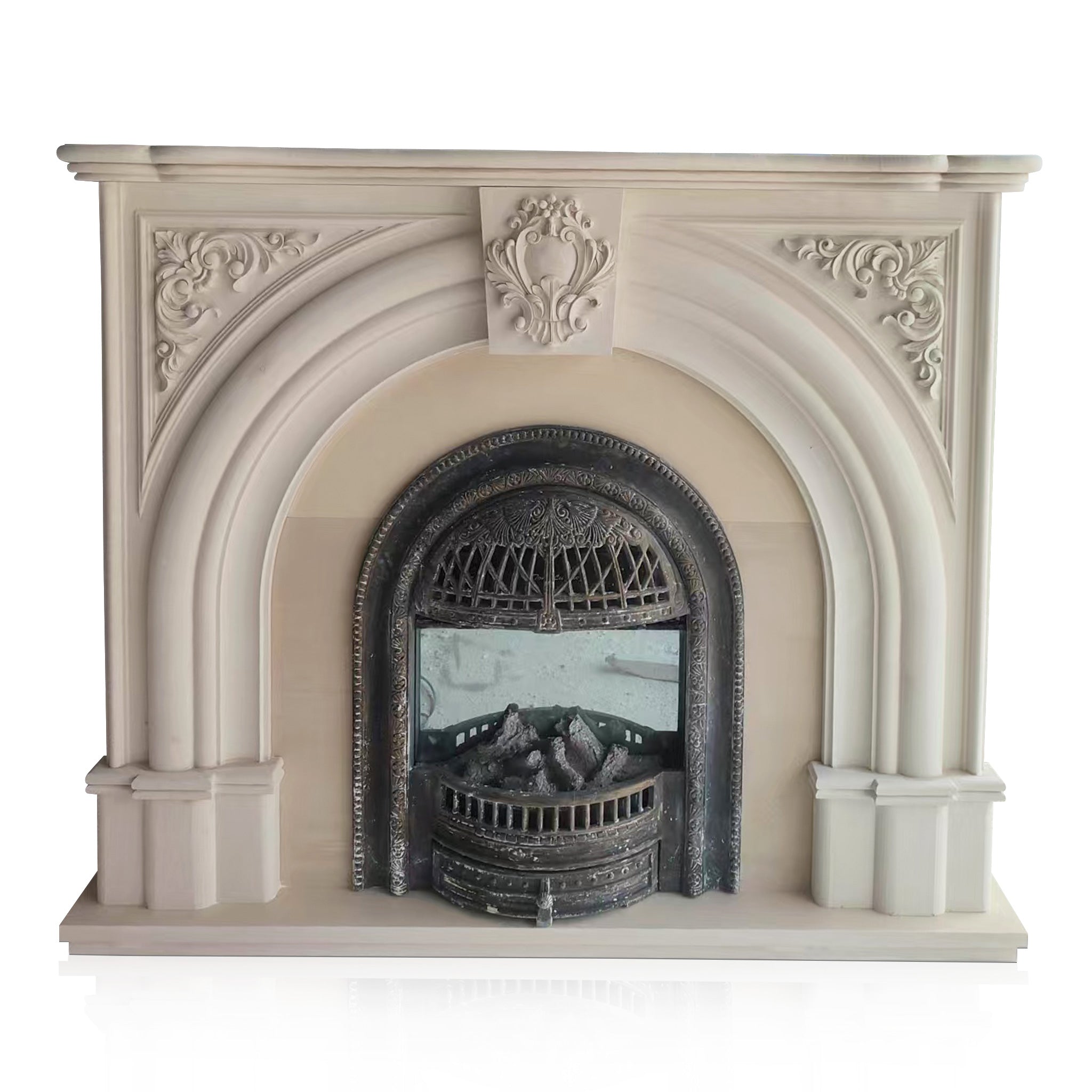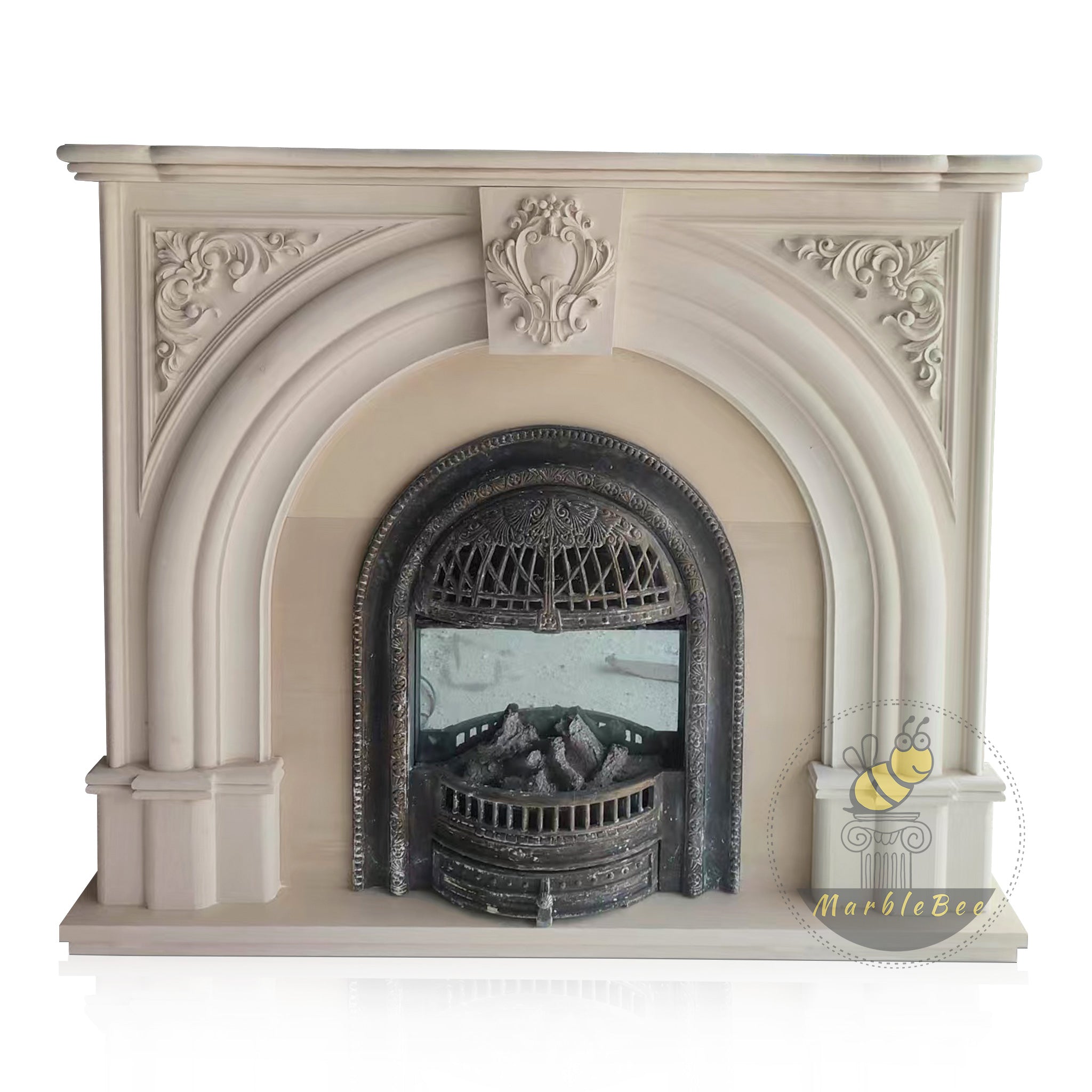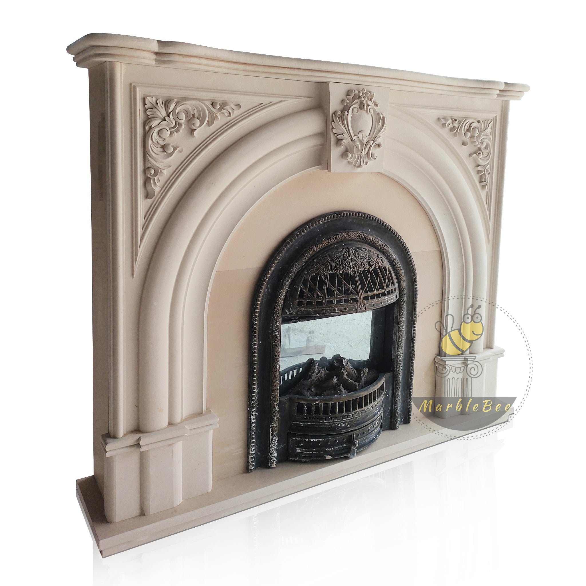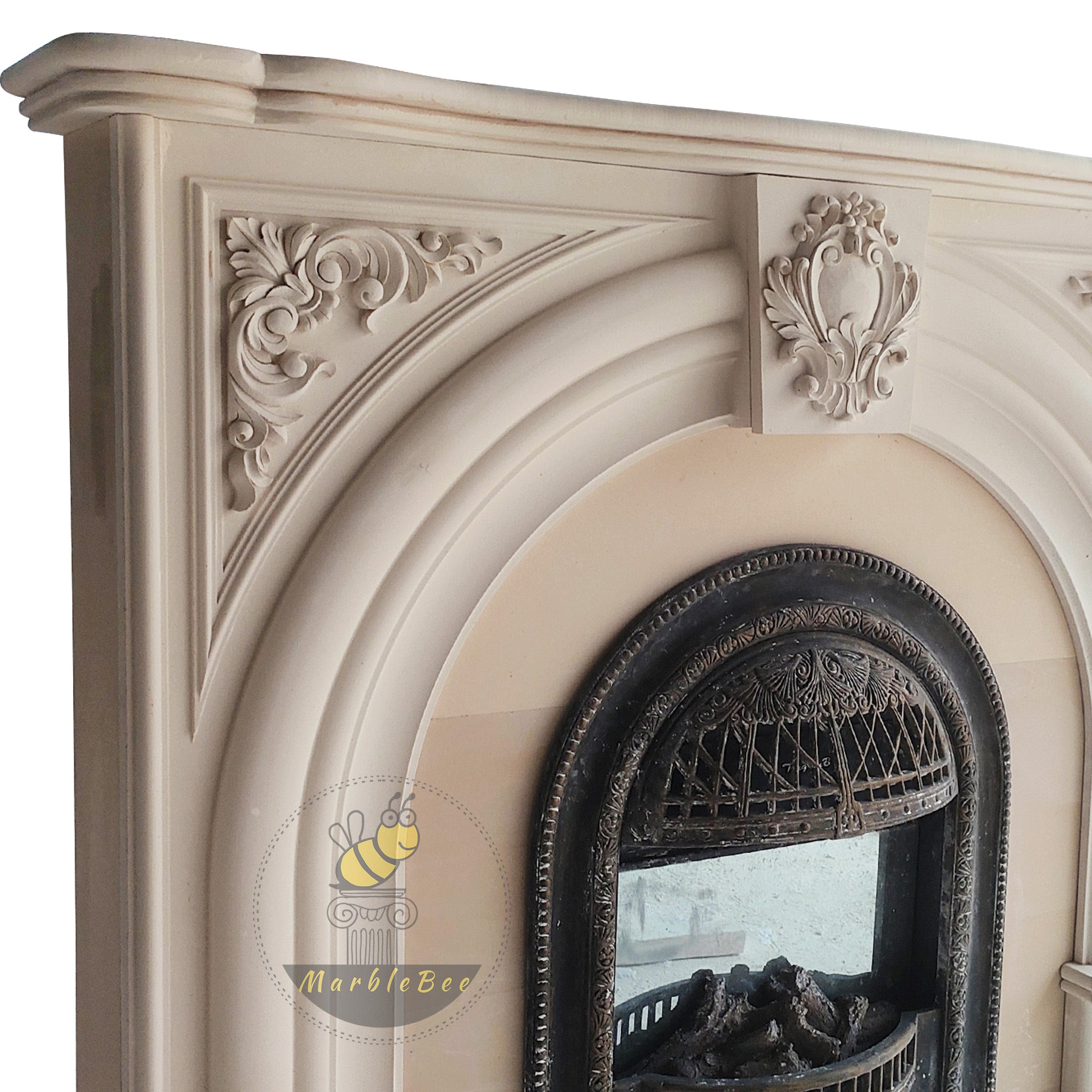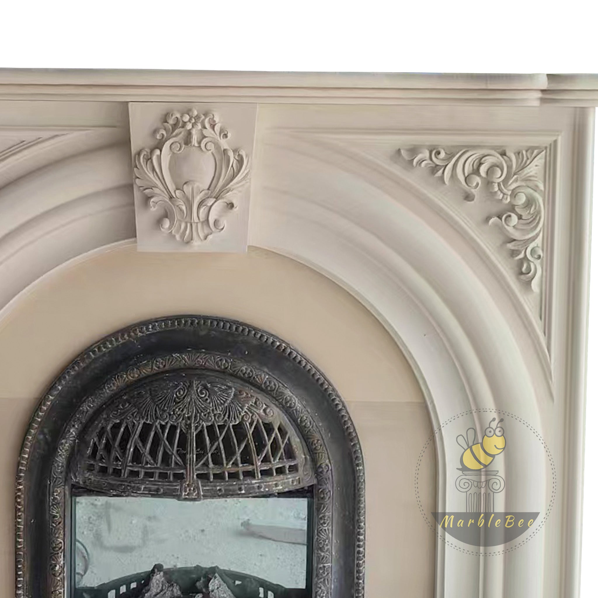 This distinguished fireplace mantel, crafted from warm-toned Portugal Beige marble, exudes timeless elegance. It features a beautifully sculpted arch above the firebox opening, flanked by deep, fluted pilasters that provide architectural grace. The frieze is adorned with a central cartouche flanked by delicate scrolling acanthus leaves, while the spandrels boast further intricate floral carvings. This piece offers a sophisticated and inviting focal point, perfect for both traditional and transitional interiors, highlighting the natural beauty of the marble.