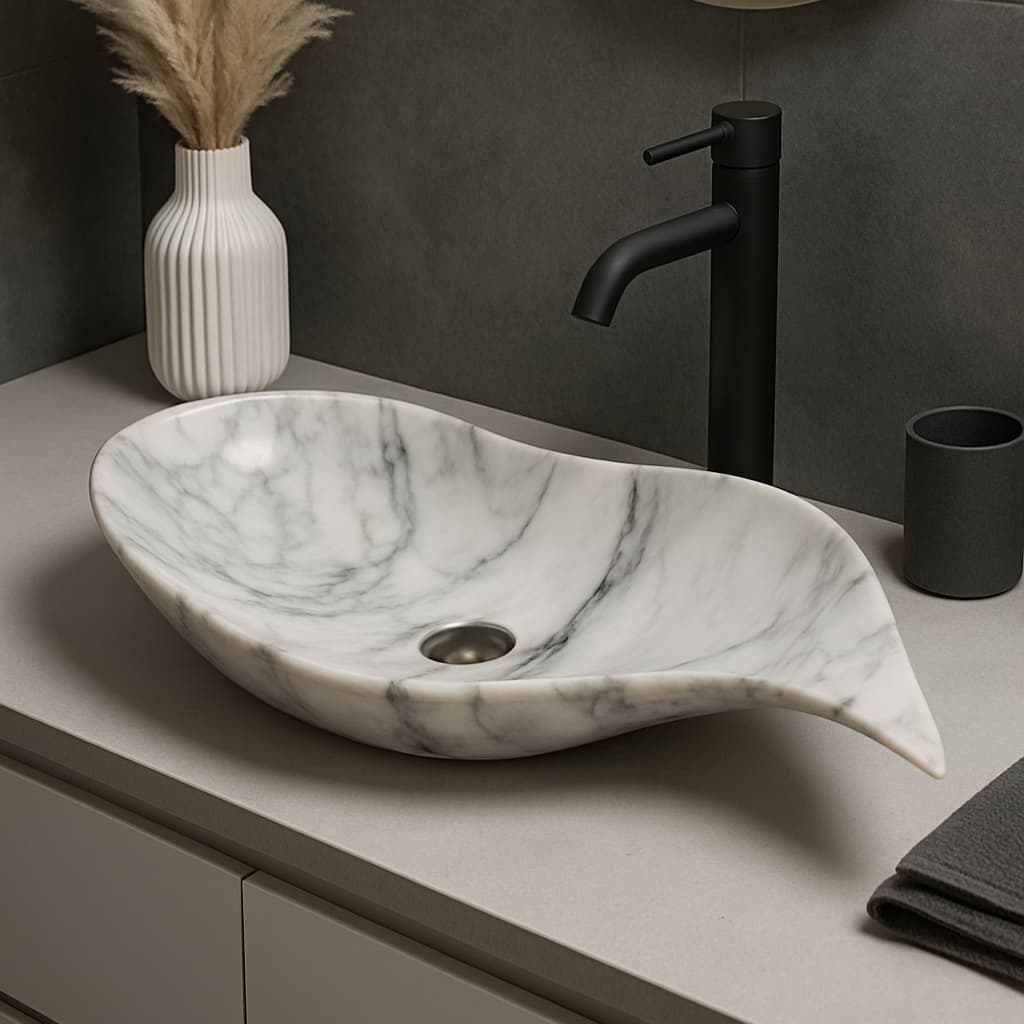 يضيف شكل القطرة الأنيق لهذا الحوض لمسة فنية ورشيقة إلى ديكور حمامك. تخلق الخطوط الناعمة والمنحنية للتصميم إحساسًا بالسيولة والرقي. تخلق أنماط الرخام الرمادي المذهلة على السطح الأبيض تباينًا آسرًا بصريًا، مما يجعلها نقطة محورية تلفت الأنظار دون عناء.