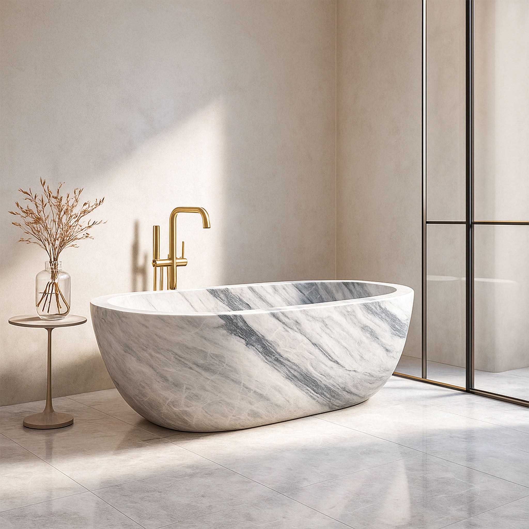 Discover tranquility with this exquisite soaking tub, hand-carved from a single block of luxurious Italian Bianco Azzurro. The stone’s surface is a masterpiece of nature, featuring serene, flowing waves of deep grey and black against a soft white background. Its unique, ergonomic shape is designed for ultimate comfort. Sized at 68.50" L x 31.89" W x 22.44" H, this beautiful white marble bath is a sublime centerpiece that transforms your bathroom into a haven of sophisticated, spa-like relaxation.