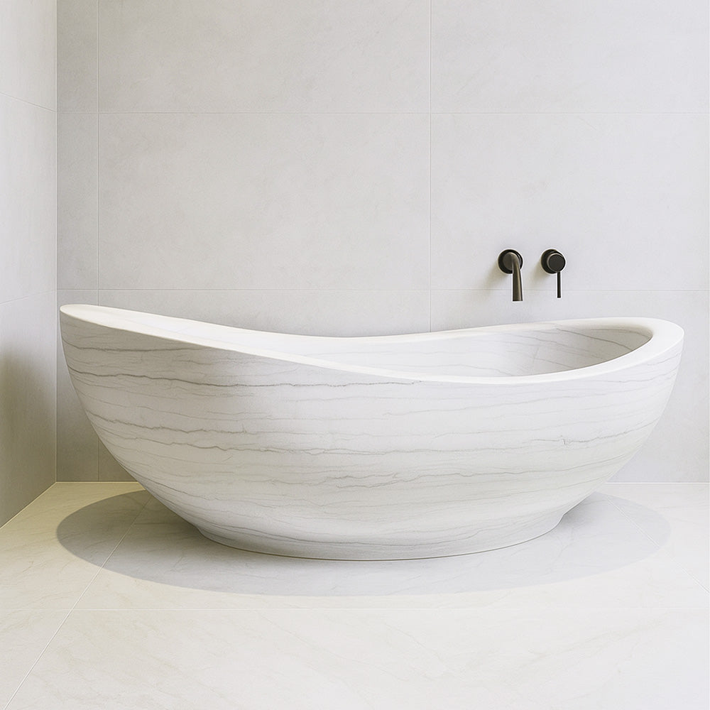 This exquisite Cloudline White Marble bathtub is a masterpiece crafted from natural stone. Its pristine white surface and elegant design make it a magnificent centerpiece for any bathroom. This tub is perfect for creating a spa-like retreat or enhancing a contemporary aesthetic, offering a serene and luxurious bathing experience.