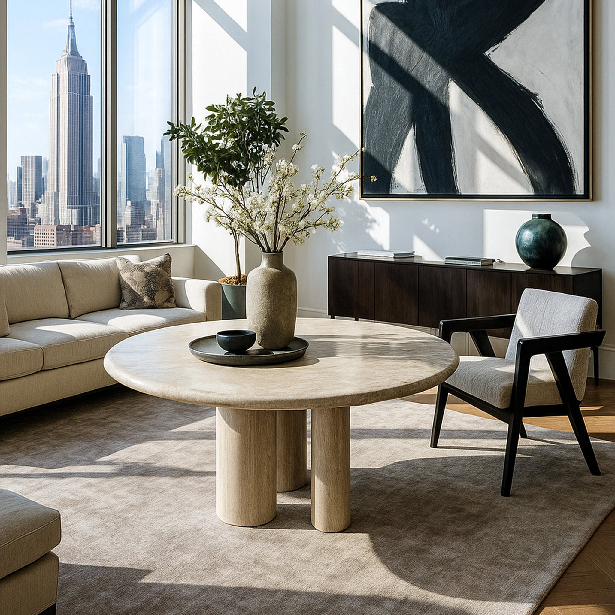 Your living room’s new flex. This marble cocktail table isn’t just a pretty face—it’s pure silver travertine, top to base, with metallic veining that sparkles in sunlight or under mood lighting. Perfect for holding drinks, books, or your dog’s trophy collection. In stock now with free delivery—because your Netflix nights deserve a glow-up.