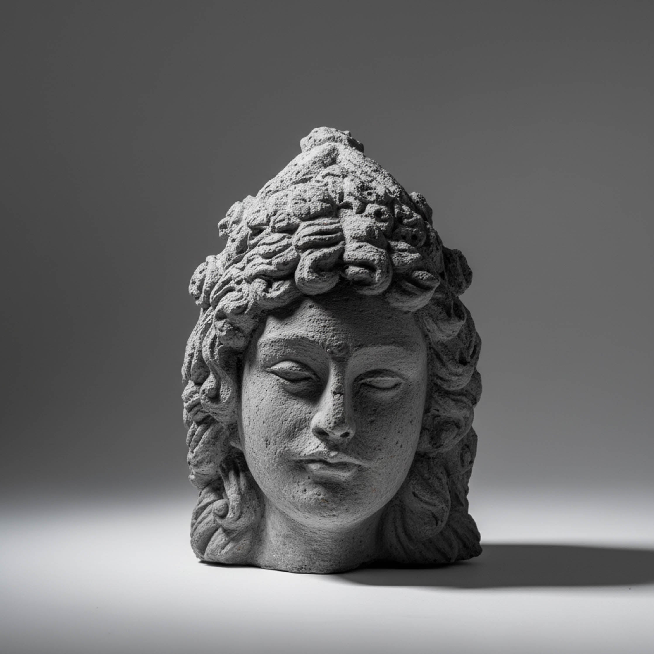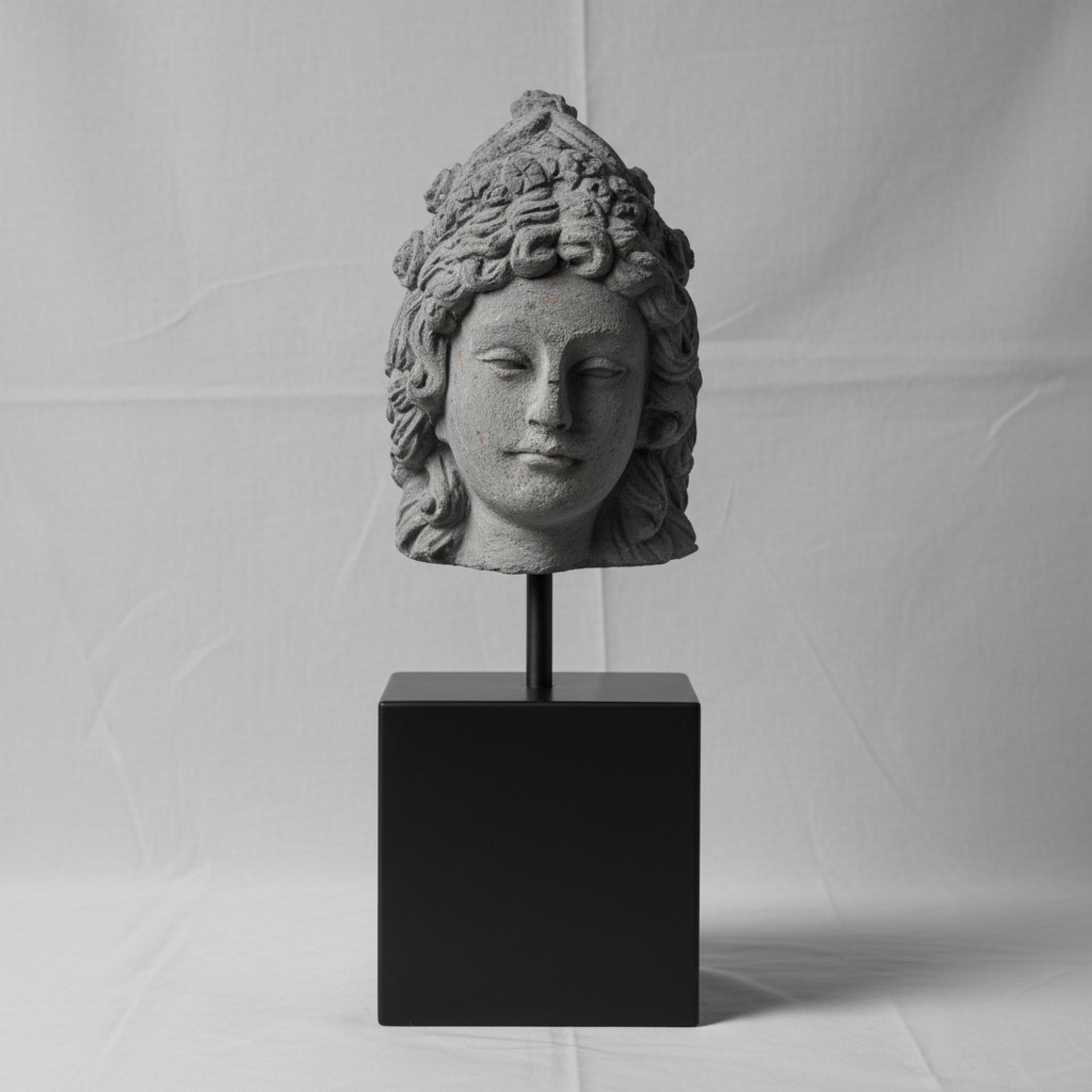 Carved from enduring black limestone, this sculpture captures the soft, radiant features of a youthful Bodhisattva. The face is framed by a remarkable crown of dense, rhythmic curls and an intricate floral diadem, showcasing the unique artistic fusion of ancient Gandhara. Its lowered gaze and subtle smile evoke a deep sense of compassion and internal quietude. The natural charcoal-grey patina of the stone highlights every hand-chiseled detail, transforming this fragment of divinity into a grounding focal point for any space dedicated to peace and reflection.