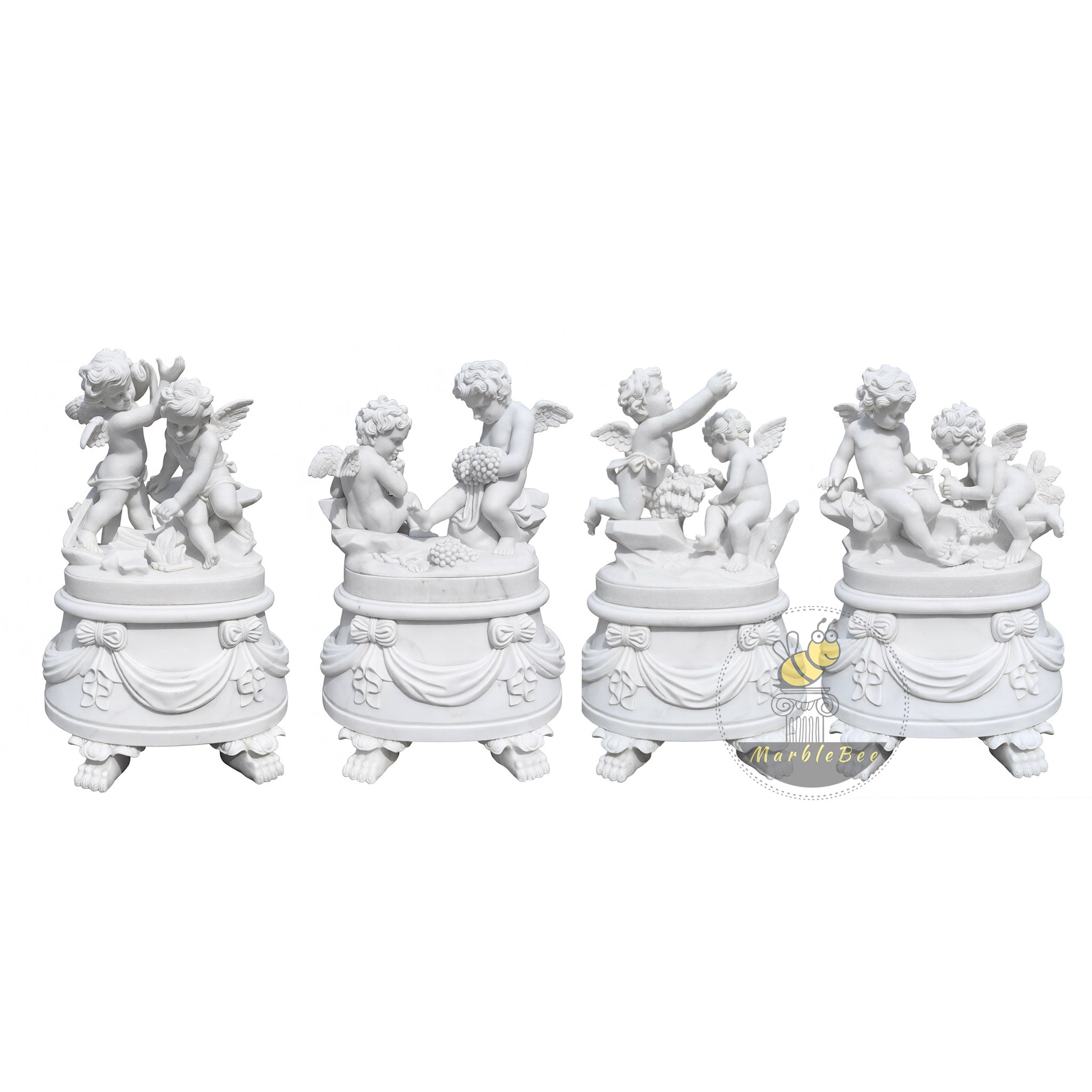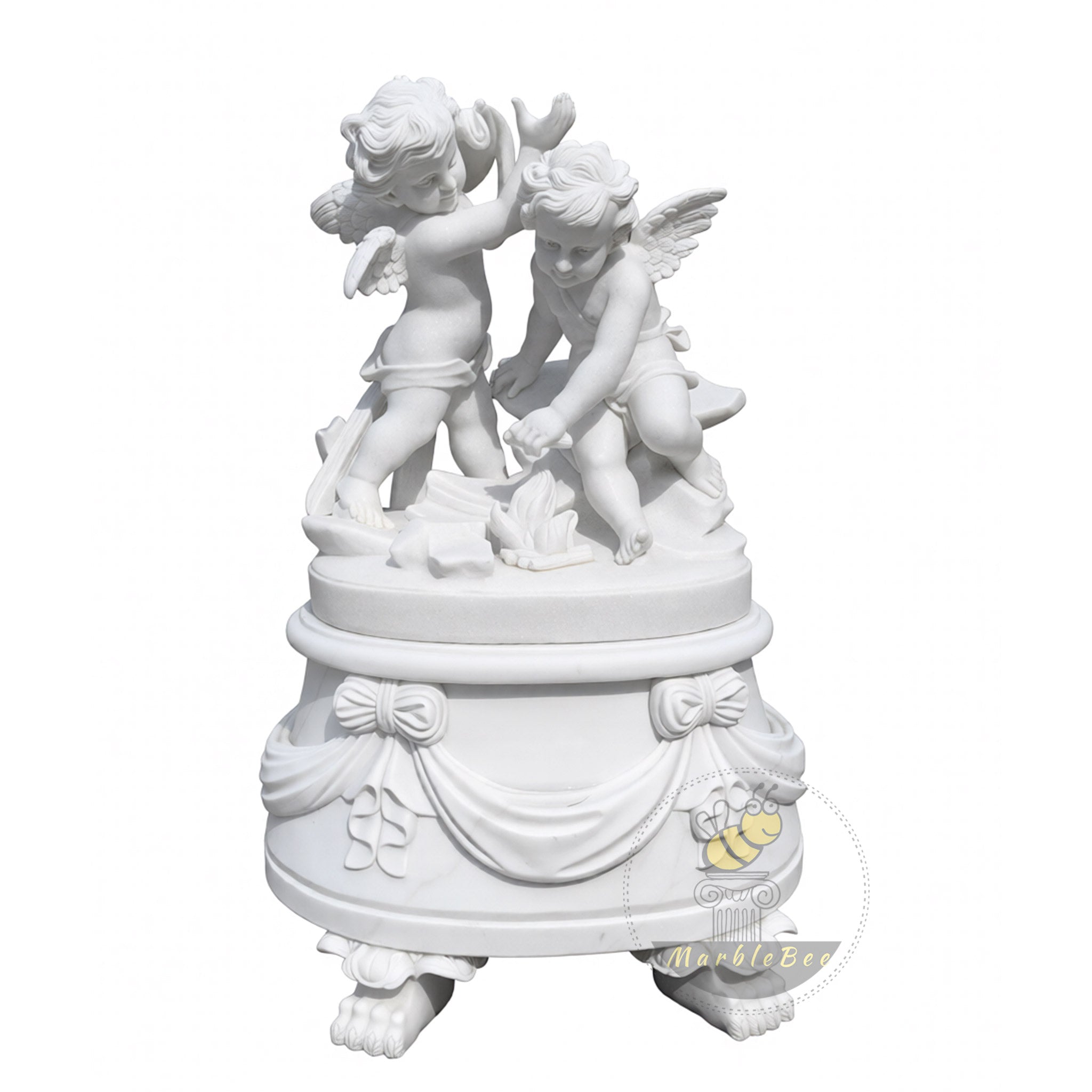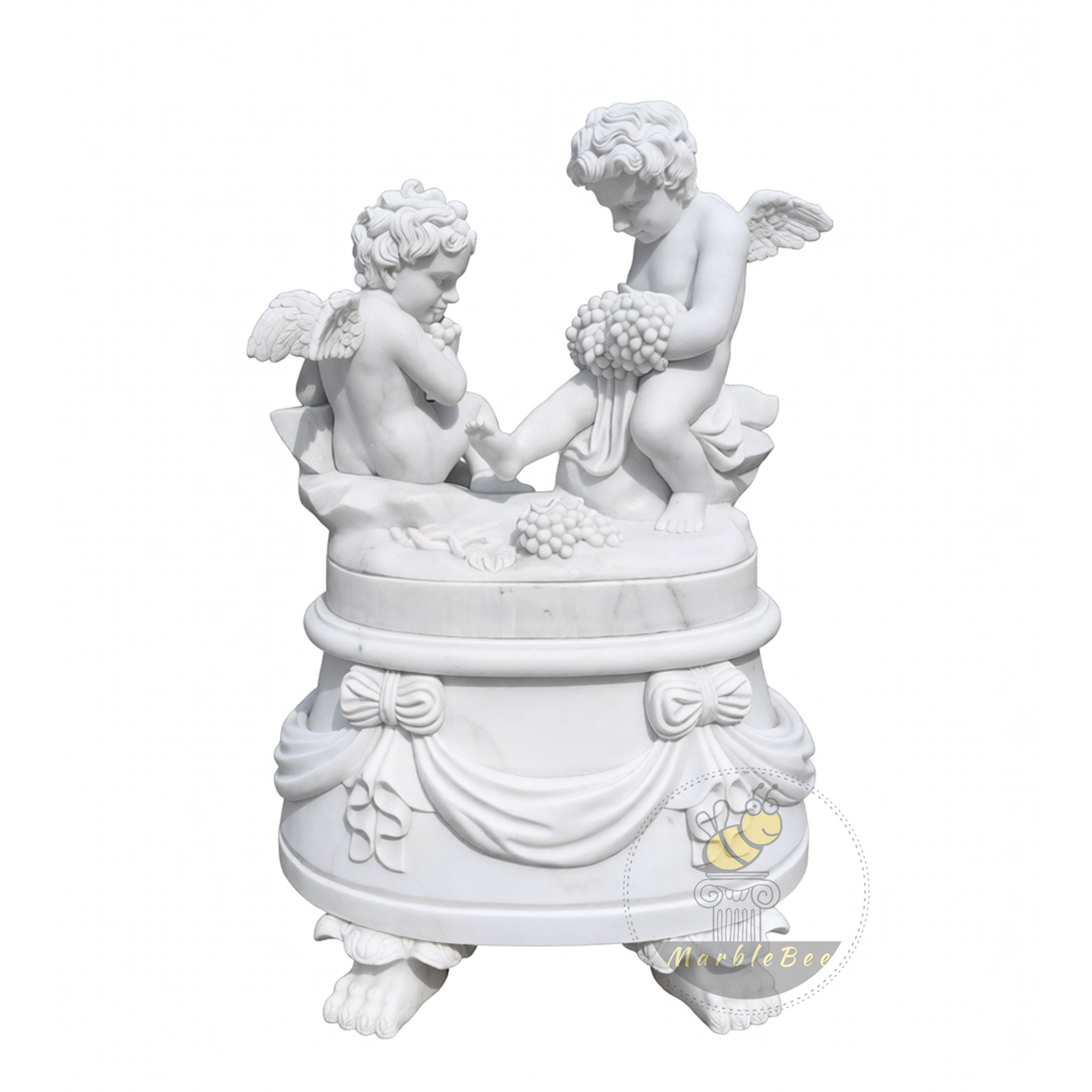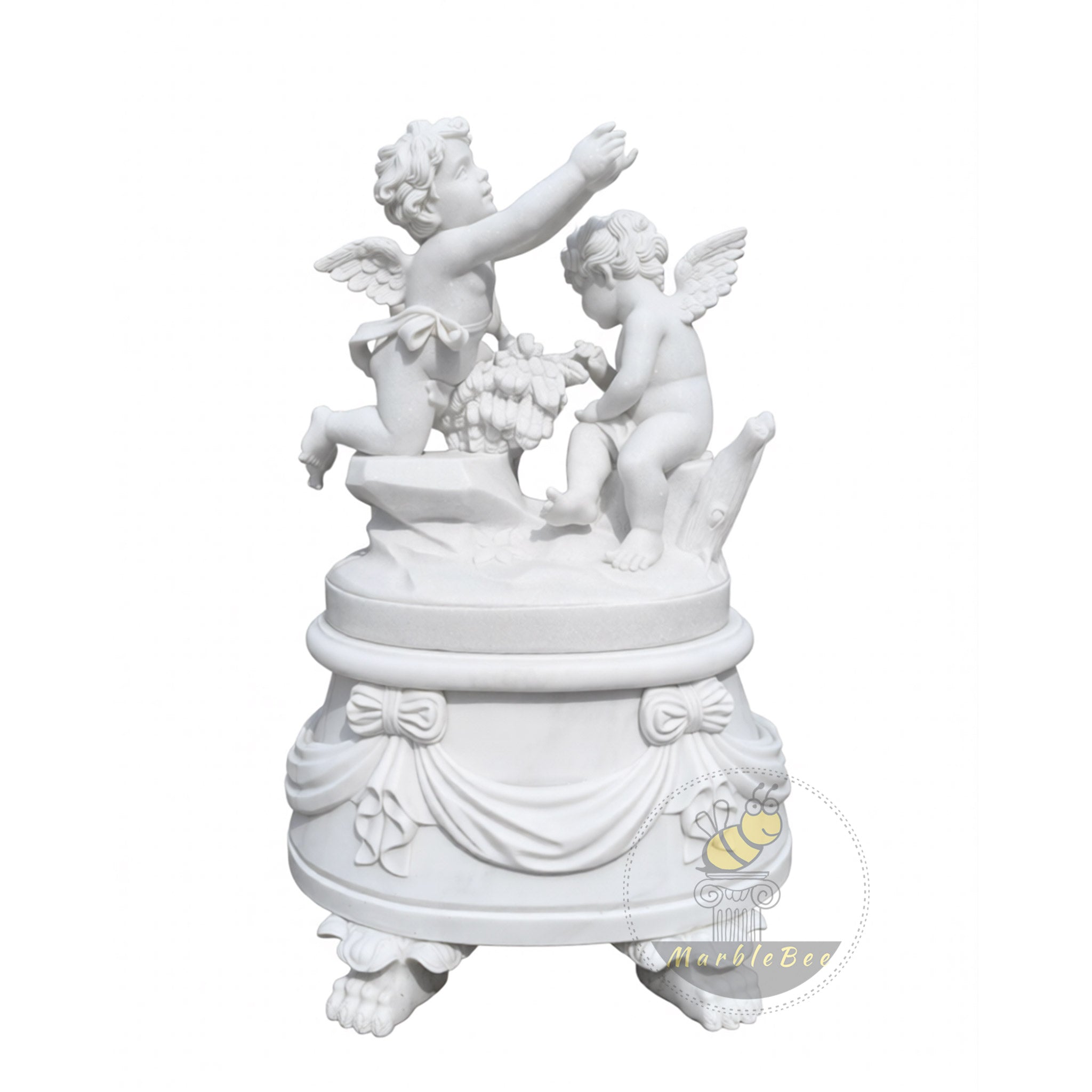 This marble statues for sale design features two playful cherubs perched atop an oval pedestal, caught in a moment of shared mischief and laughter. Their tiny wings, curled hair, and rounded limbs are rendered with soft realism, while scattered fruit and drapery at their feet add storytelling detail. The pedestal itself is wrapped with carved swags and bows, resting on four paw-like feet that give the piece a regal yet whimsical stance. Crafted in pure white marble, this charming statue pair brightens garden corners, entry consoles, or luxury nursery spaces.
