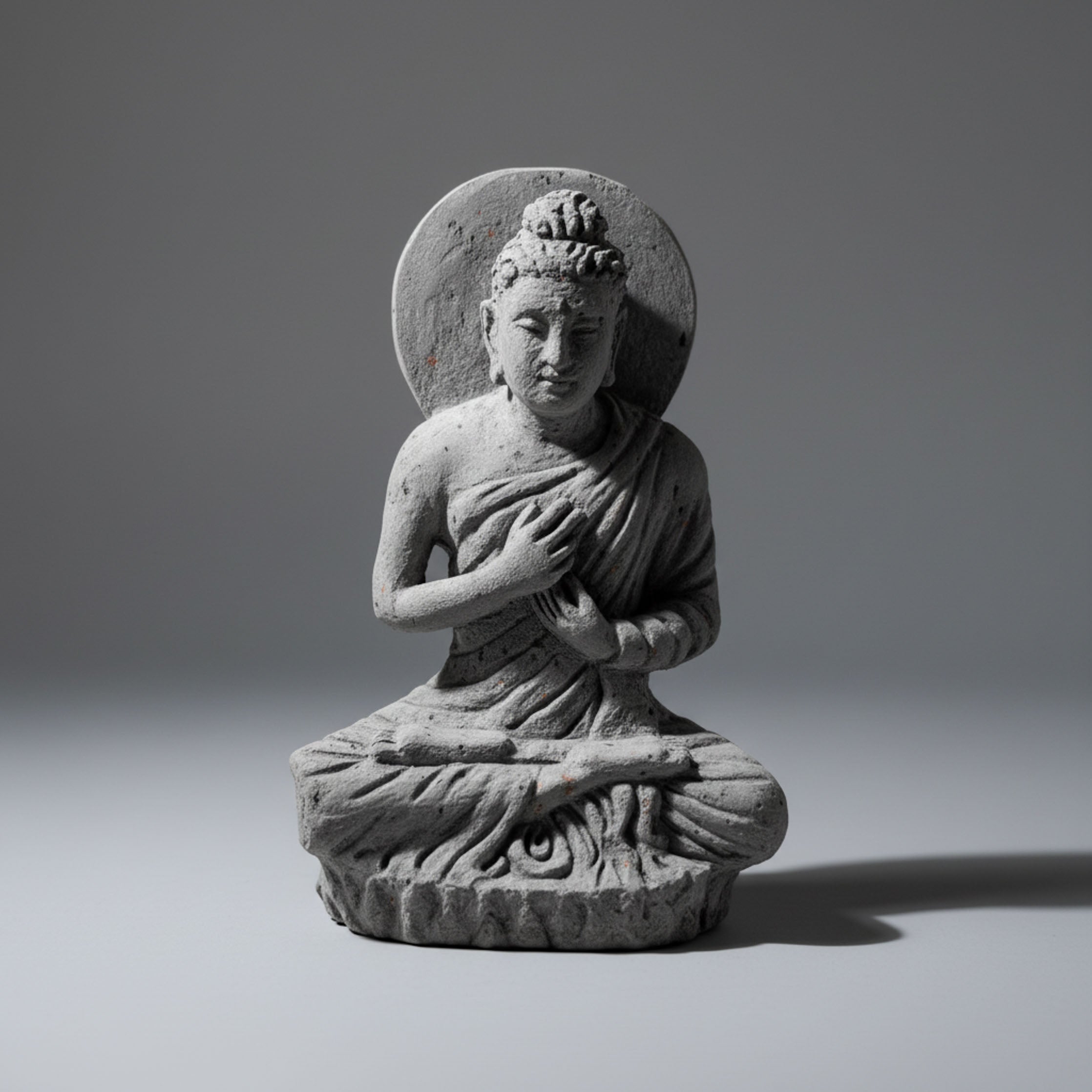 Carved from solid black limestone, this compact sculpture captures the Buddha in the eternal gesture of instruction. The figure sits in deep composure atop a detailed lotus throne, with hands poised in the Dharmachakra Mudra to symbolize the sharing of spiritual law. The weathered, charcoal-grey surface of the stone lends an air of ancient permanence to the piece, while the smooth contours of the halo provide a striking visual frame. This small yet powerful icon serves as a quiet reminder of wisdom, ideal for a personal altar or a contemplative corner of a study