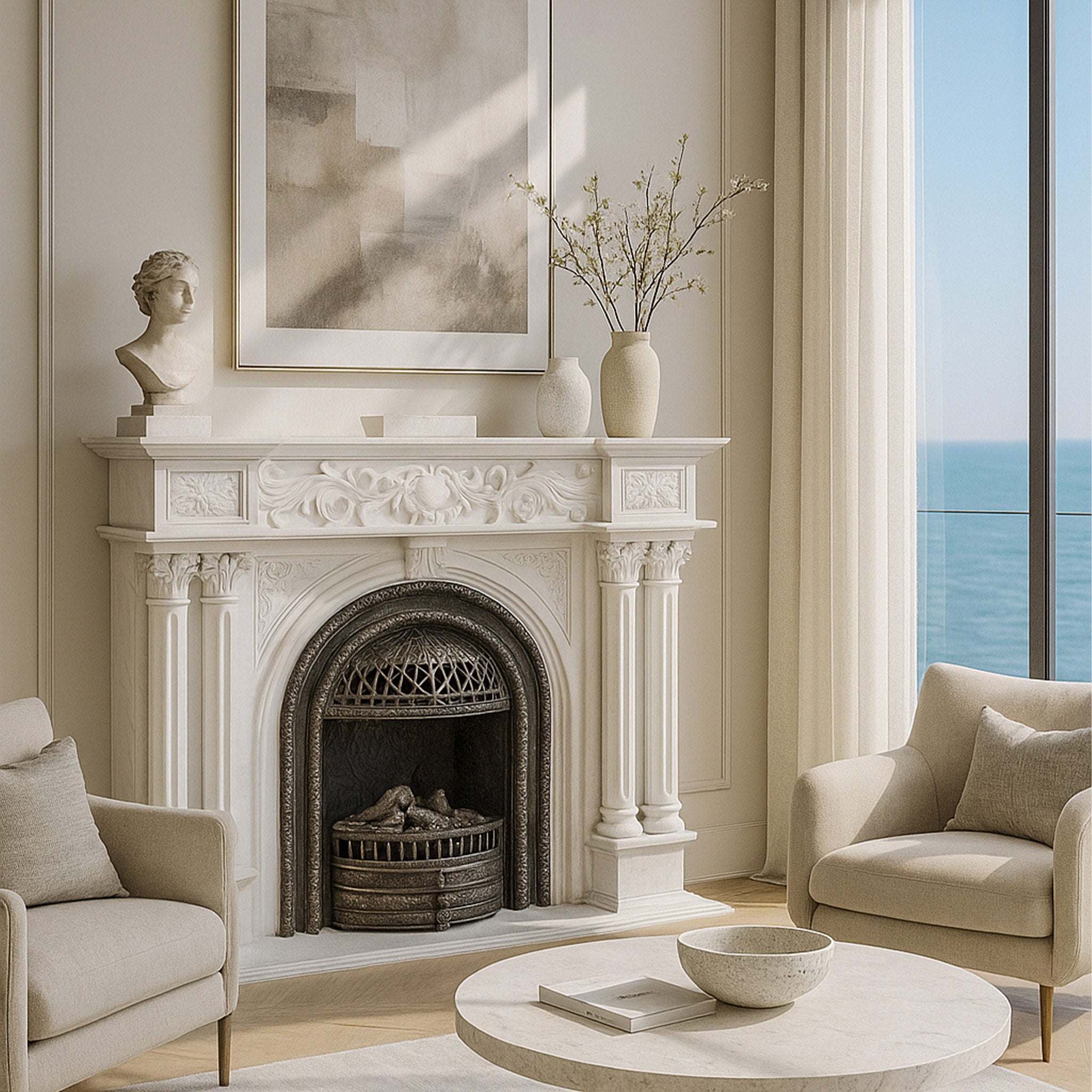This magnificent Moon White marble fireplace mantel offers a pristine, luxurious aesthetic. The frieze is richly carved with a central circular motif flanked by graceful acanthus scrolls, and framed by square floral paterae on the end blocks. An elegant arch, adorned with delicate spandrel carvings, frames the firebox opening. Supporting this grand structure are finely fluted columns with ornate capitals, culminating in a fireplace that embodies classical grandeur and exquisite artisanal craftsmanship.