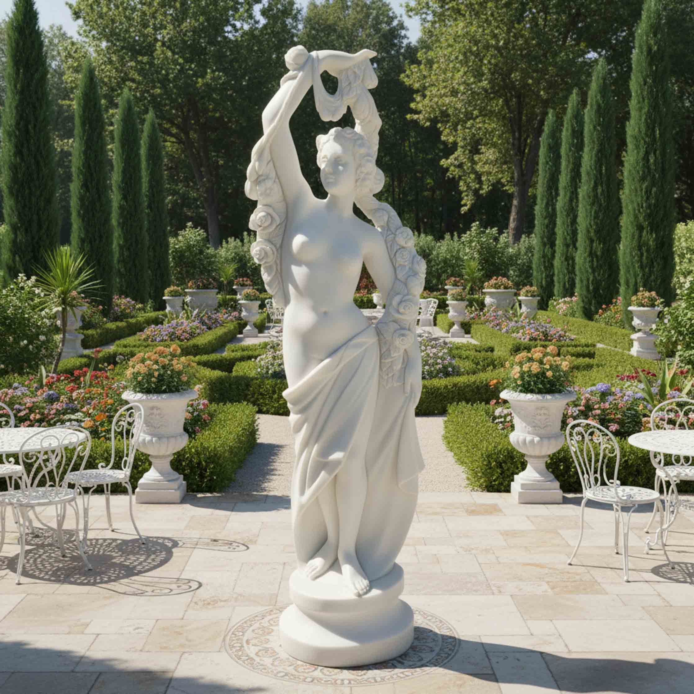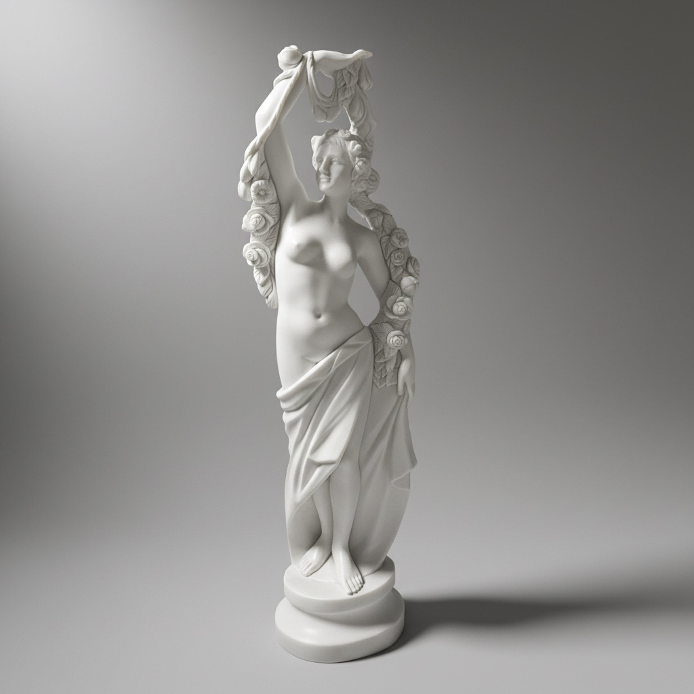 This white marble statue features a lithe, graceful build of the goddess Flora. Carved from solid stone with a radiant high-polish finish, the figure stands in an elegant, spiraling pose on a tiered circular base. An eccentric feature is the massive, floor-to-ceiling garland of deeply carved roses and blossoms that winds around her entire body, acting as both ornament and structural support. The build is exceptionally slender and vertical, capturing the ethereal beauty of spring. Every petal and leaf is hand-detailed, offering a tactile complexity that contrasts beautifully with the goddess’s smooth, porcelain-like skin.