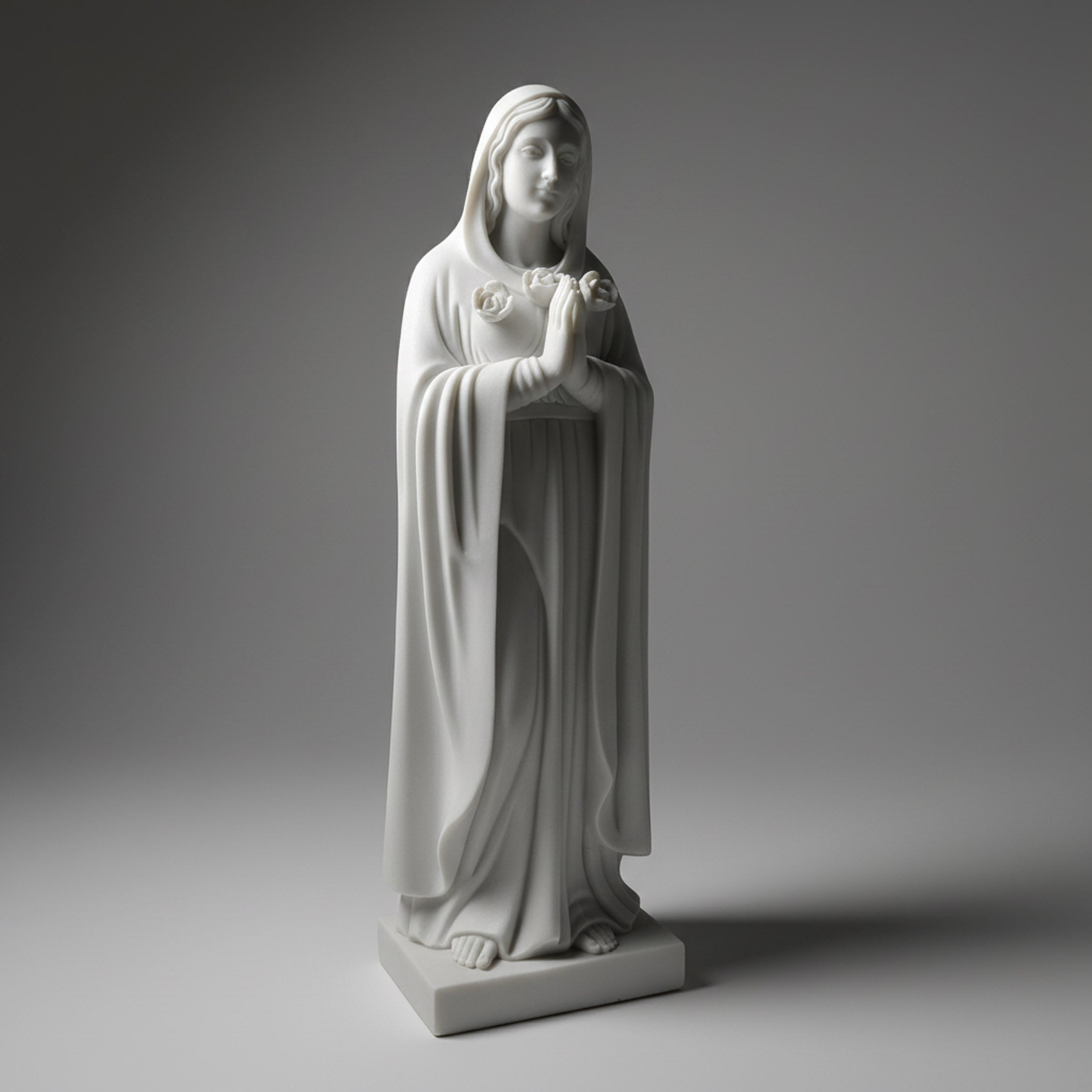 This white marble religious statue features a slender, graceful build of Saint Rose of Lima in a posture of quiet prayer. Hand-carved from solid natural stone, the figure stands in an elegant, vertical silhouette upon a rectangular integral base. An eccentric feature of this sculpture is the trio of oversized, high-relief roses blooming across the saint's chest, symbolizing her namesake and her life of devotion. The build is characterized by deep-etched vertical folds in the traditional habit and a soft, matte finish that highlights the youthful and serene facial features of the first saint of the Americas.