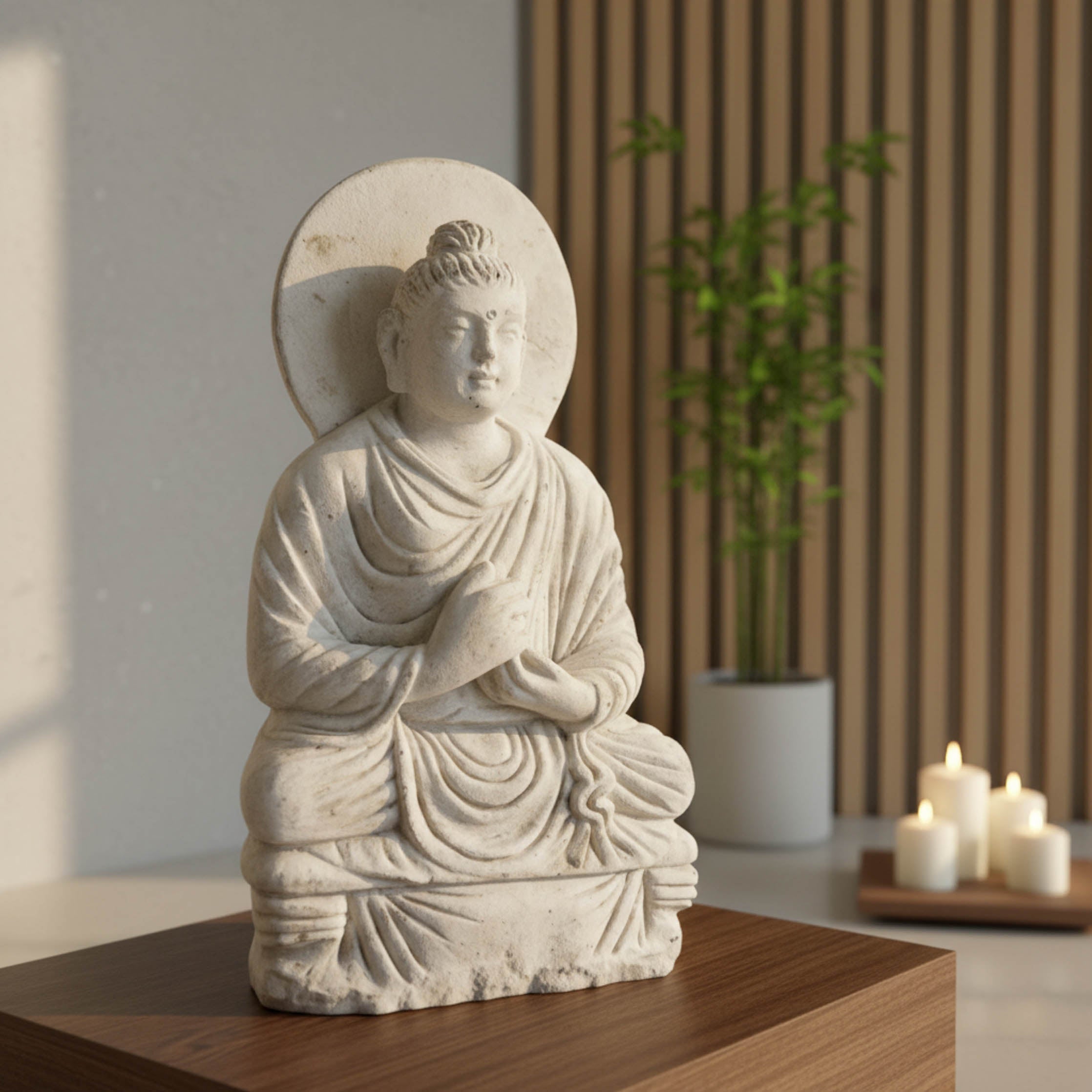 Carved from luminous white marble, this seated Buddha exemplifies spiritual peace through a refined, minimal aesthetic. Poised in the Dharmachakra Mudra, the "Great Teacher" is depicted in a state of perfect composure, framed by a smooth, unadorned circular halo. The artisan has utilized the natural brilliance of the marble to highlight the soft facial features and the rhythmic, simplified drapery of the monastic robes. This elegant icon serves as a radiant focal point for any contemporary meditation space or home sanctuary, bringing a sense of light, clarity, and ancient wisdom to a modern interior.