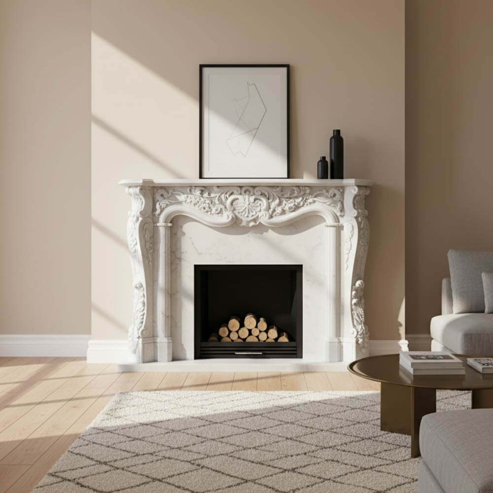 Transform your living space with the Neo-Classical Marble Fireplace, a magnificent mantel adorned with exquisite intricate floral carvings that beckon you to embrace the fusion of craftsmanship and timeless beauty.