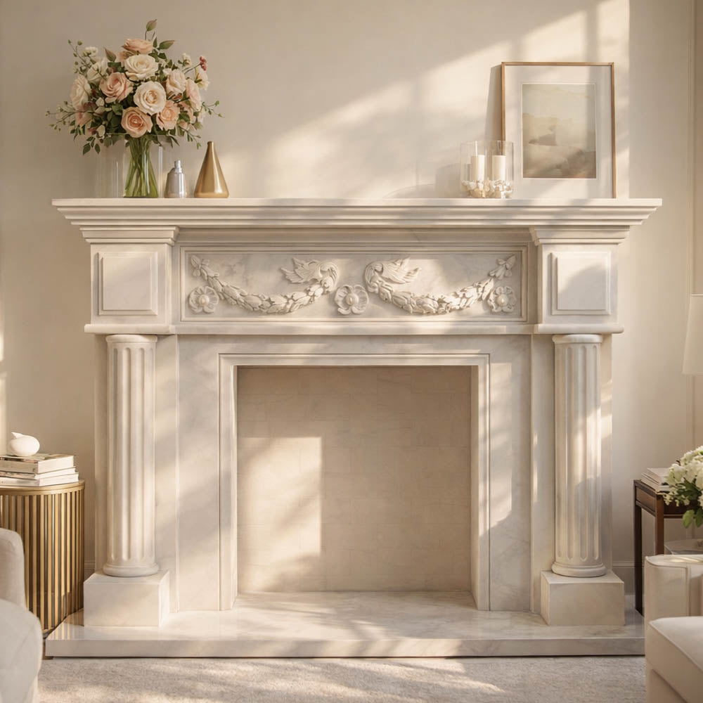 The beauty of this stone fireplace mantel lies in its exquisite shape, with perfect lines and powerful columns. The hand-carved details and use of natural stone imbue it with natural appeal and a unique flare. The raw, natural white marble tone enhances the intricate carvings, bringing them to life and creating a captivating visual experience..