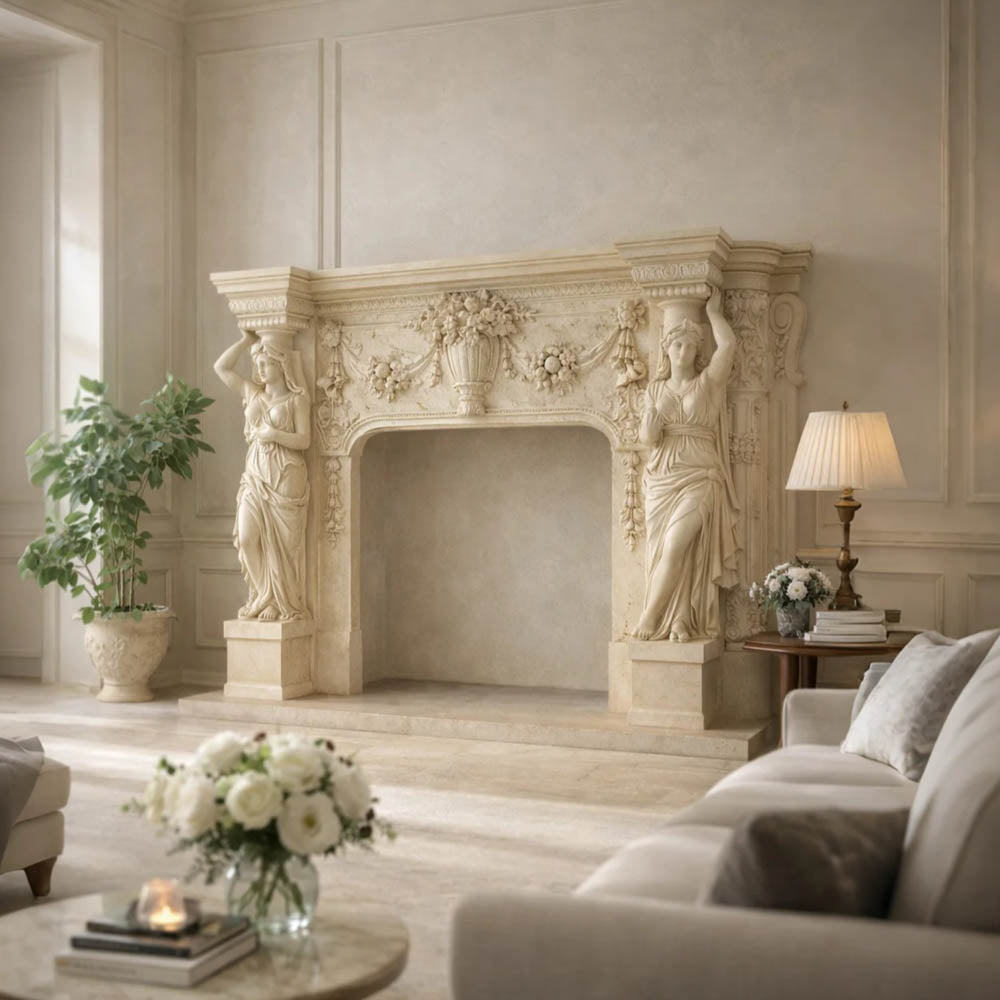 Marble fireplaces in Egyptian Beige Marble with Figurative Sculptures