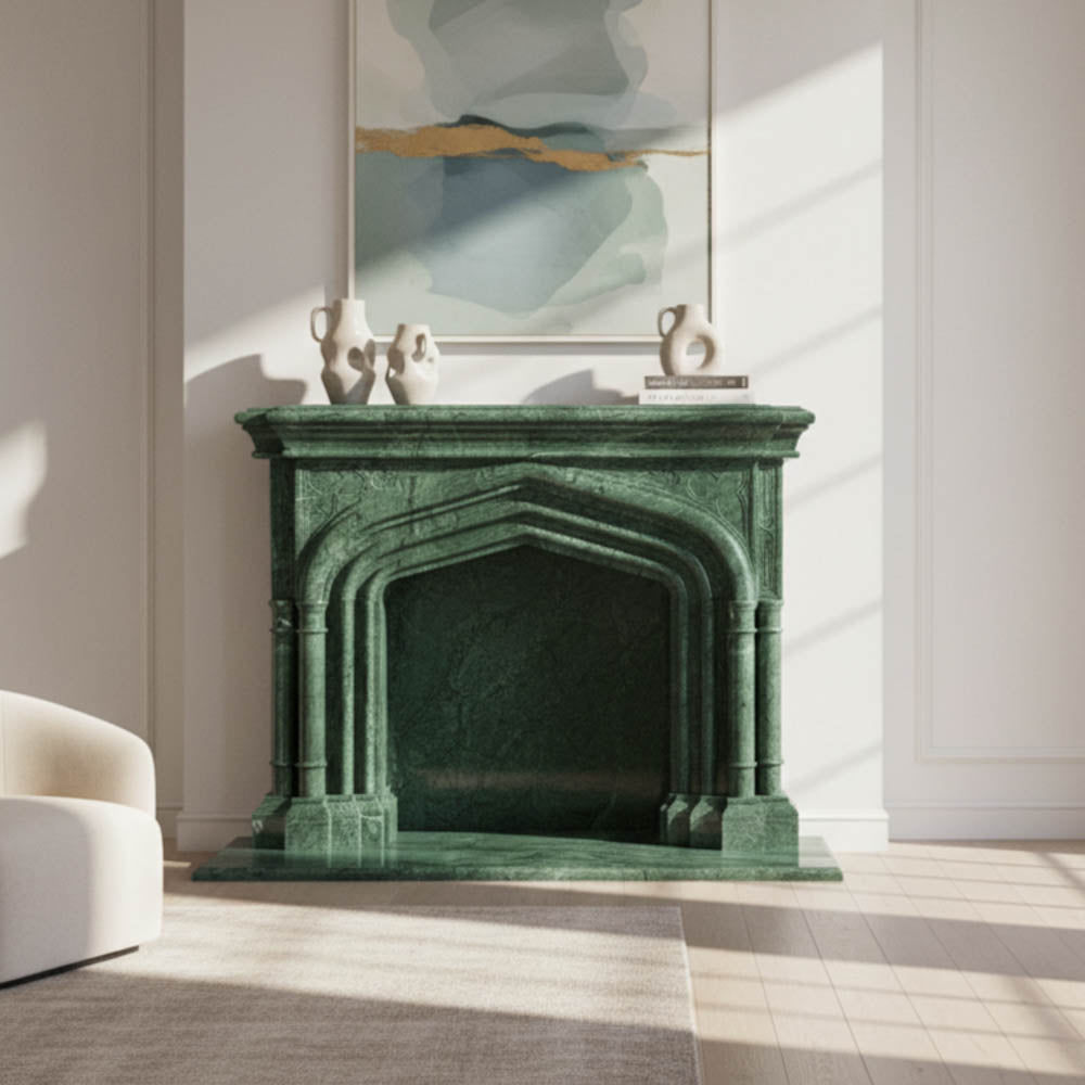 Make a majestic statement with this extraordinary Dark Green Marble Fireplace Surround. The stone features stunning natural veining that creates a richly textured, luxurious finish. The eccentric, defining feature is the Gothic Ogee Arch opening, which lends an authentic, cathedral-like grandeur. The arch is supported by deeply fluted side columns that rest upon a substantial, polished hearth. This unique, wide, and tall fireplace is a rare architectural find, perfect for a historic home, a library, or a room seeking a dramatically rich color palette and unparalleled style.