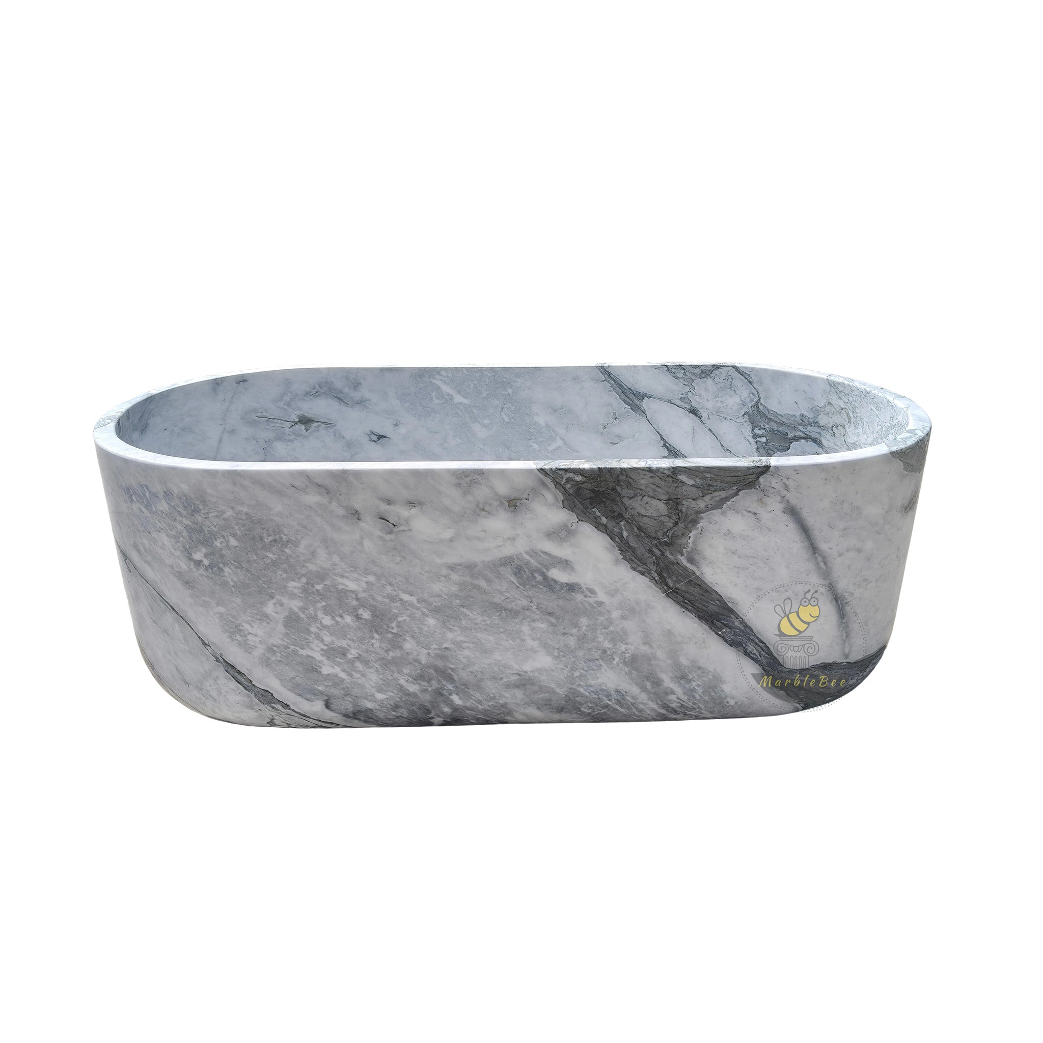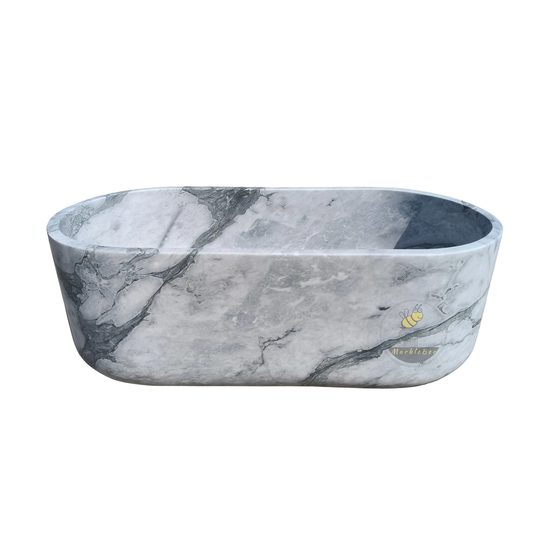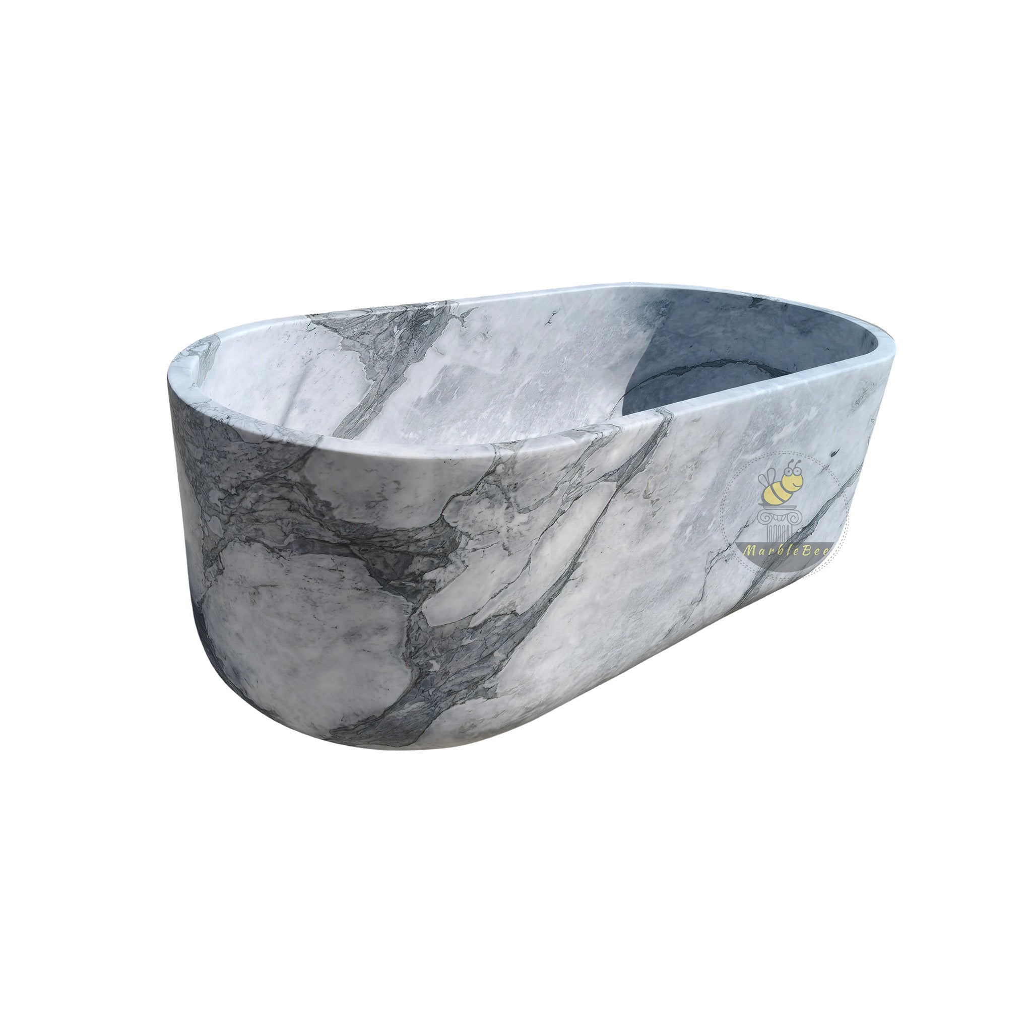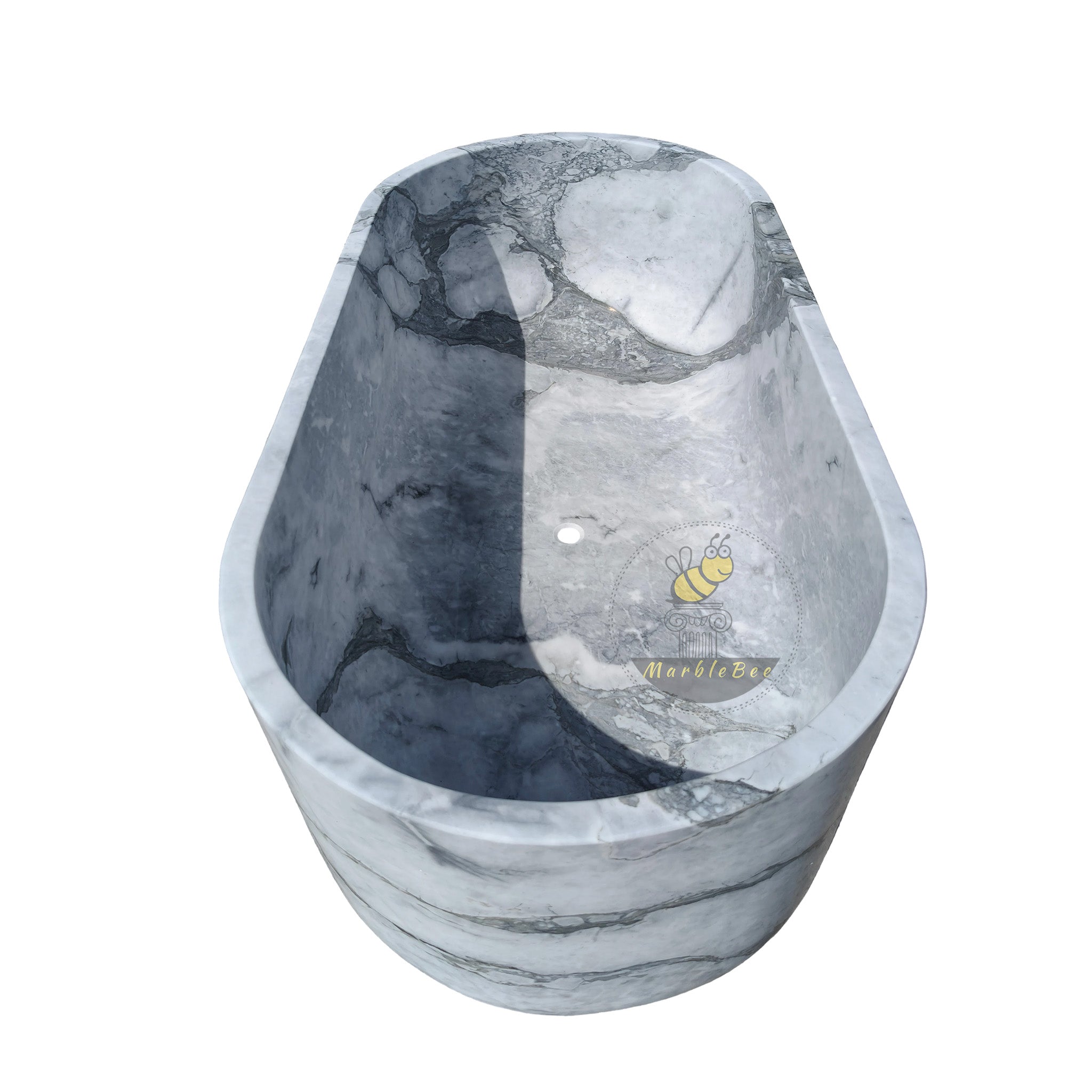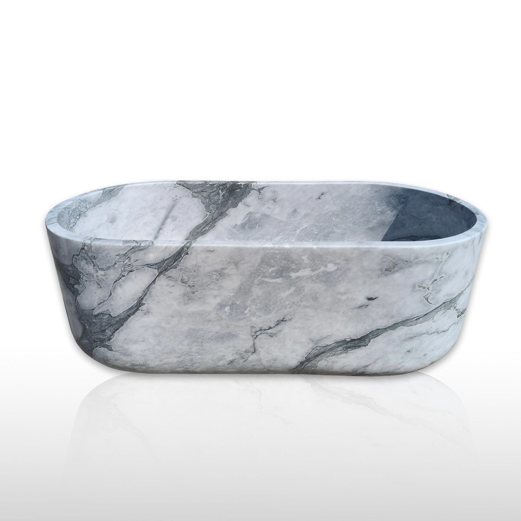 Experience timeless luxury with this freestanding tub, impeccably carved from classic Statuario Venato marble. This coveted stone is celebrated for its luminous white-grey base and iconic, sweeping veins of deep grey that create a sophisticated and artistic statement. Its modern oval shape provides a deep and comfortable basin for ultimate relaxation. Measuring 70.87" L x 34.65" W x 23.62" H, this exquisite white marble tub is the epitome of refined elegance for any high-end bathroom.