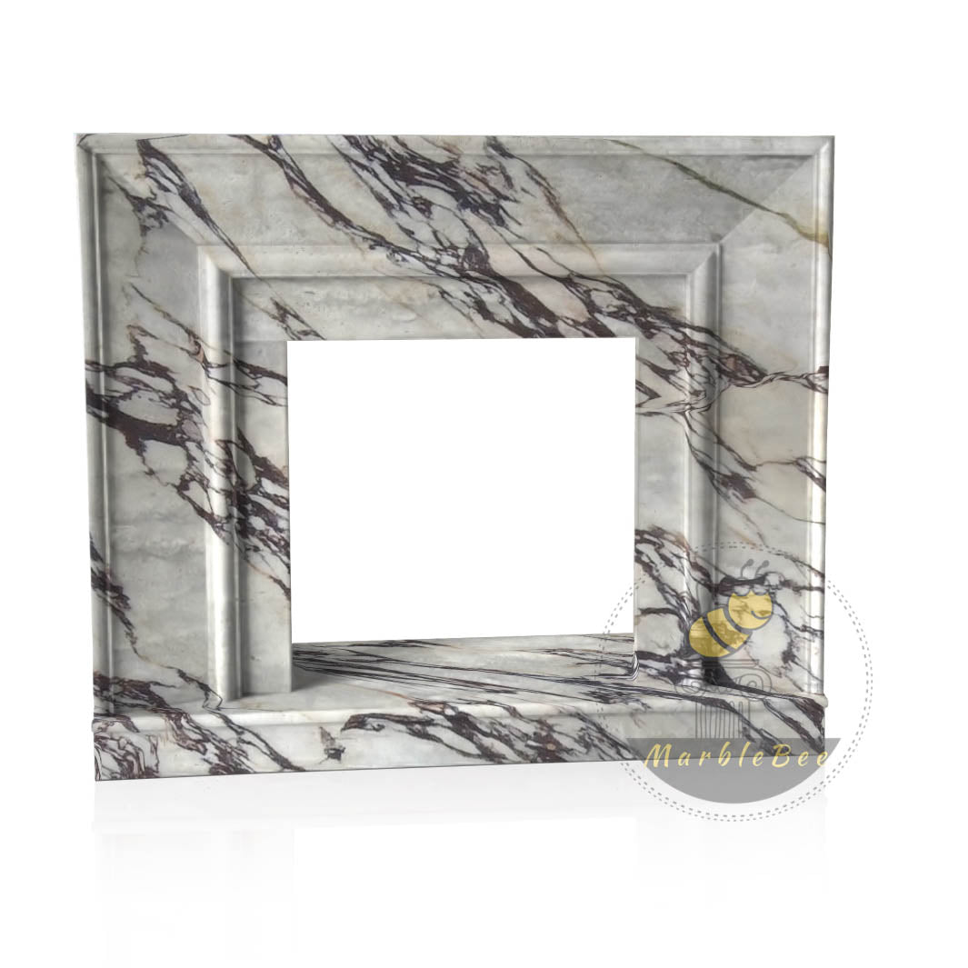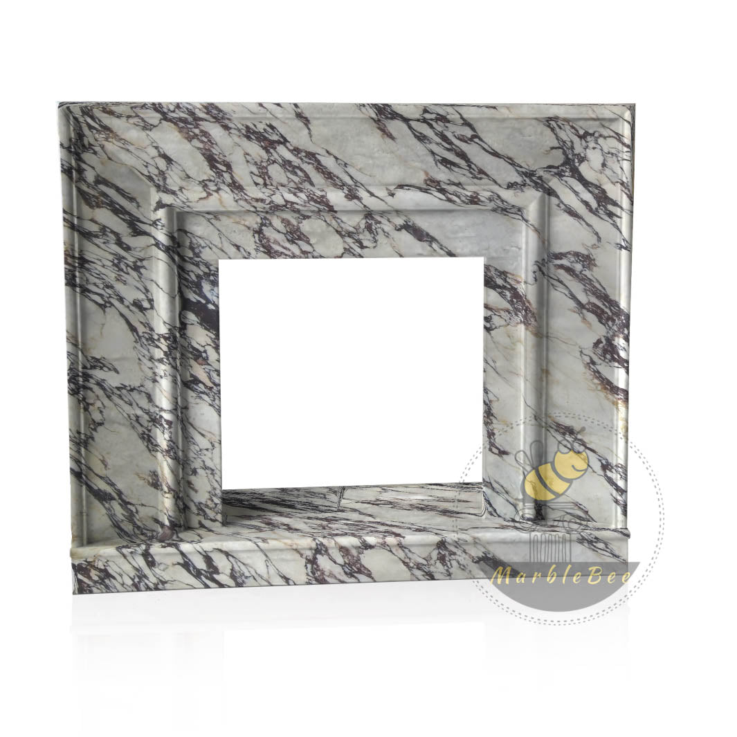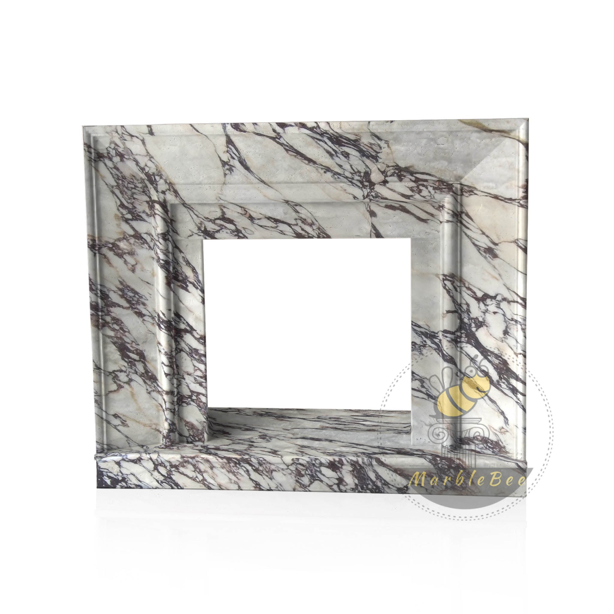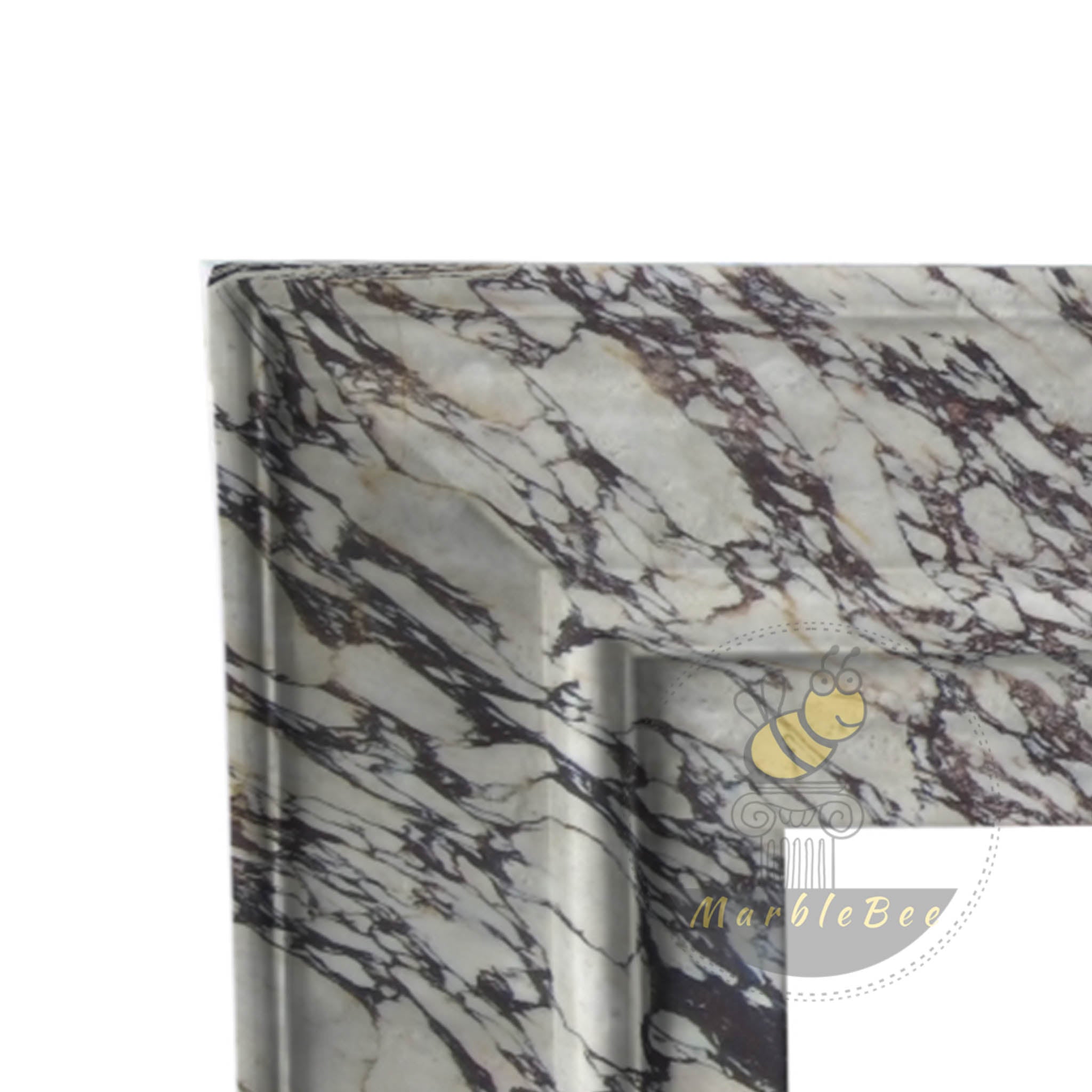 Indulge in pure opulence with one of our custom fireplace mantels, exquisitely carved from luxurious Calacatta Viola marble. This prestigious Italian stone is celebrated for its dramatic, deep burgundy and violet veining that creates a breathtaking pattern across a creamy white canvas. The classic, molded silhouette provides a timeless elegance. Measuring 59.06" W x 47.24" H x 11.81" D, this piece is a magnificent statement of artistry and sophisticated design, destined to be the grand centerpiece of any high-end living space.