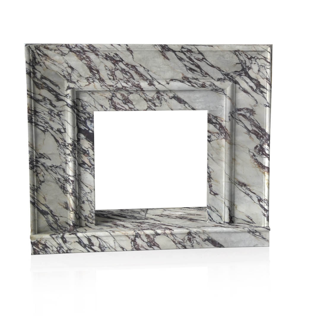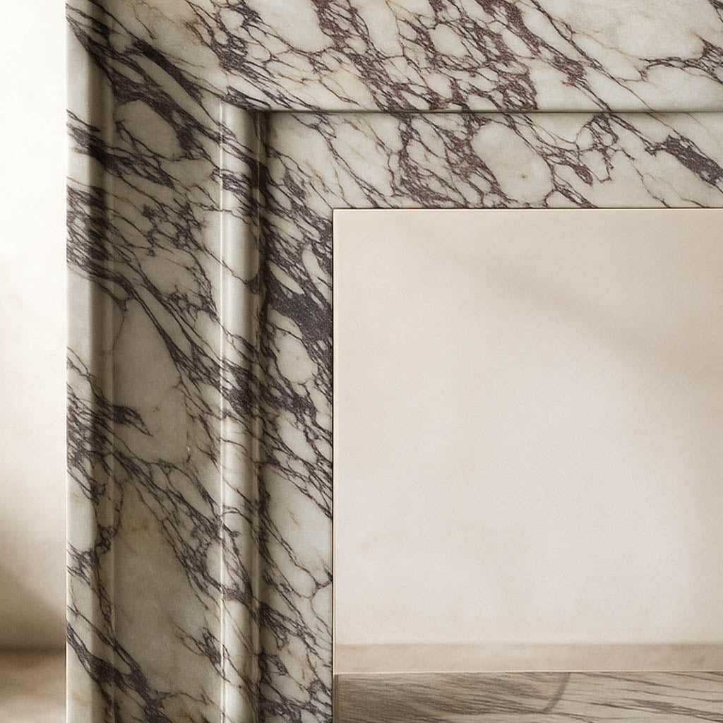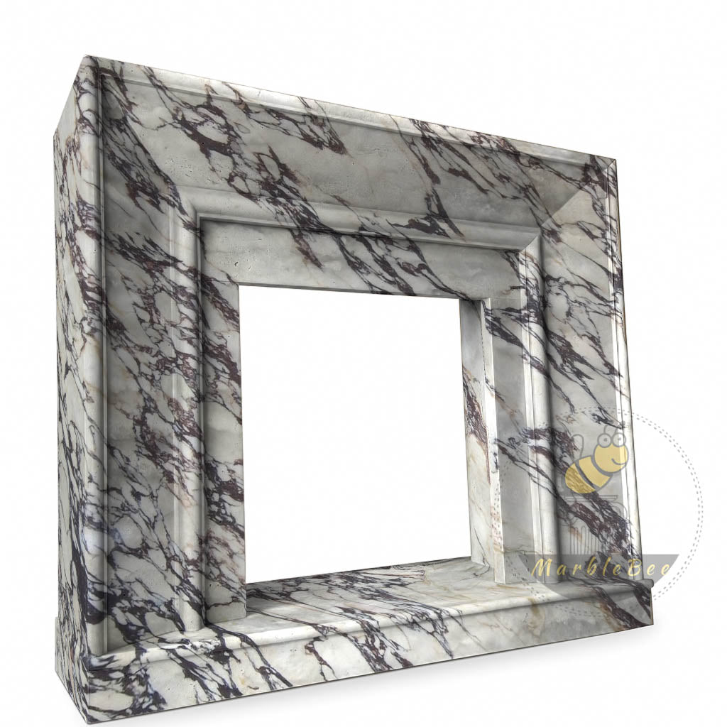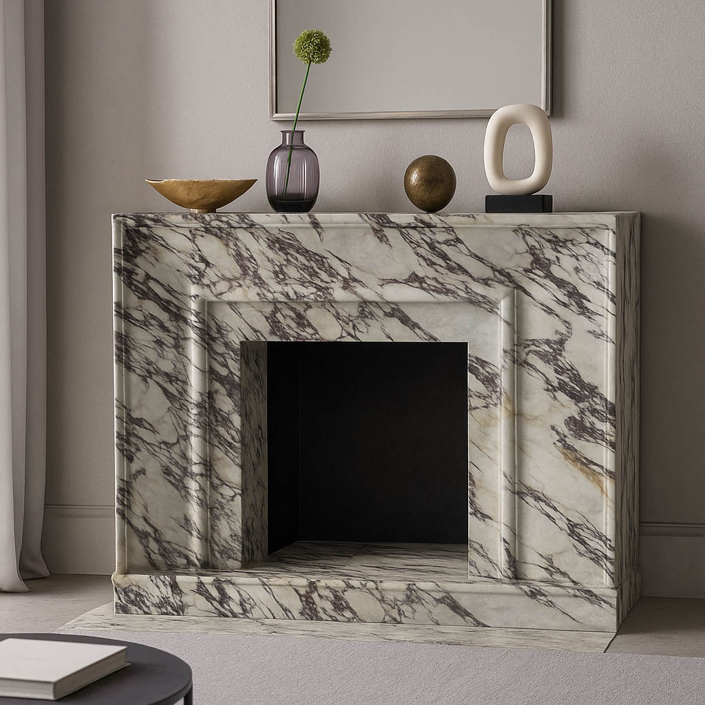 Indulge in pure opulence with one of our custom fireplace mantels, exquisitely carved from luxurious Calacatta Viola marble. This prestigious Italian stone is celebrated for its dramatic, deep burgundy and violet veining that creates a breathtaking pattern across a creamy white canvas. The classic, molded silhouette provides a timeless elegance. Measuring 59.06" W x 47.24" H x 11.81" D, this piece is a magnificent statement of artistry and sophisticated design, destined to be the grand centerpiece of any high-end living space.