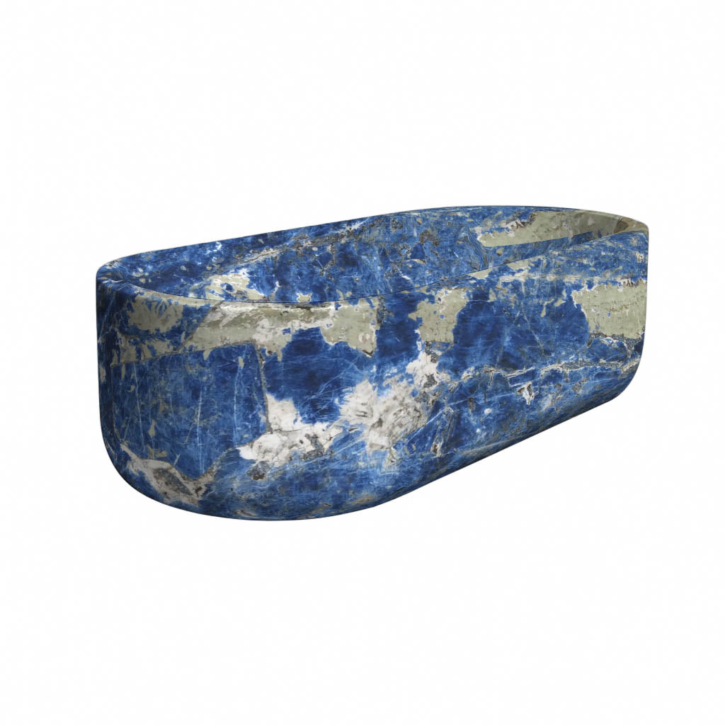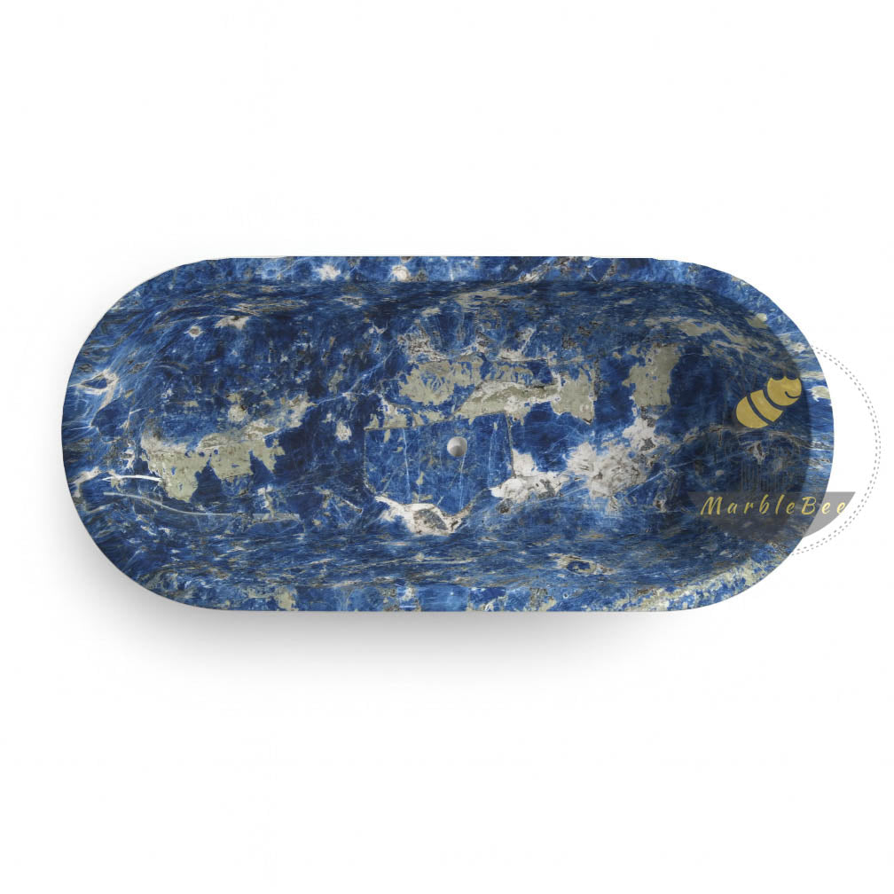 Immerse yourself in cosmic luxury with this freestanding bathtub, sculpted from a solid block of rare and captivating dark blue marble. Its deep, lapis-like blue surface is spectacularly adorned with a galaxy of white, grey, and shimmering mineral inclusions, making each piece a unique masterpiece. The tub's modern, soft rectangular form enhances its artistic presence. Sized at a generous 70.87" L x 31.50" W x 23.62" H, this vessel is a statement of ultimate opulence for a truly stellar bathing experience.