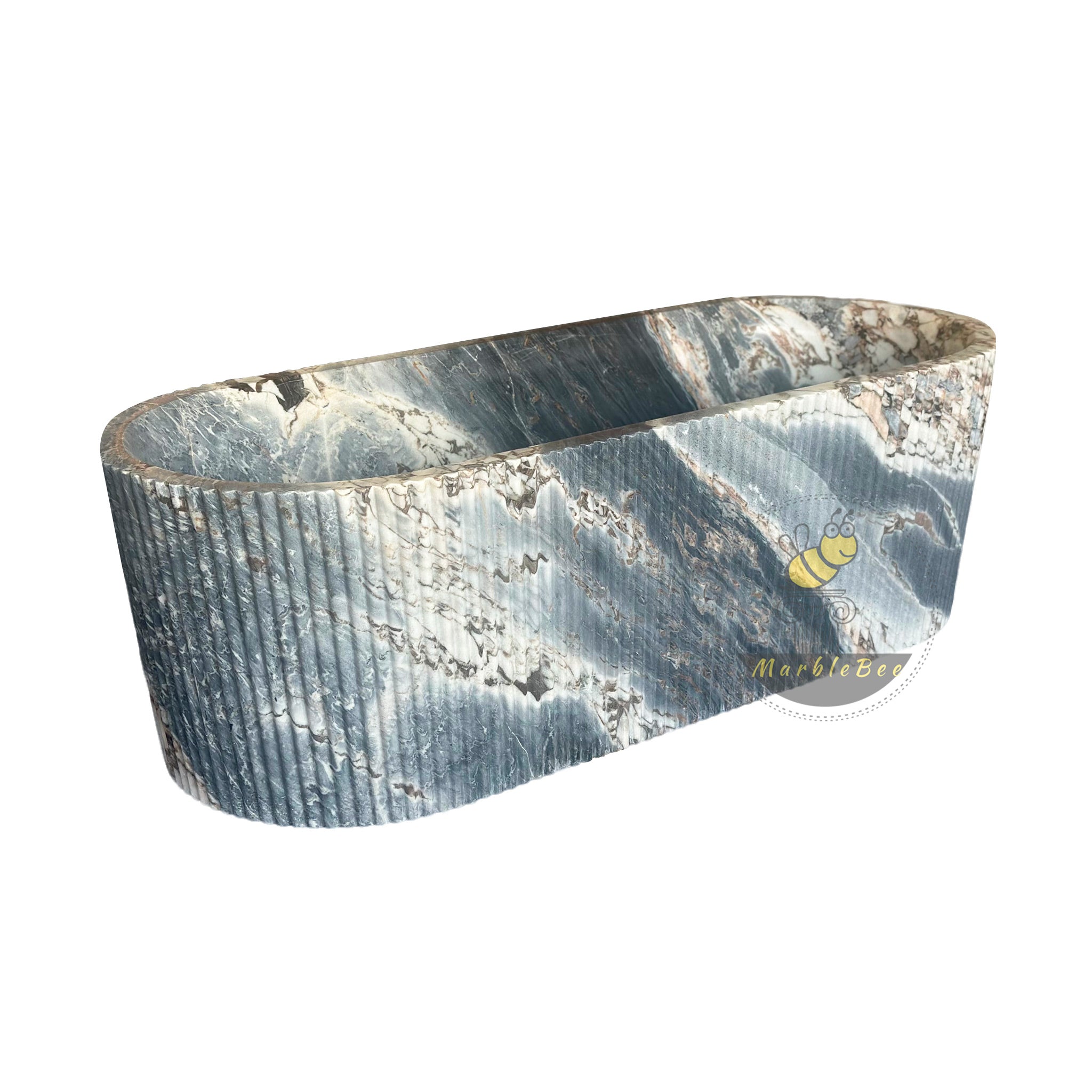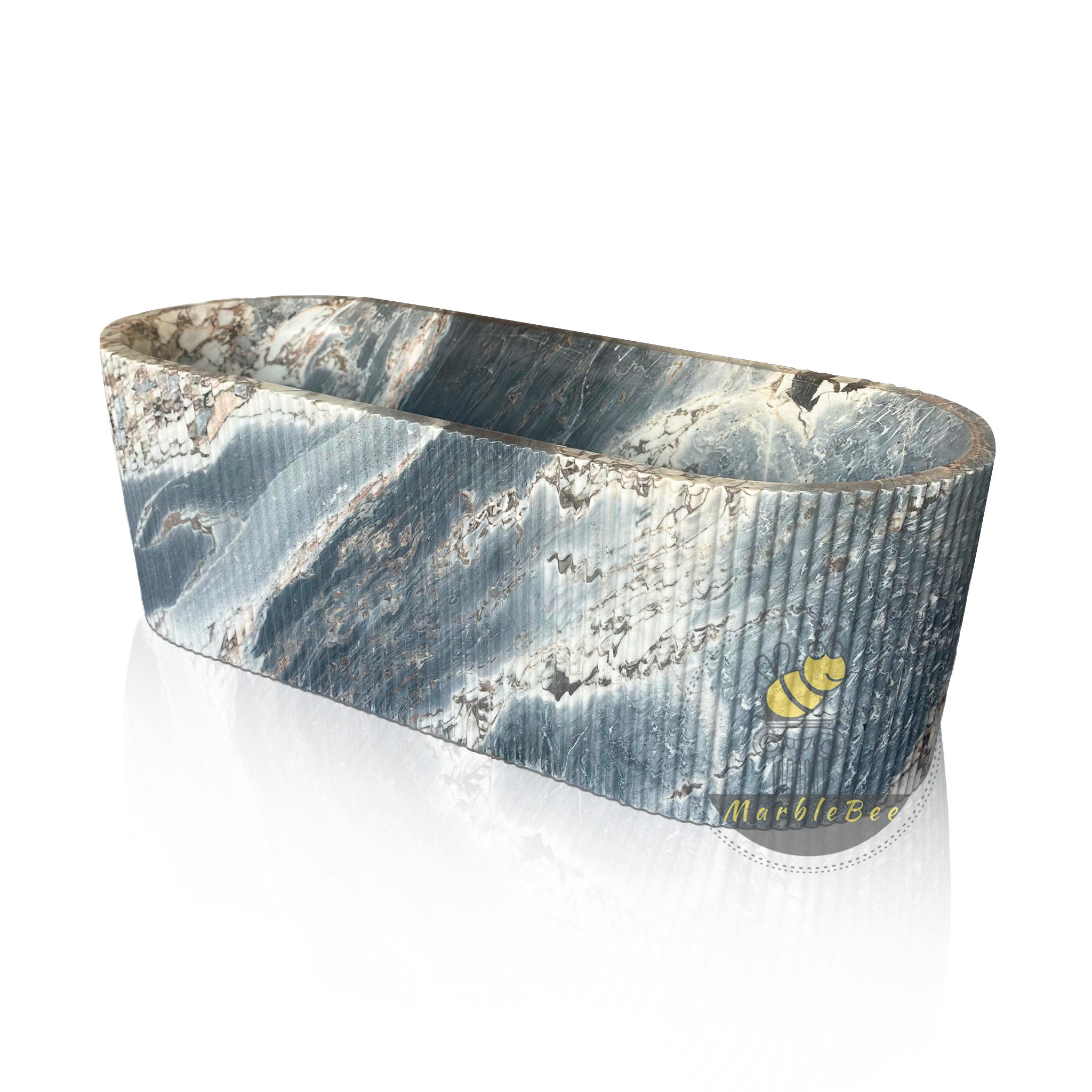 Elevate your home with this exceptional freestanding bathtub, meticulously carved from luxurious Italian Valgri white marble. Its distinctive, vertically fluted exterior creates a sophisticated texture that enhances the stone's dramatic natural beauty. The marble showcases a captivating flow of deep, stormy blues and greys, contrasted by soft white and cream patches. Measuring 70.87" L x 31.50" W x 23.62" H, this piece is a sublime fusion of contemporary design and timeless geological art, promising an opulent and immersive soaking experience.