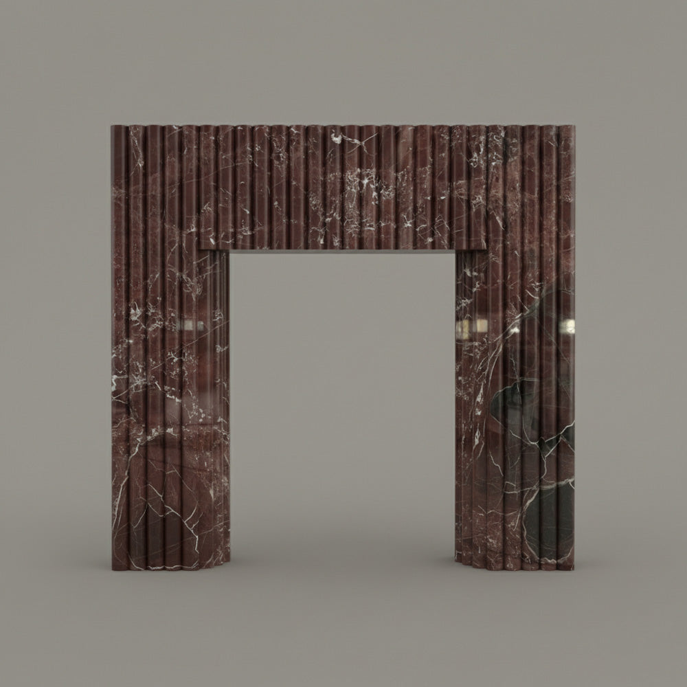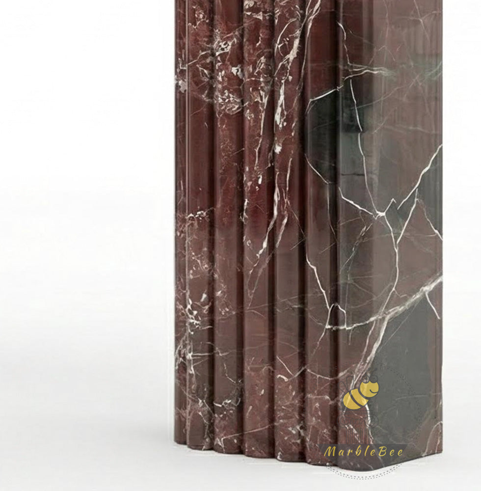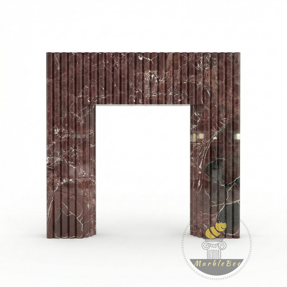 This striking Marble mantelpiece is a masterpiece of modern design, hand-crafted from opulent Rosso Levanto marble. The deep burgundy stone, enriched with dramatic white and grey veining, commands attention in any luxury setting. Its defining visual feature is the precise vertical fluting that covers the entire facade, adding architectural interest and a sophisticated texture to its clean, geometric lines. This contemporary Marble mantelpiece is ideally suited for a high-end modern living room, a chic urban apartment, or a boutique hotel lobby. It stands with a width of approximately 59 inches and a height of 49 inches, making a bold statement.