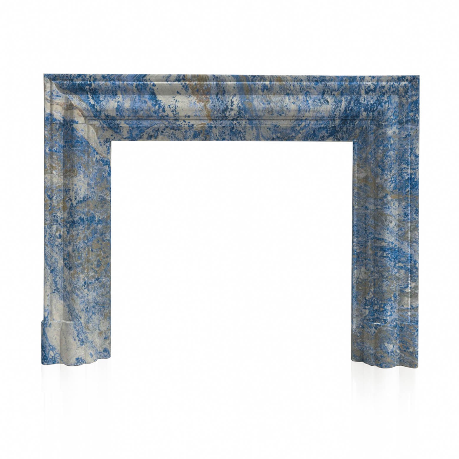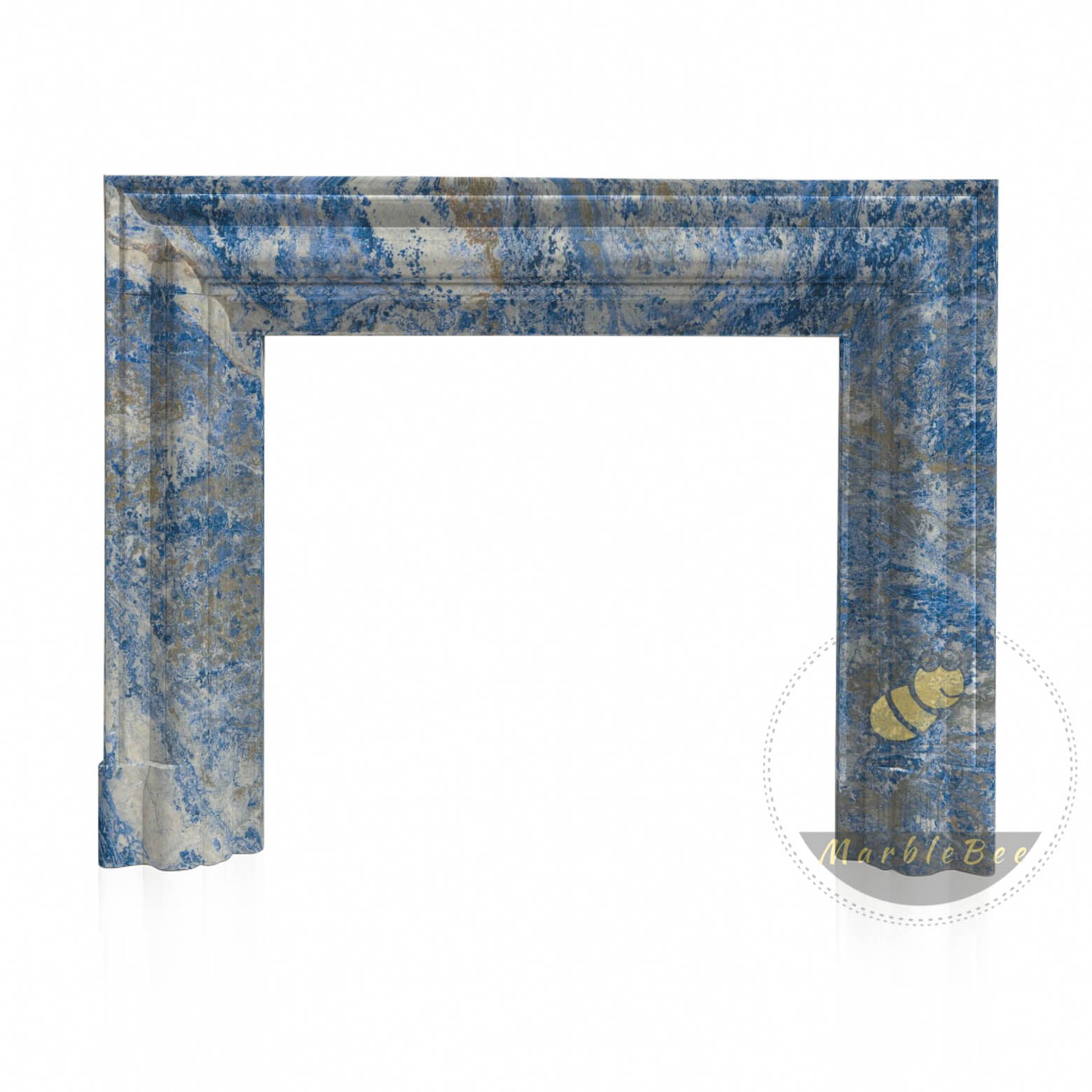Elevate your home with this exquisite Natural blue marble fireplace surround. Carved from a single block of luxurious marble, its surface is a captivating canvas of cosmic blues, whites, and subtle golden hues. The elegant, classic design features gracefully carved details, adding a touch of timeless sophistication to any room. With grand dimensions of 59.06" W x 47.24" H x 11.81" D, this piece is a stunning statement of opulence, designed to be a magnificent and artistic focal point in a high-end interior.