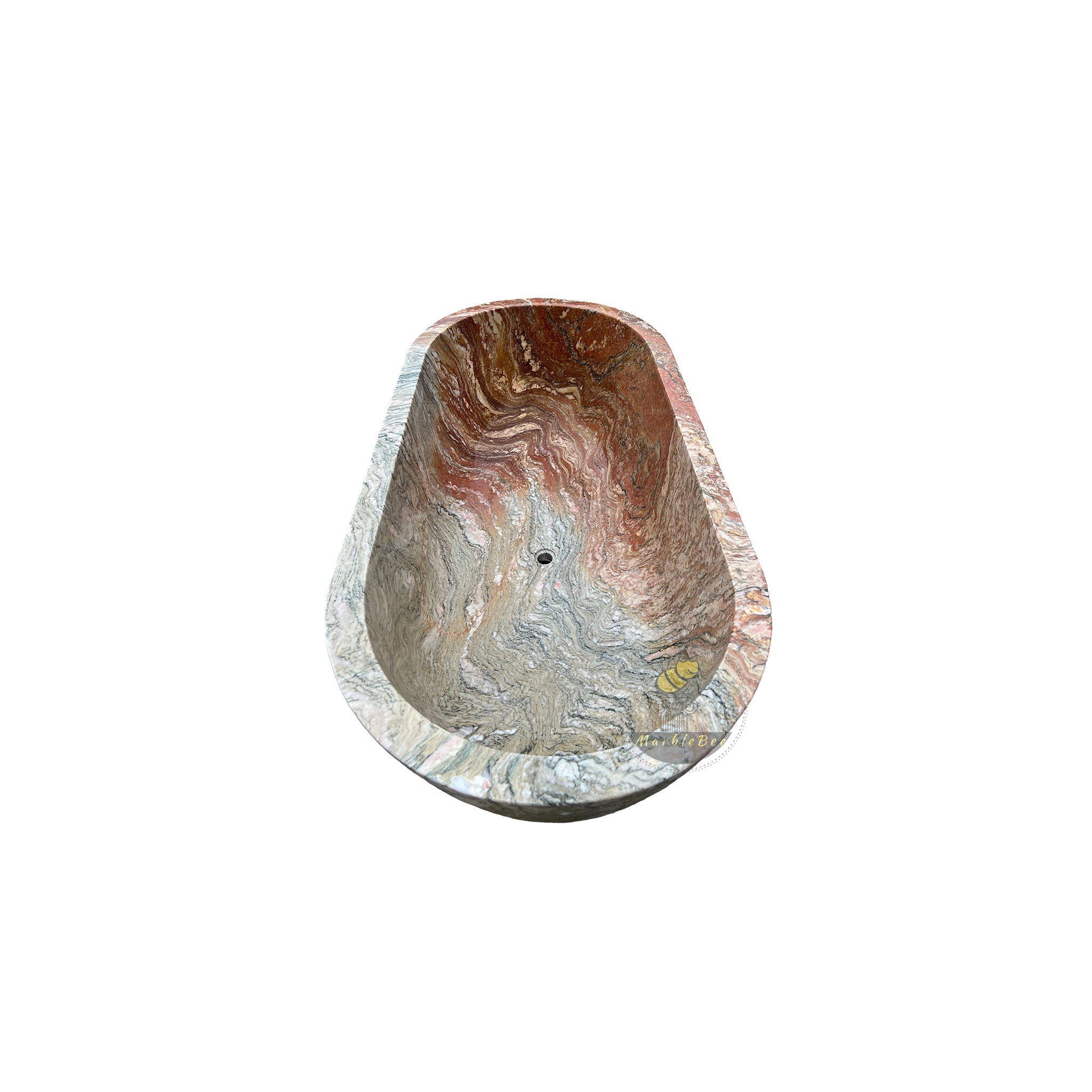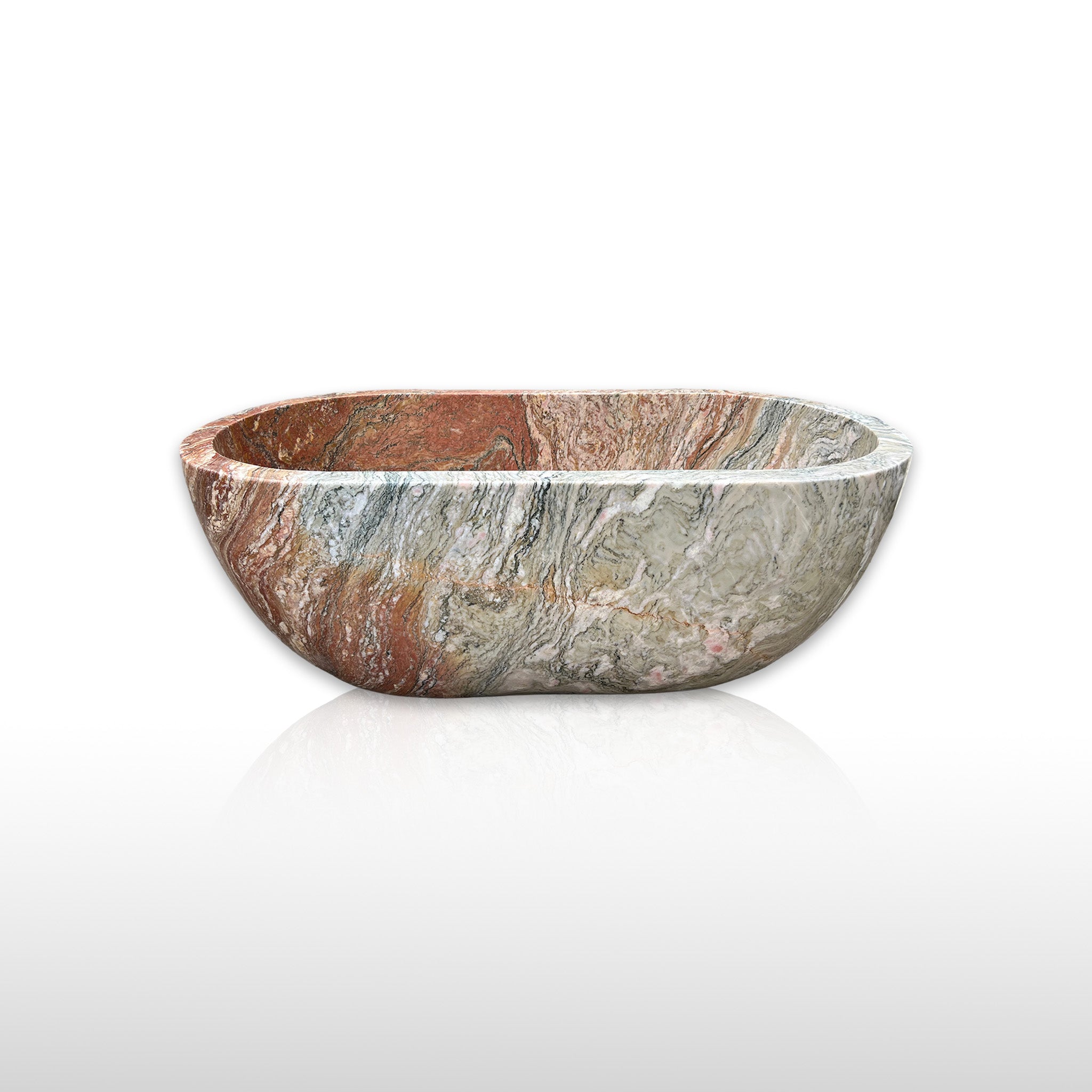 This truly unique bathtub is a masterpiece of natural art, sculpted from a solid block of luxurious Verde Rosato Imperiale marble. Its remarkable, asymmetrical shape is designed for both visual impact and ergonomic comfort. The stone’s surface is a captivating canvas of swirling rose, earthy greys, and dramatic white veins, ensuring no two pieces are ever alike. Measuring 67.91" L x 33.46" W x 23.23" H, this vessel is a stunning focal point, perfect for a high-end, artistic bathroom design.