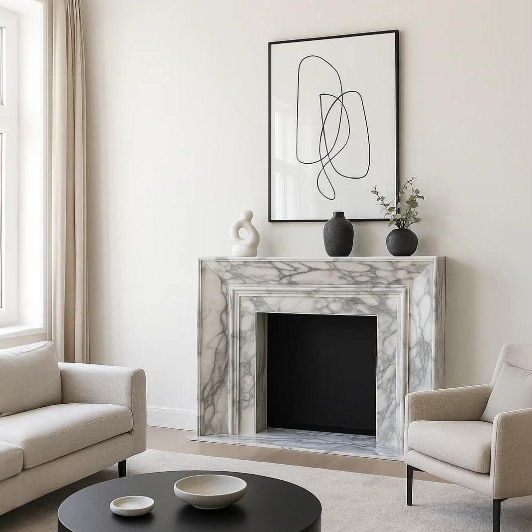 This Arabescato marble fireplace mantel is a real statement piece. It's a generously sized mantel that will definitely catch the eye without overwhelming your room. The elegant Arabescato marble, with its beautiful veining, makes it a perfect fit for a luxurious traditional home, or even a sophisticated modern space looking to add a touch of classic grandeur. It's not just a fireplace, it's a focal point that brings a sense of timeless beauty and warmth to your living area. Imagine cozy evenings by the fire, with this stunning piece as the centerpiece of your room.