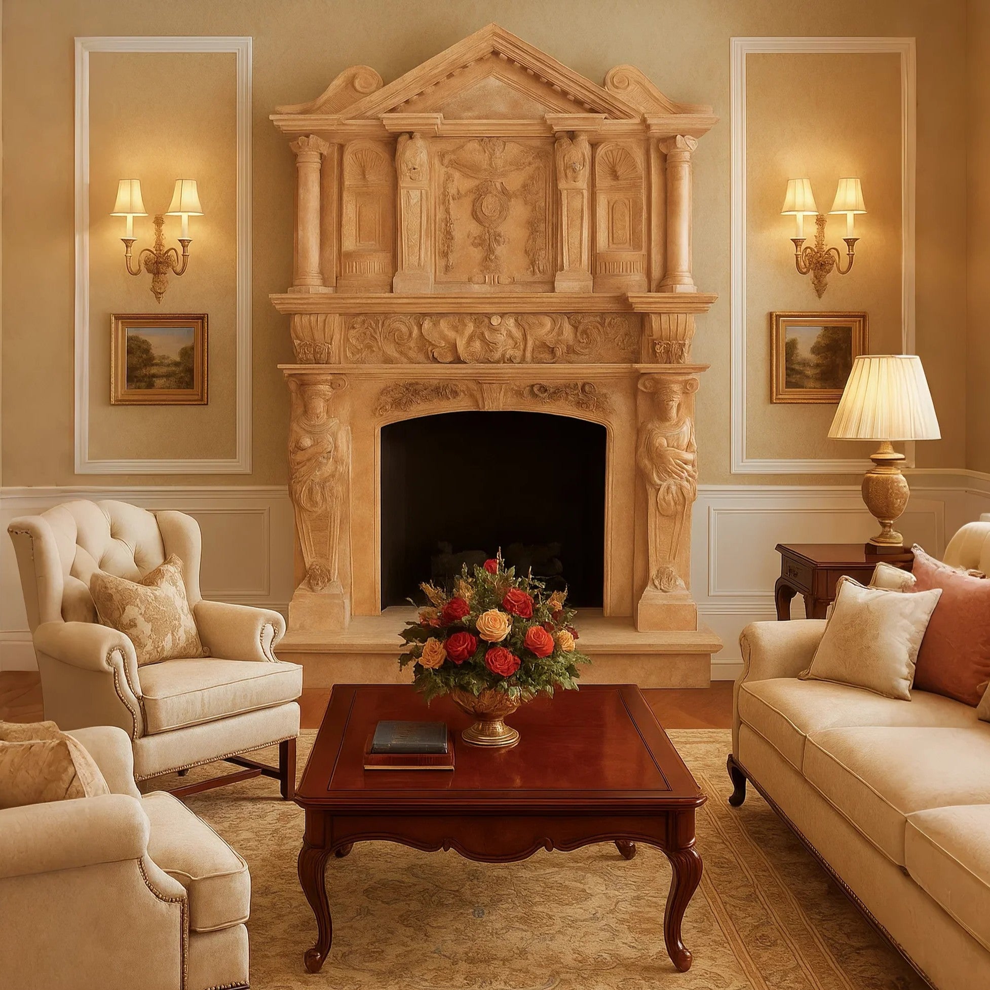 Appreciate the uniqueness of Custom Travertine Fireplace Surround, crafted from Yellow Travertine. Its etched floral patterns and sturdy frame add a distinctive charm. The warm yellow tone ensures a lasting, elegant look.