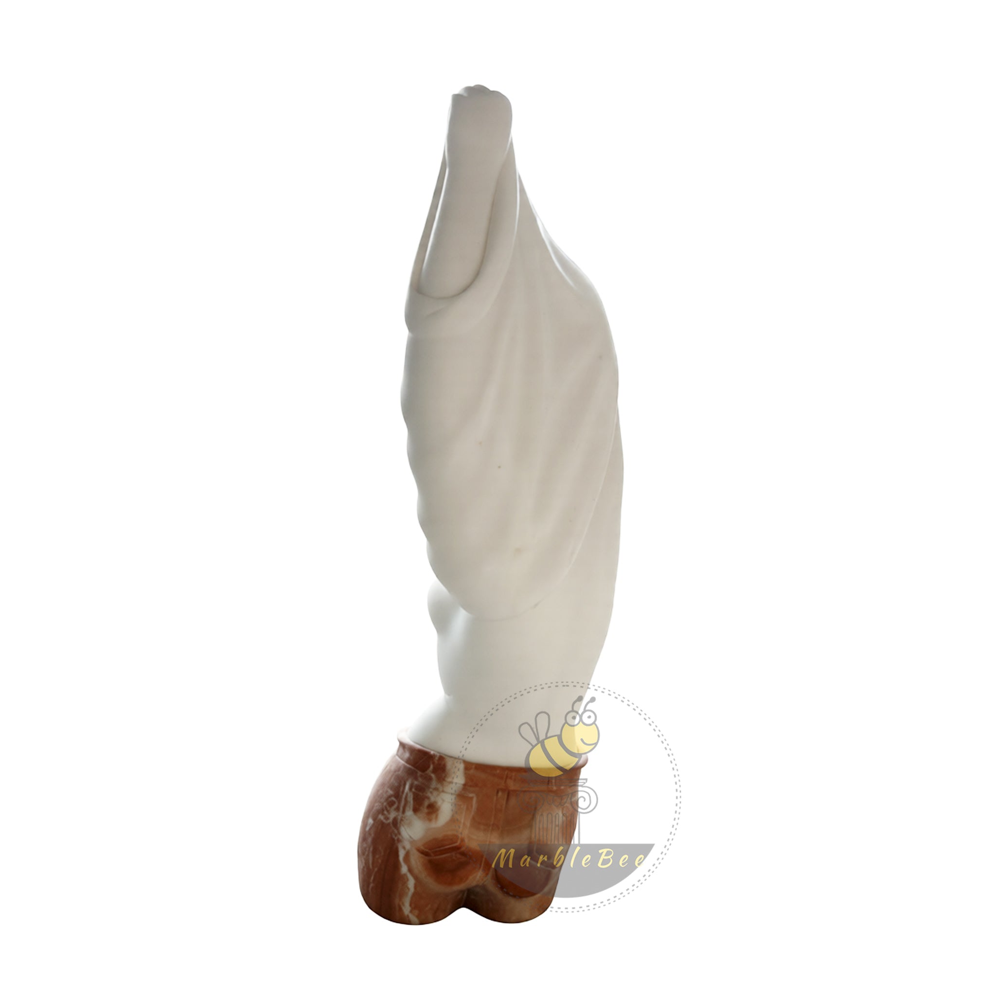 This marble bust presents a stylized female torso carved in glossy white marble, rising directly from a pair of bright red marble shorts. The figure leans slightly back with both arms lifted overhead, the upper body enveloped in a smooth, flowing veil that sweeps upward and joins at the hands to form a tall, flame‑like silhouette. Softly modeled curves, a delicate neckline, and a partially veiled face add a sense of mystery, while the vivid red, veined shorts introduce a playful contemporary twist against the serene white stone. Compact yet vertical, this striking bust suits console tables, reception counters, or gallery plinths where its two‑tone marble can be appreciated in the round.
