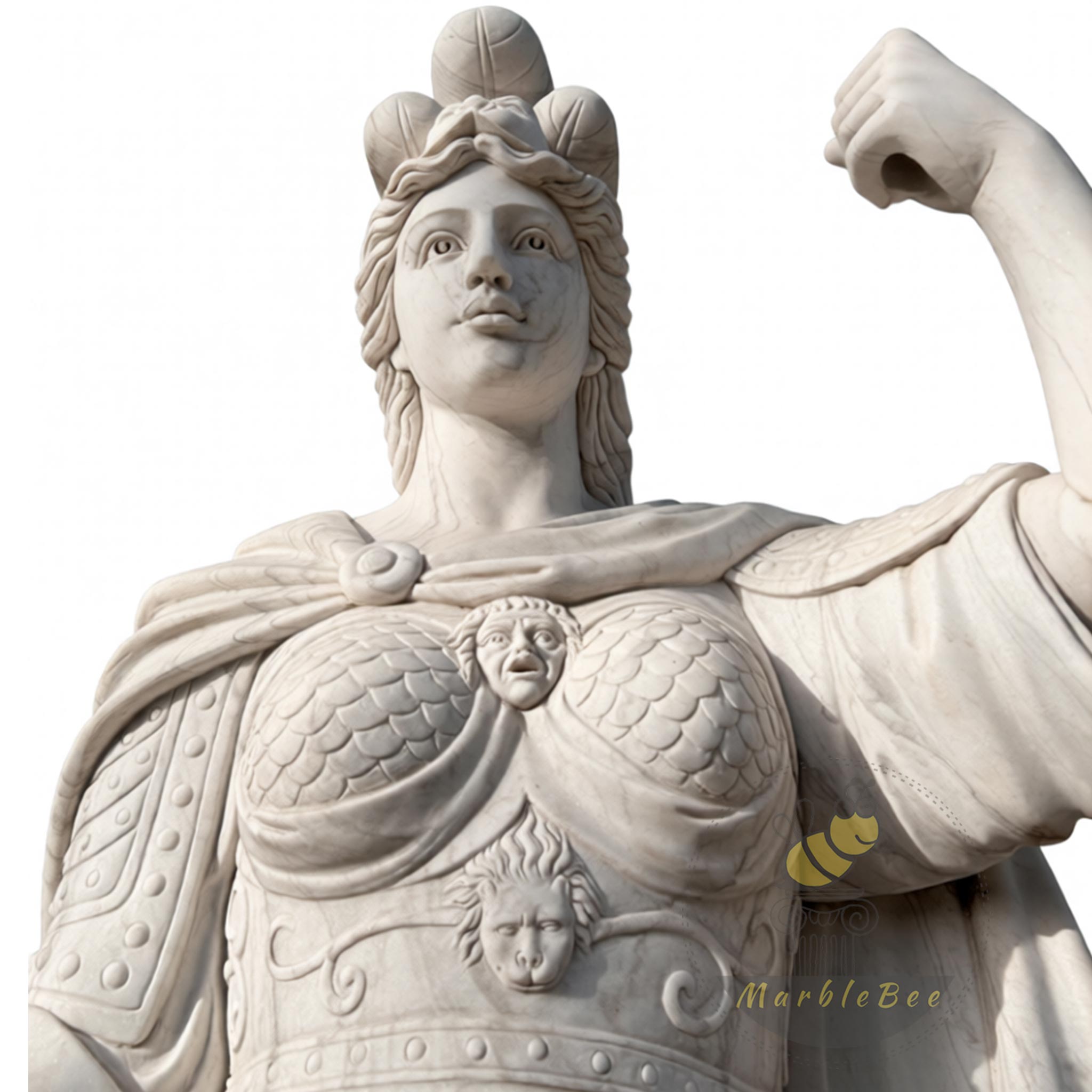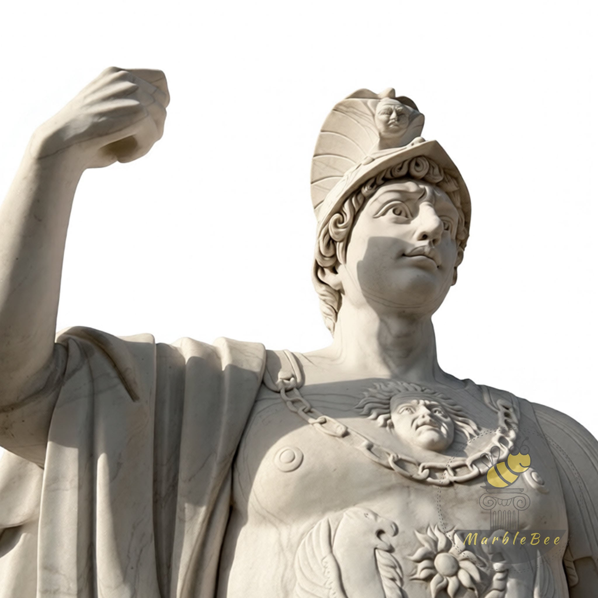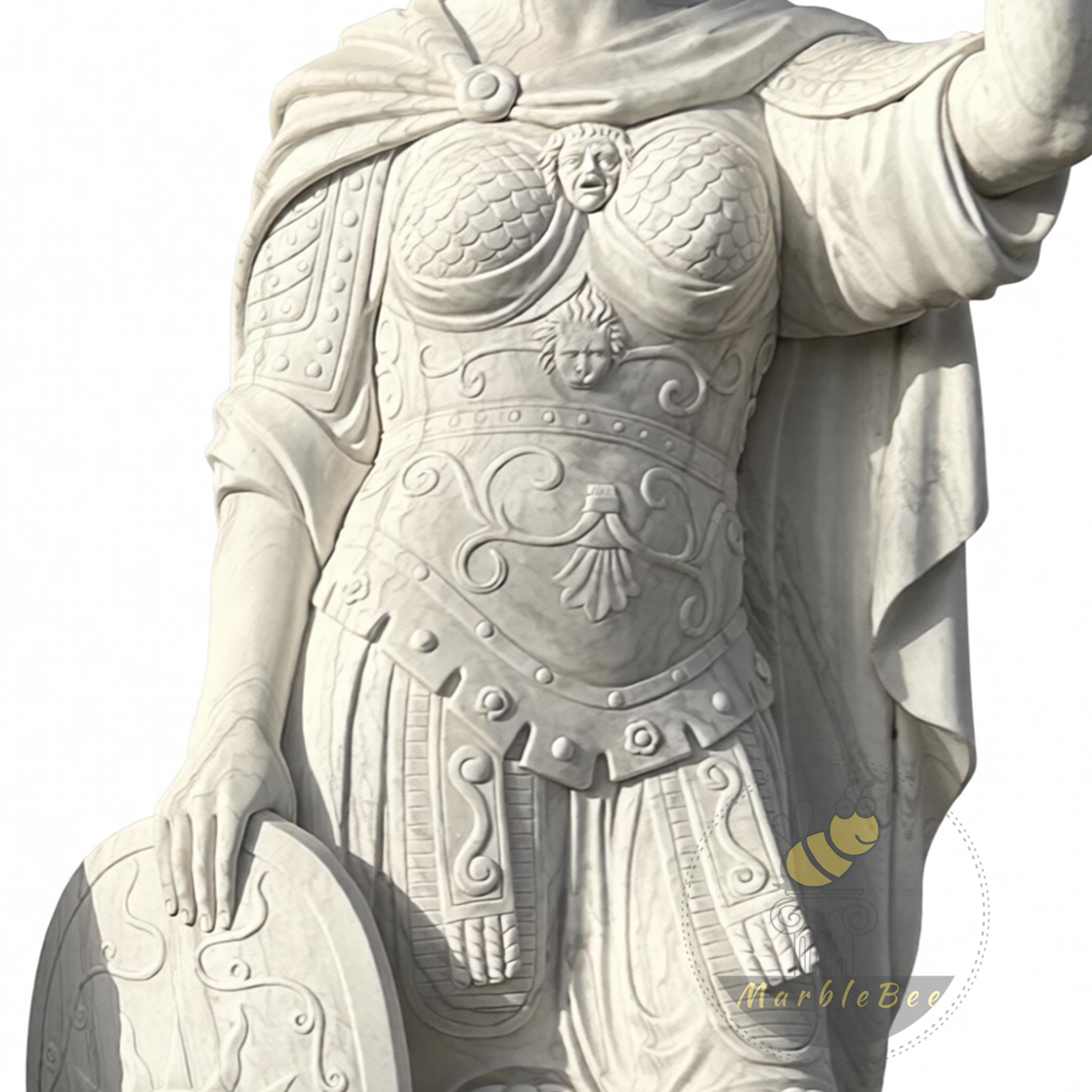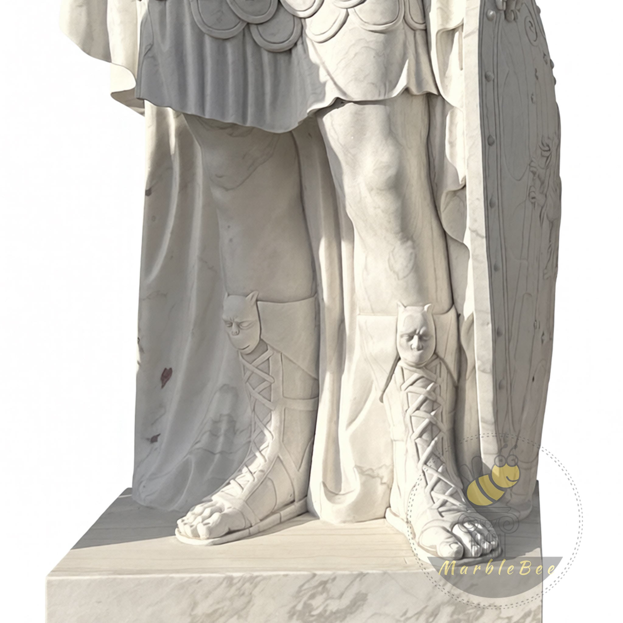 These stone garden ornaments feature a commanding pair of Roman‑style warriors, each standing on a tall rectangular plinth carved from solid white marble. Both figures wear ornate armor with layered scale corselets, tasselled skirts, and high lace‑up boots decorated with small mask faces on the shin guards. One warrior lifts a round shield engraved with scrolling motifs and mythic creatures, while the other raises a clenched fist as if addressing an unseen army. Flowing cloaks, crested helmets, and crisp surface detailing make this striking duo ideal for flanking grand pathways or estate entrances.