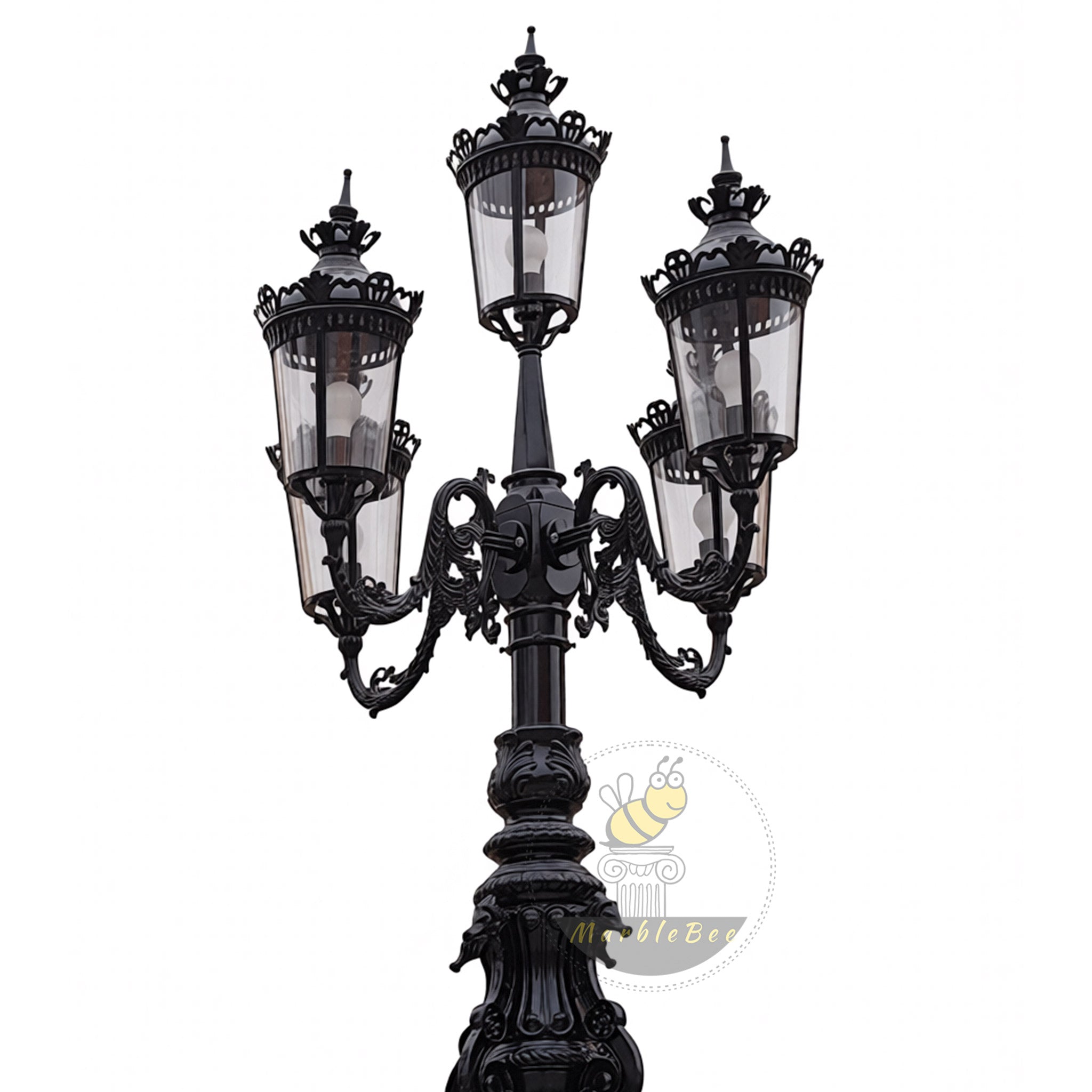 Détails de sculpture exquis et complexes du plus haut savoir-faire d'un lampadaire d'extérieur