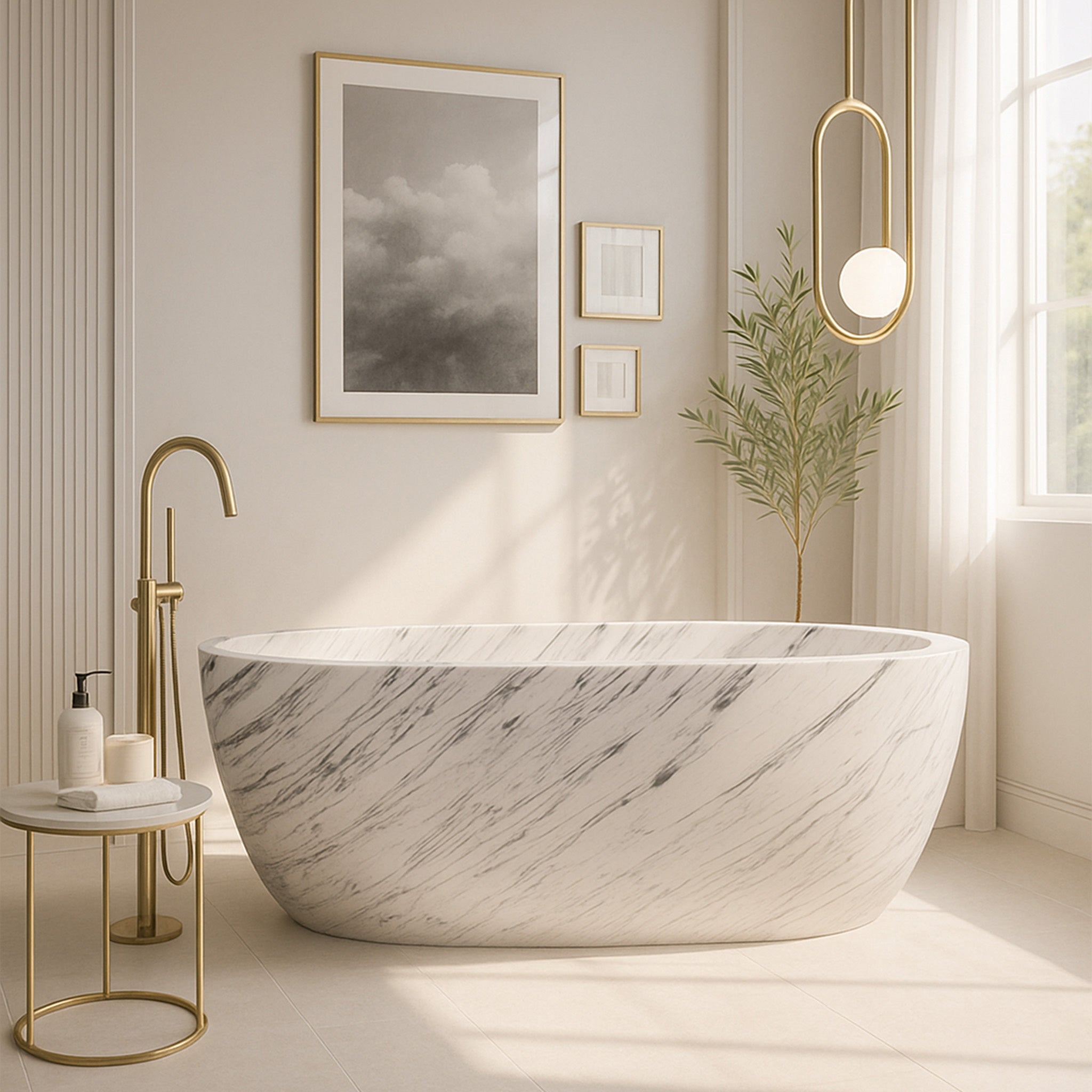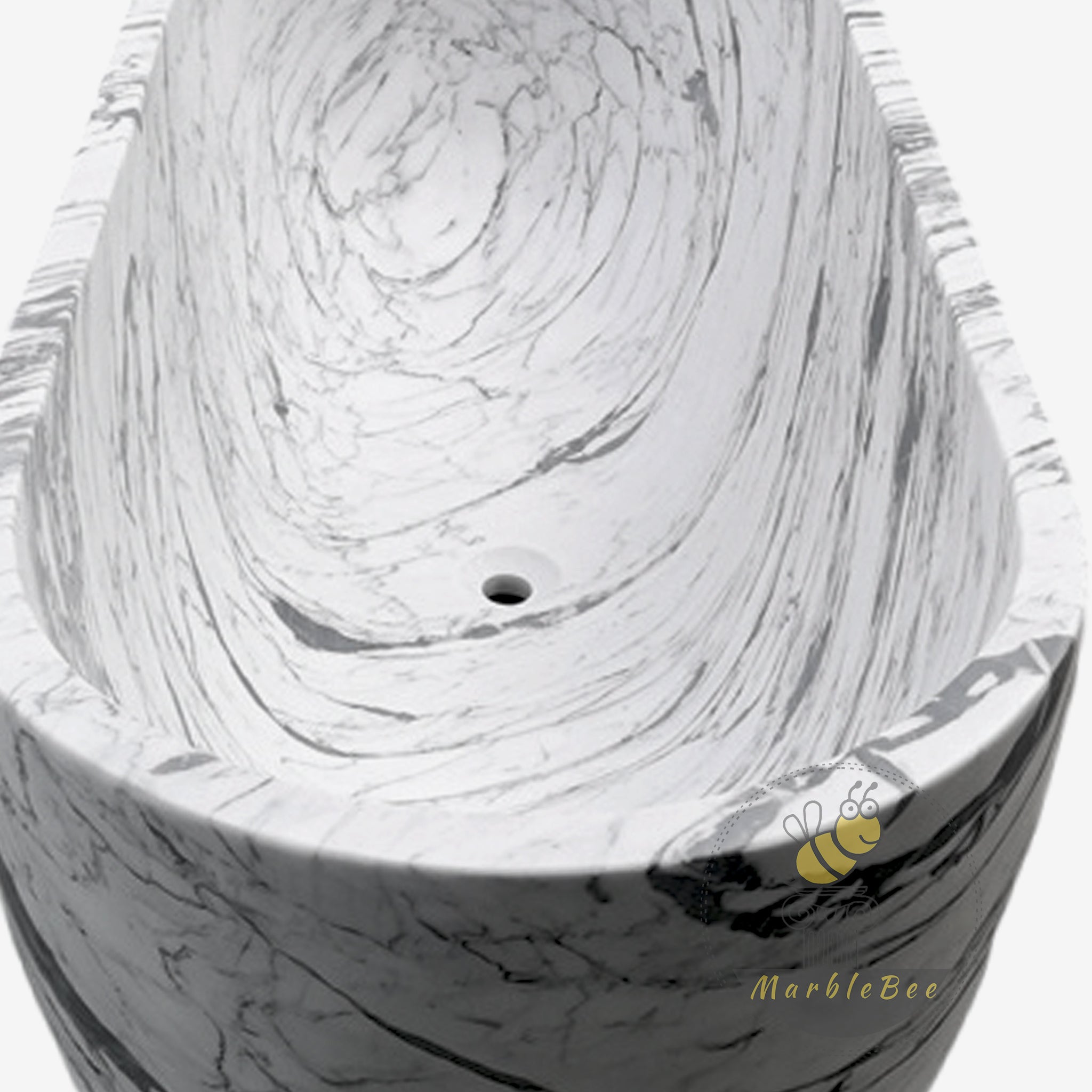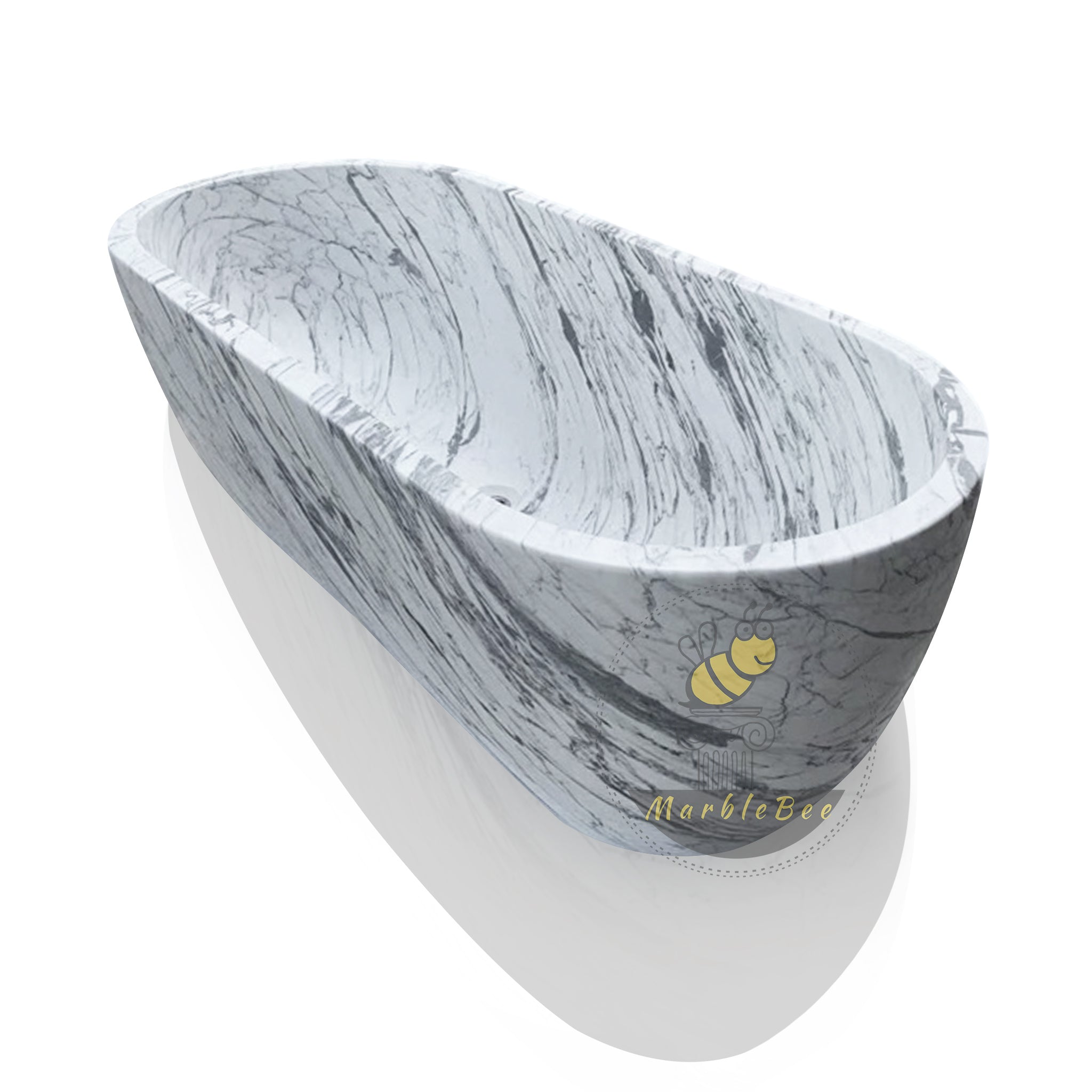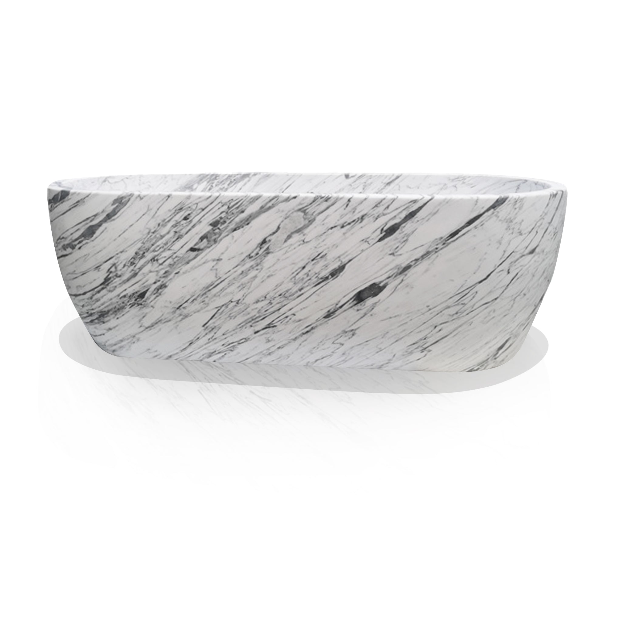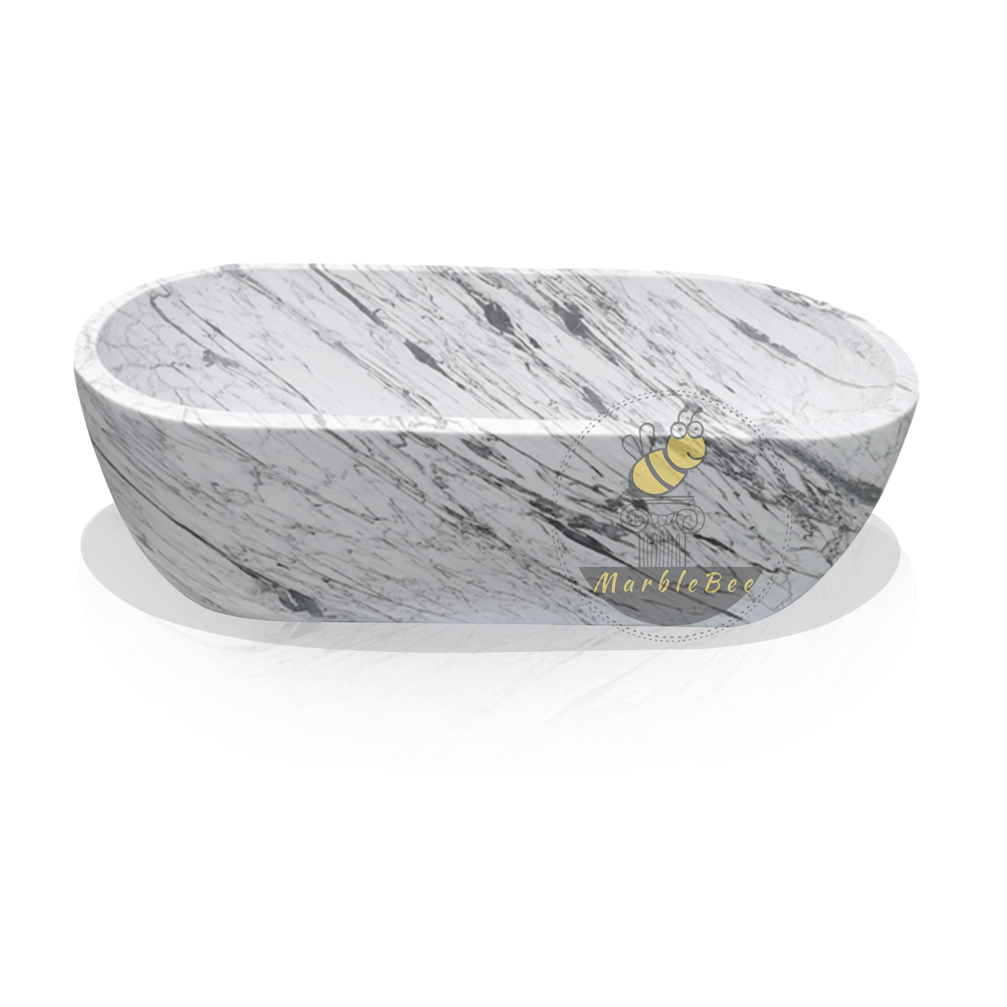 This custom Carrara White marble bath offers a luxurious focal point for any sophisticated bathroom. Crafted from exquisite Carrara marble, its pristine white surface with elegant veining brings a timeless beauty. This bathtub seamlessly integrates into a modern minimalist, classic, or spa-inspired interior, providing a serene and opulent bathing experience. Its natural allure elevates the aesthetic of any space, creating a haven of tranquility.