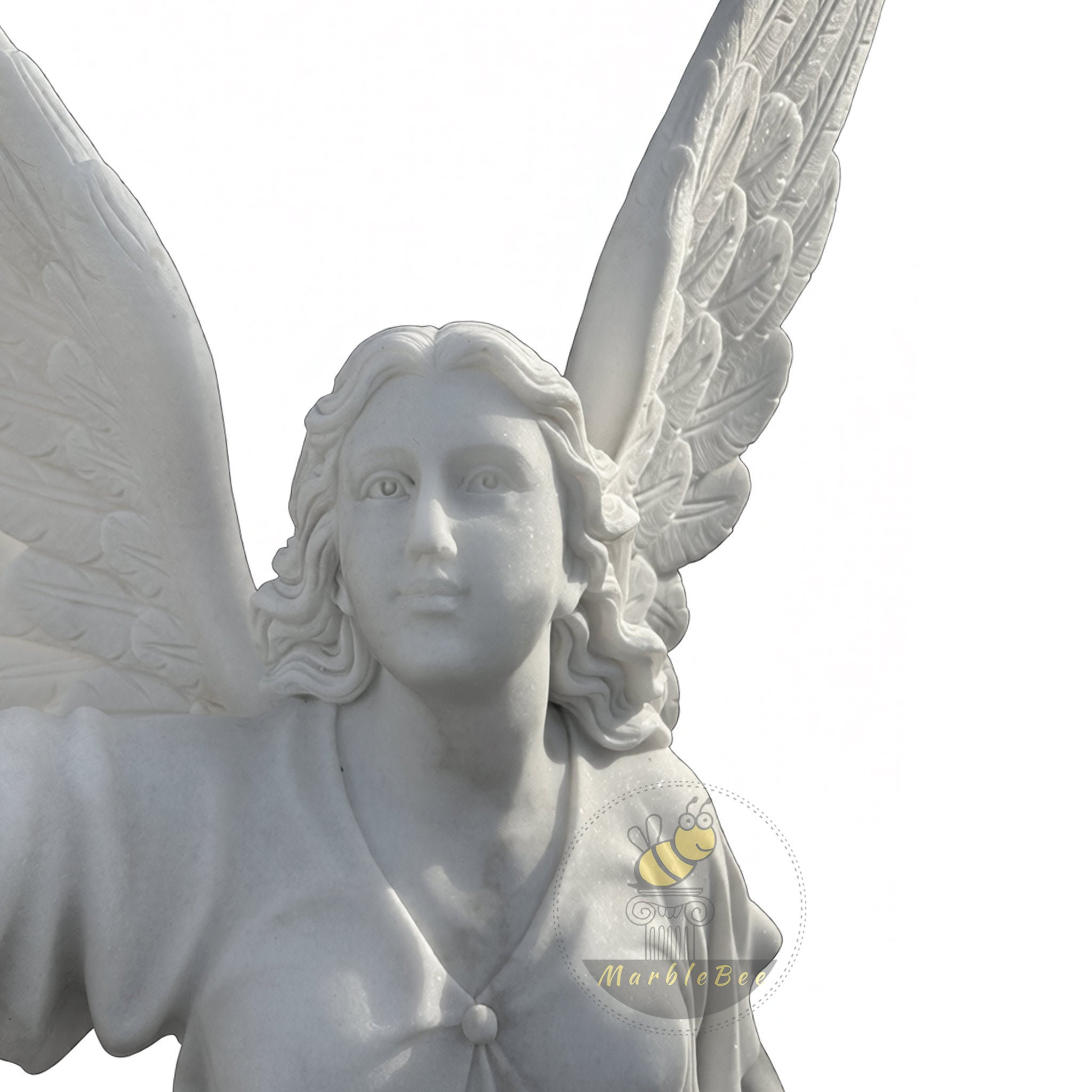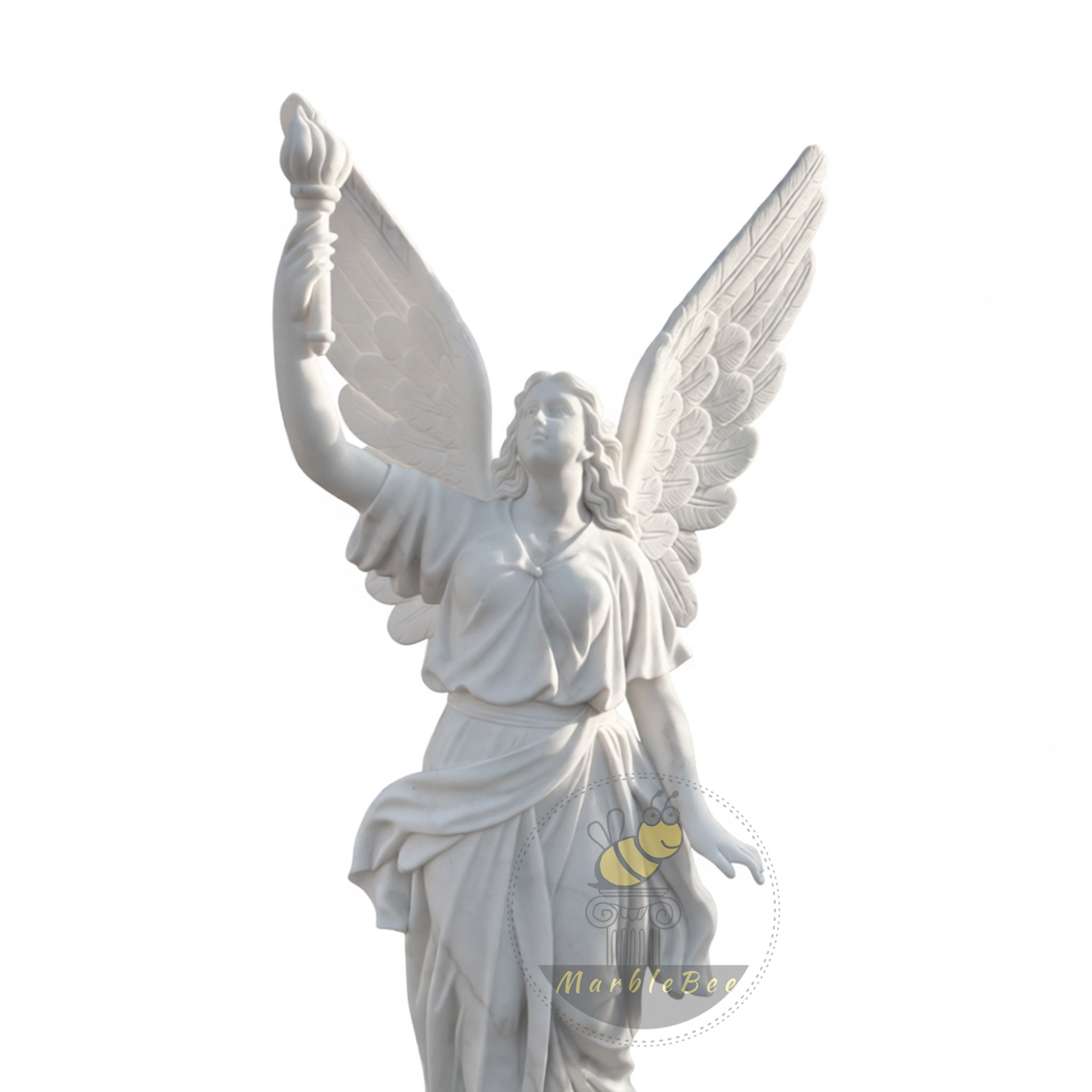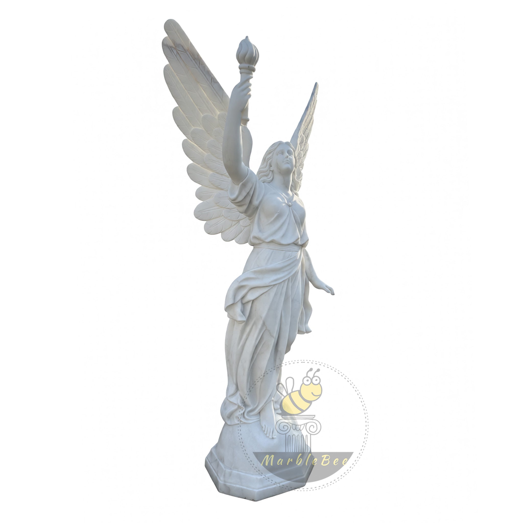 This majestic white marble winged angel statue rises gracefully on a domed pedestal, one bare foot stepping forward as if descending from the heavens. Her wide, feather‑rich wings flare outward, each plume deeply carved for dramatic texture and shadow. The angel lifts a torch skyward, symbolizing victory, guidance, and divine light, while her flowing robe wraps in soft, layered folds around her slender form. Ideal for entryways, memorial gardens, or spiritual retreats, this sculpture creates an inspiring focal point that feels both uplifting and serene, especially when framed by greenery, water features, or subtle lighting.