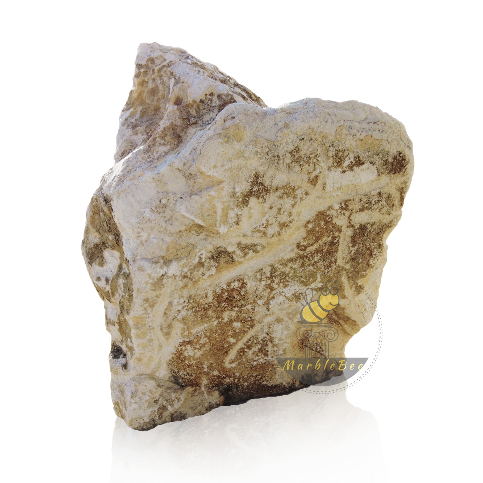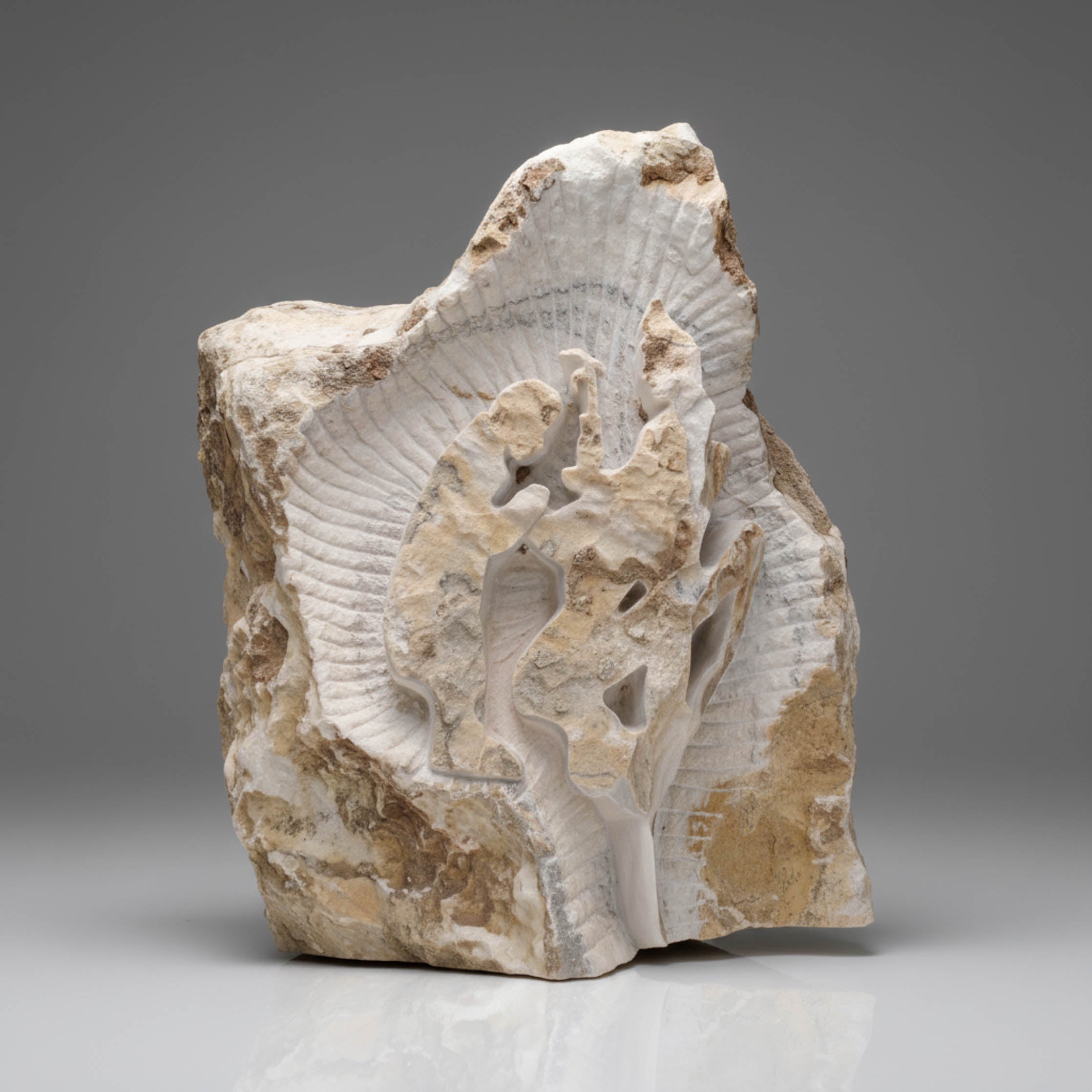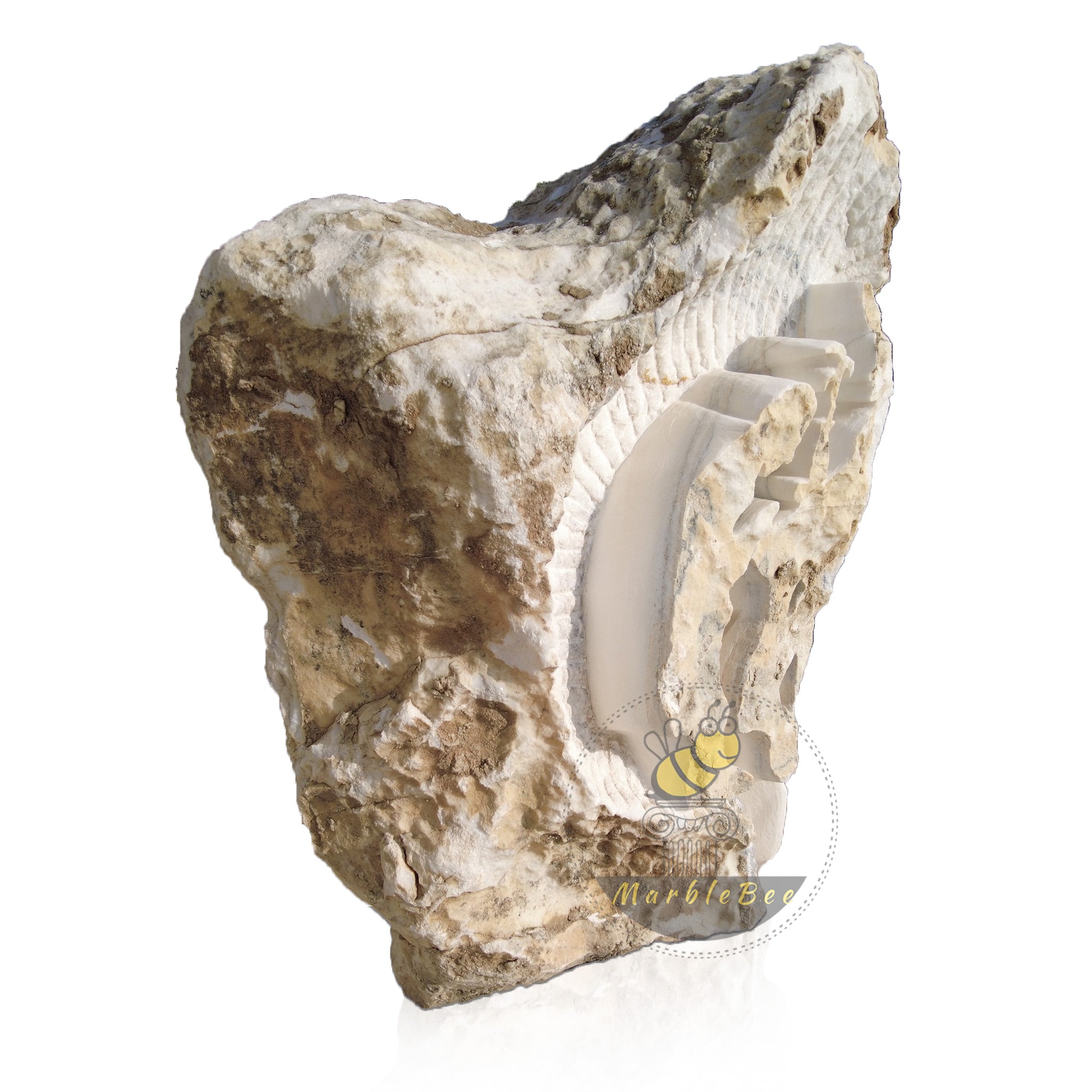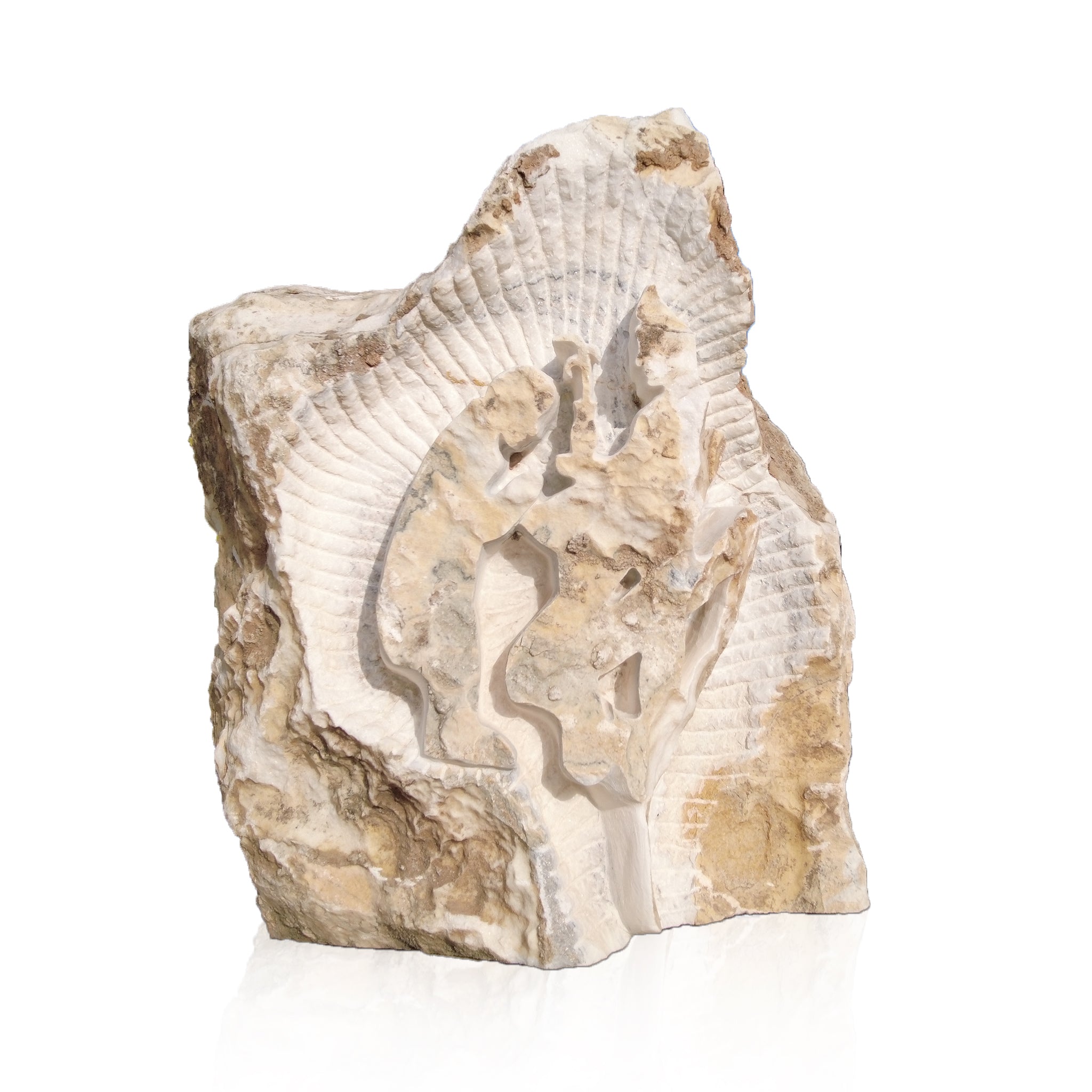 Abstract-style marble relief of Guanyin (or Buddha), carved in raw stone with antique grotto inspiration.