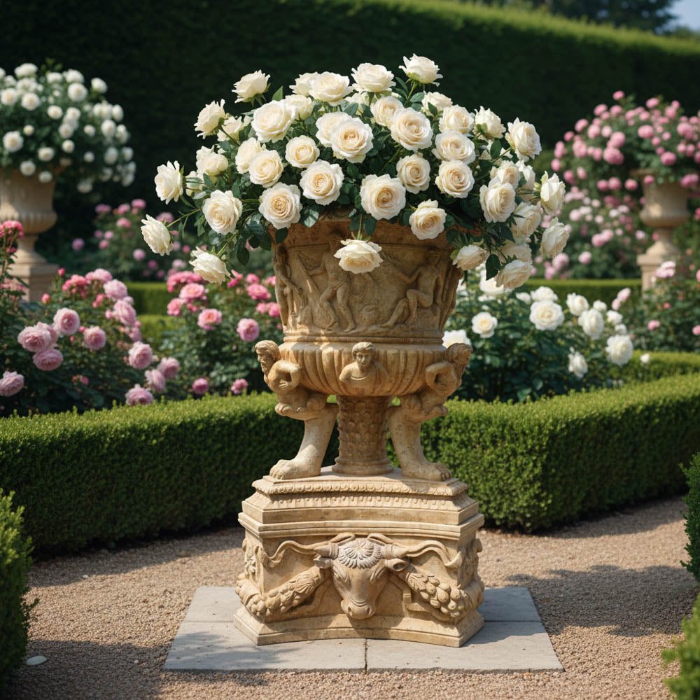 This garden urn vase boasts a classical and timeless aesthetic, with exquisite hand carving details and human sculptural elements. It resembles a classical urn or amphora, featuring a base adorned with a bull head carving. This design is a tribute to the architectural styles of ancient Greece and Rome.