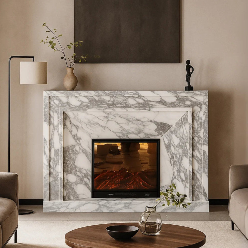 Ignite Italian charm with our Arabescato Stone Fireplace Italian, its sleek rectangular form glowing with white and gray veining. This medium-height stone beauty warms any room. In stock for instant delivery or tailor it with our custom design service. Let this fireplace infuse your home with timeless allure now.