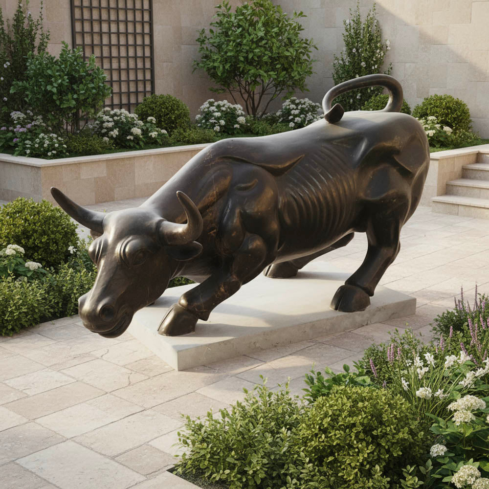 A formidable hand-carved black limestone bull, captured in a powerful charging stance. Its muscular form and intense expression are meticulously detailed, embodying raw strength and determination