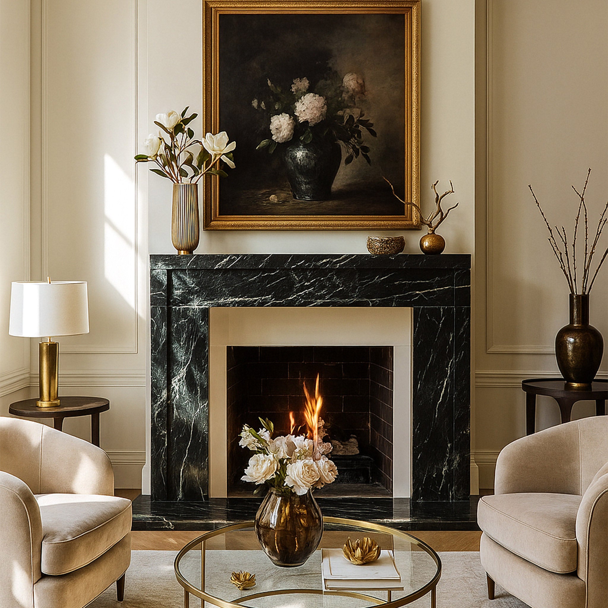 This striking fireplace mantel redefines contemporary elegance with its bold, geometric design, crafted from exquisite nero marquina. The clean, straight lines create a minimalist silhouette, while the layered frieze and jambs add subtle architectural depth. The natural movement of the marble's patterns is highlighted by the simple, rectilinear forms, making this piece a sophisticated statement ideal for modern and transitional interiors seeking understated luxury and sculptural appeal.