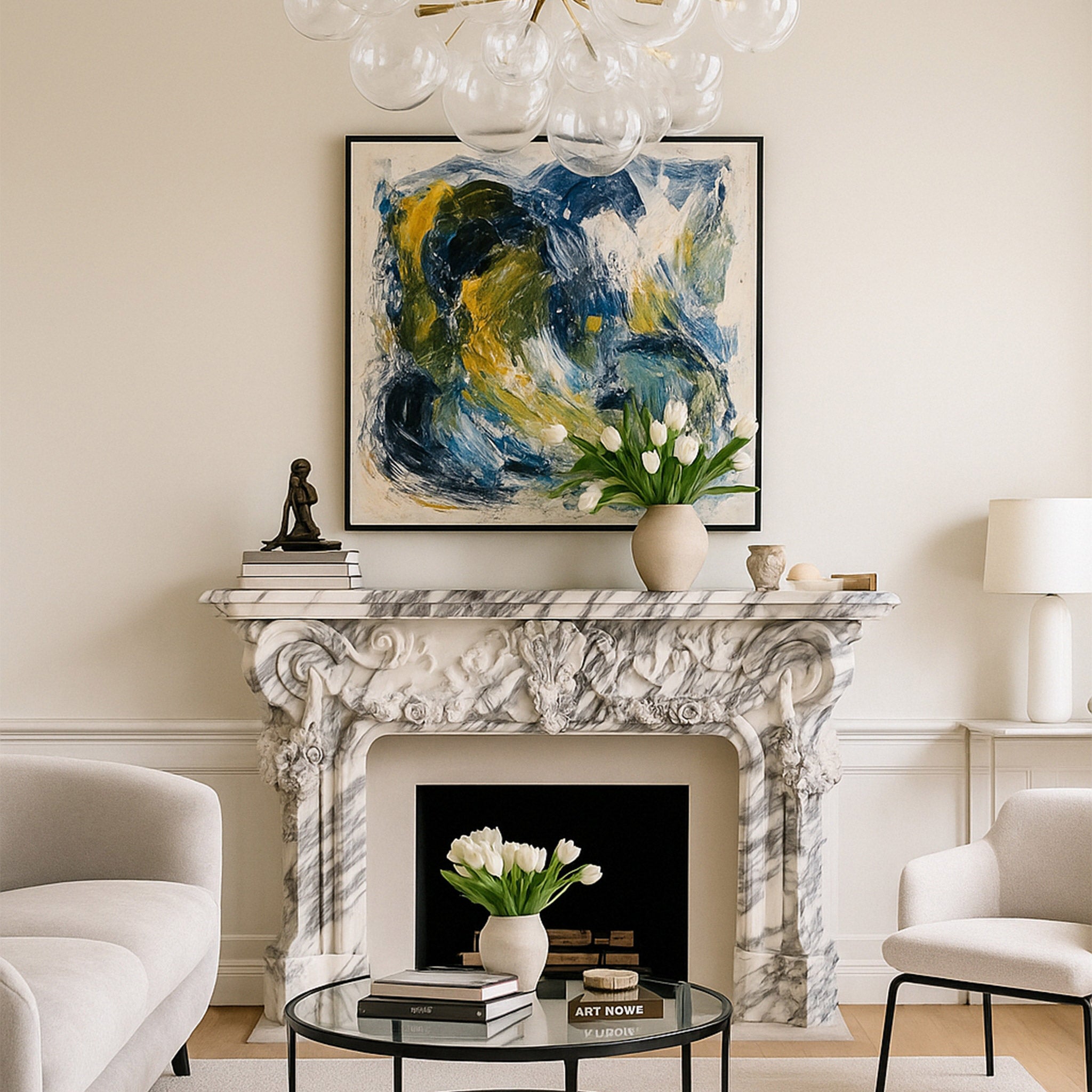 Experience unparalleled luxury with this magnificent fireplace mantel, sculpted from exquisite Calacatta White Marble. Its opulent design features a deeply carved frieze adorned with lush floral garlands, overflowing fruit, and intricate classical motifs that celebrate masterful hand-craftsmanship. The gracefully curved jambs are embellished with cascading roses and rococo-inspired scrollwork, making this piece a breathtaking focal point. The dramatic grey veining of the Calacatta marble enhances its artistic grandeur.