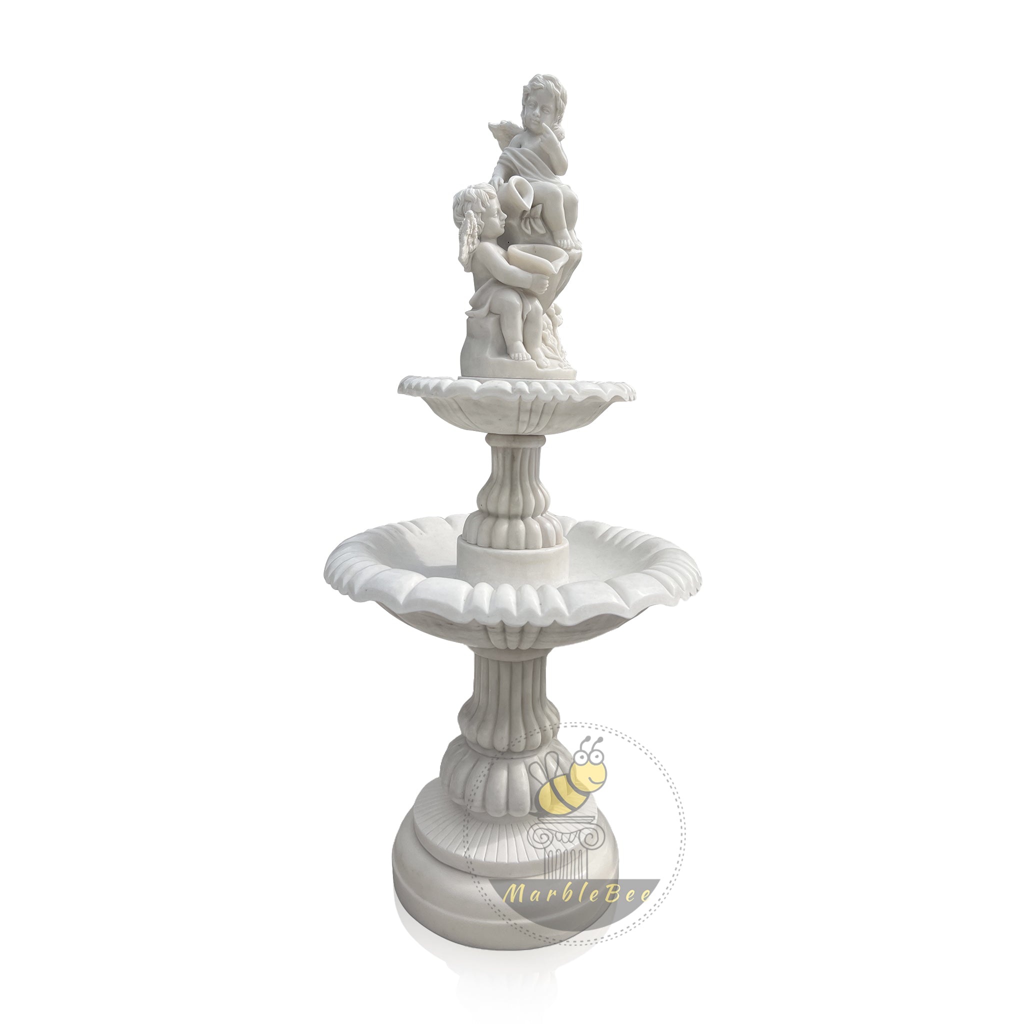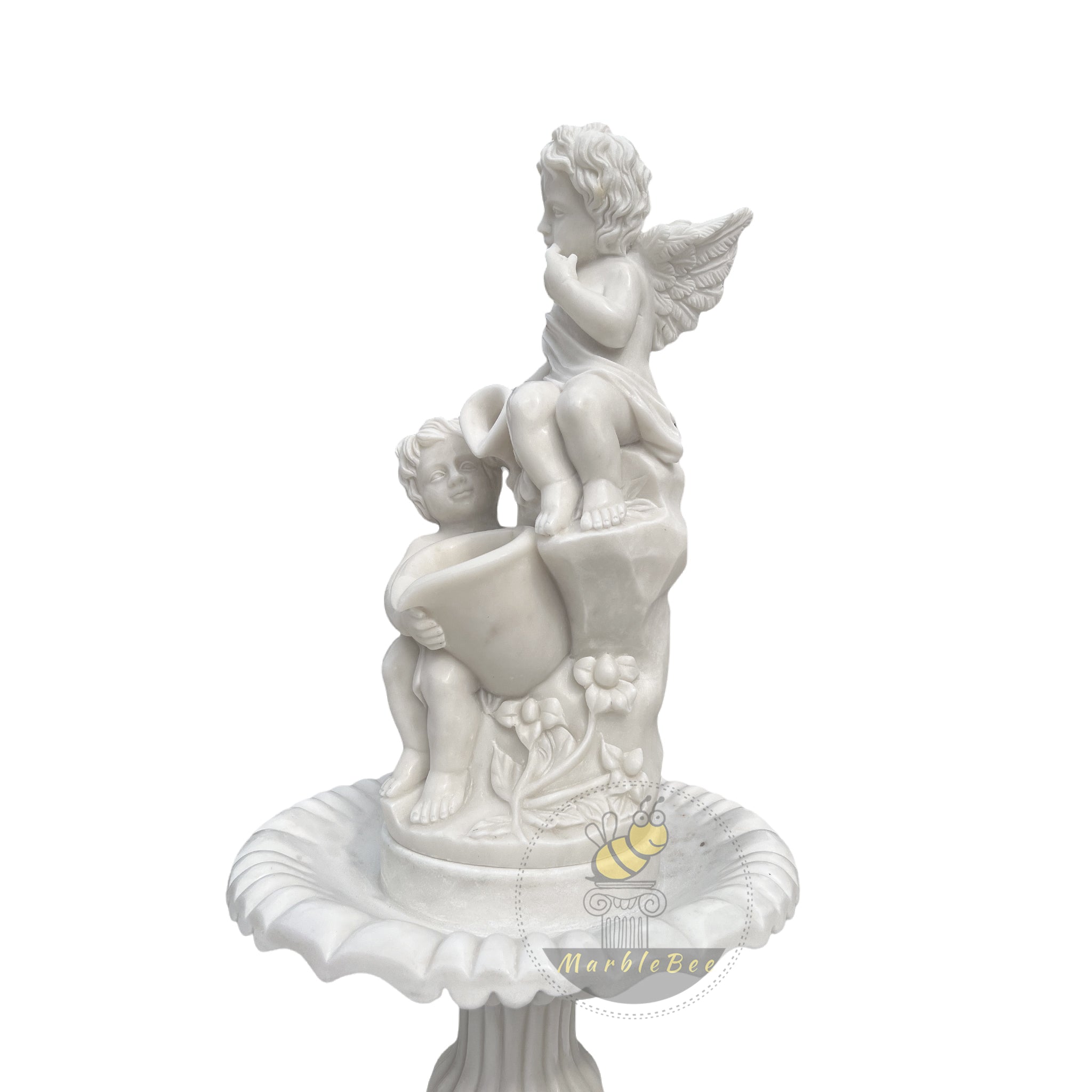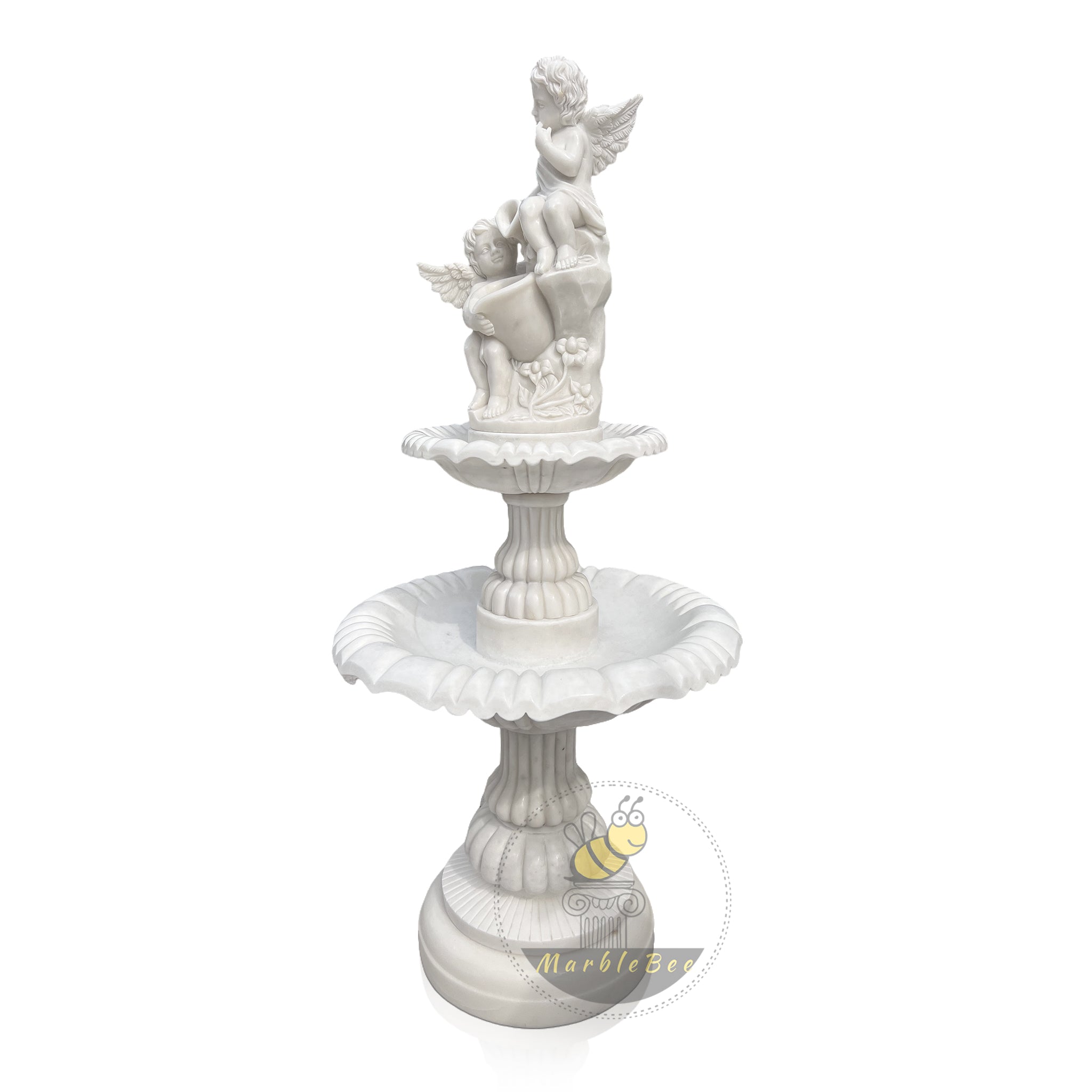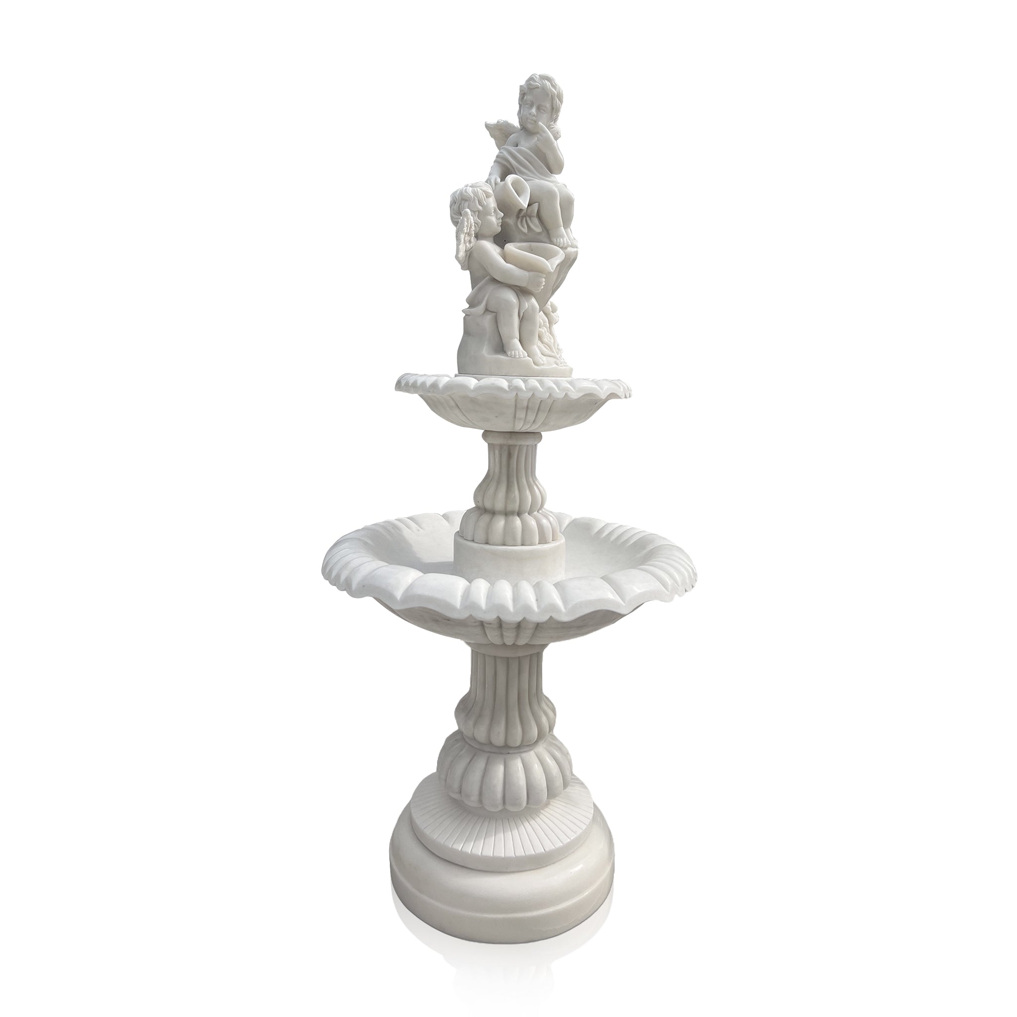 Enjoy the gentle flow of this two-tier cascading fountain, carved from solid white marble. Water spills from the top, activated by a charming statuary scene of two cherubs pouring and catching water. It overflows from a scalloped upper bowl into a larger, matching basin, creating a tranquil display. With its ornate, fluted pedestals and intricate angelic details, this fountain is a beautiful centerpiece of classical art.