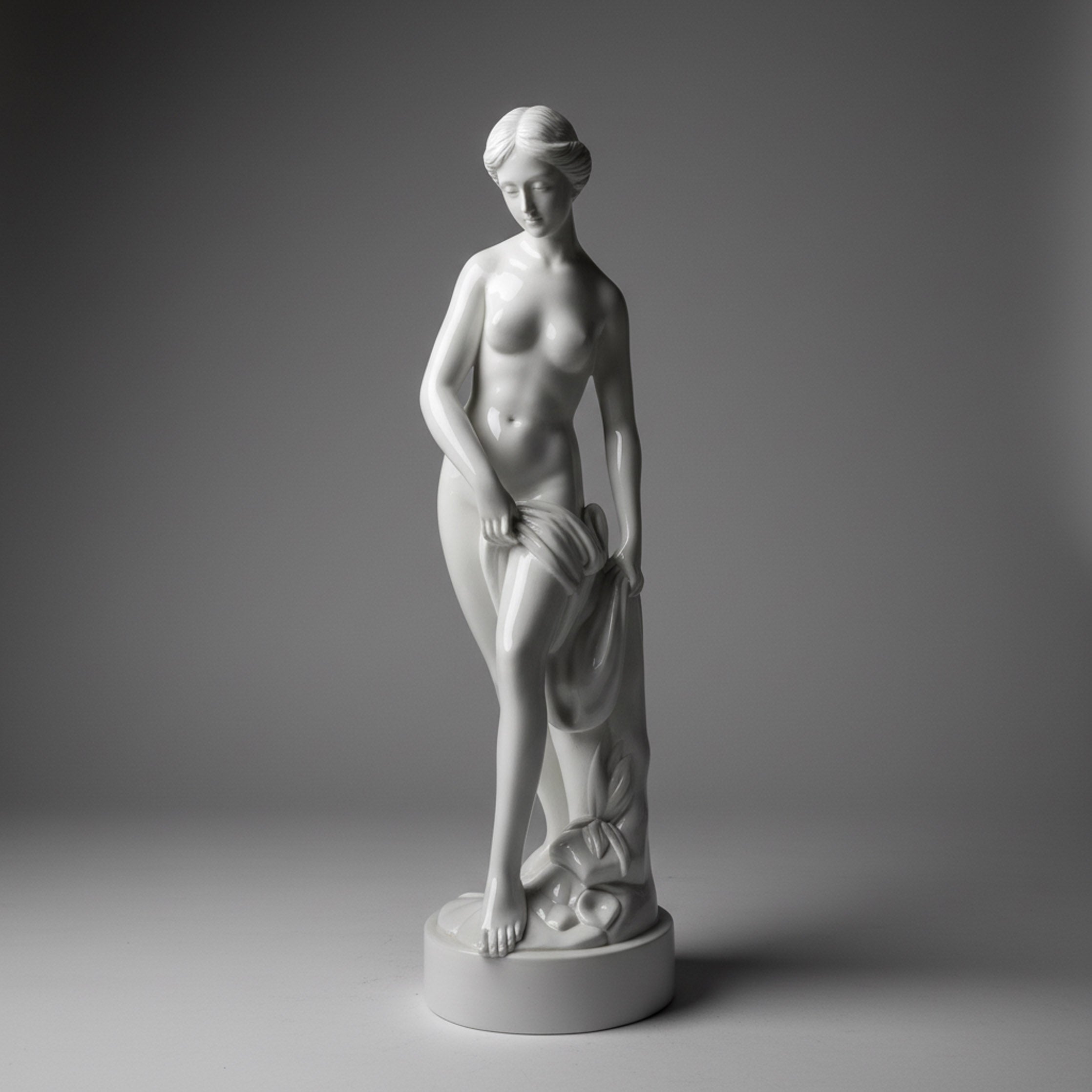 This Custom Marble Statue features a slender, graceful build of a classical female figure in a moment of repose. Carved from premium white marble, the sculpture displays a delicate S-curve silhouette as she leans against a naturalistic tree stump. An eccentric feature is the high-gloss, porcelain-like finish that gives the stone a radiant, translucent quality under light. The build is lithe and anatomically precise, standing on a circular integral base that provides a stable, compact footprint. It is a timeless masterpiece of stone artistry, perfect for luxury interior galleries or garden alcoves.