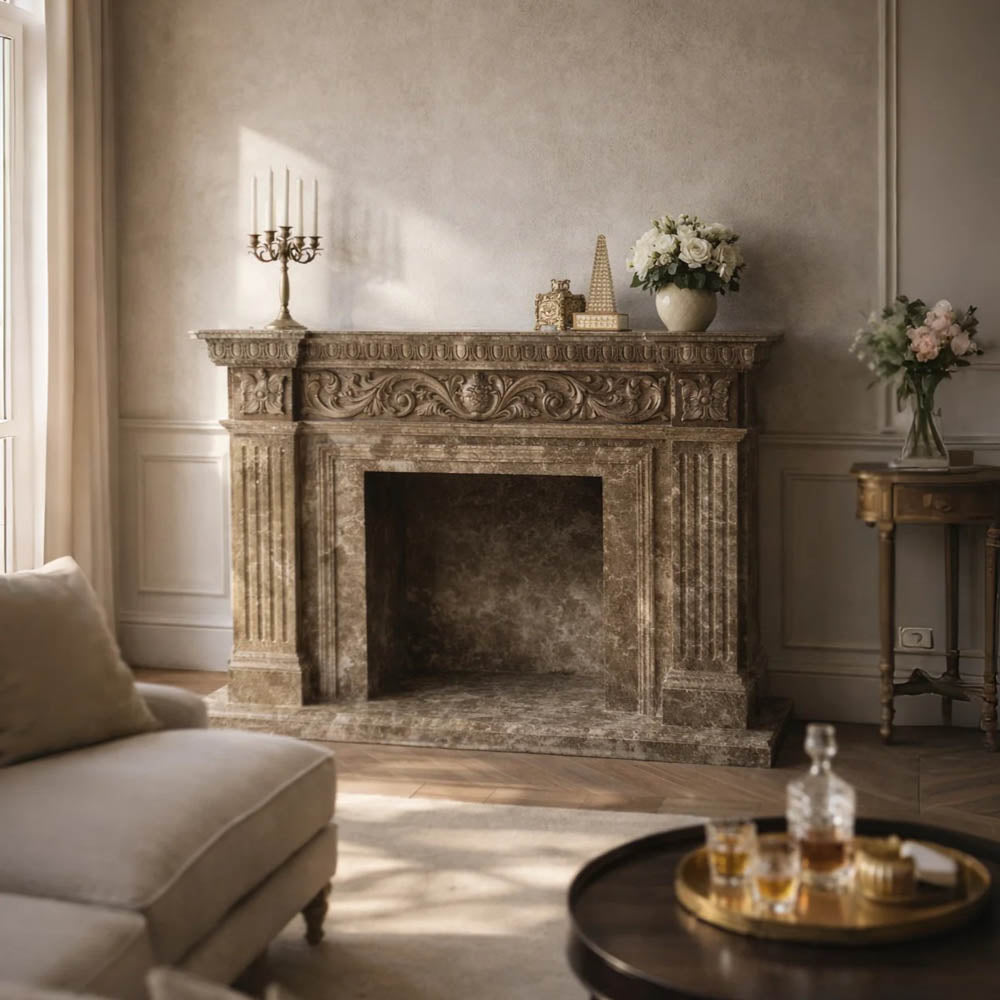 Introduce a touch of timeless elegance into your home with the magnificent Emperador Dark Marble Fireplace, a masterpiece of heavily hand-carved rustic Emperador marble, with intricate details that are truly unique, as they are painstakingly crafted by hand.