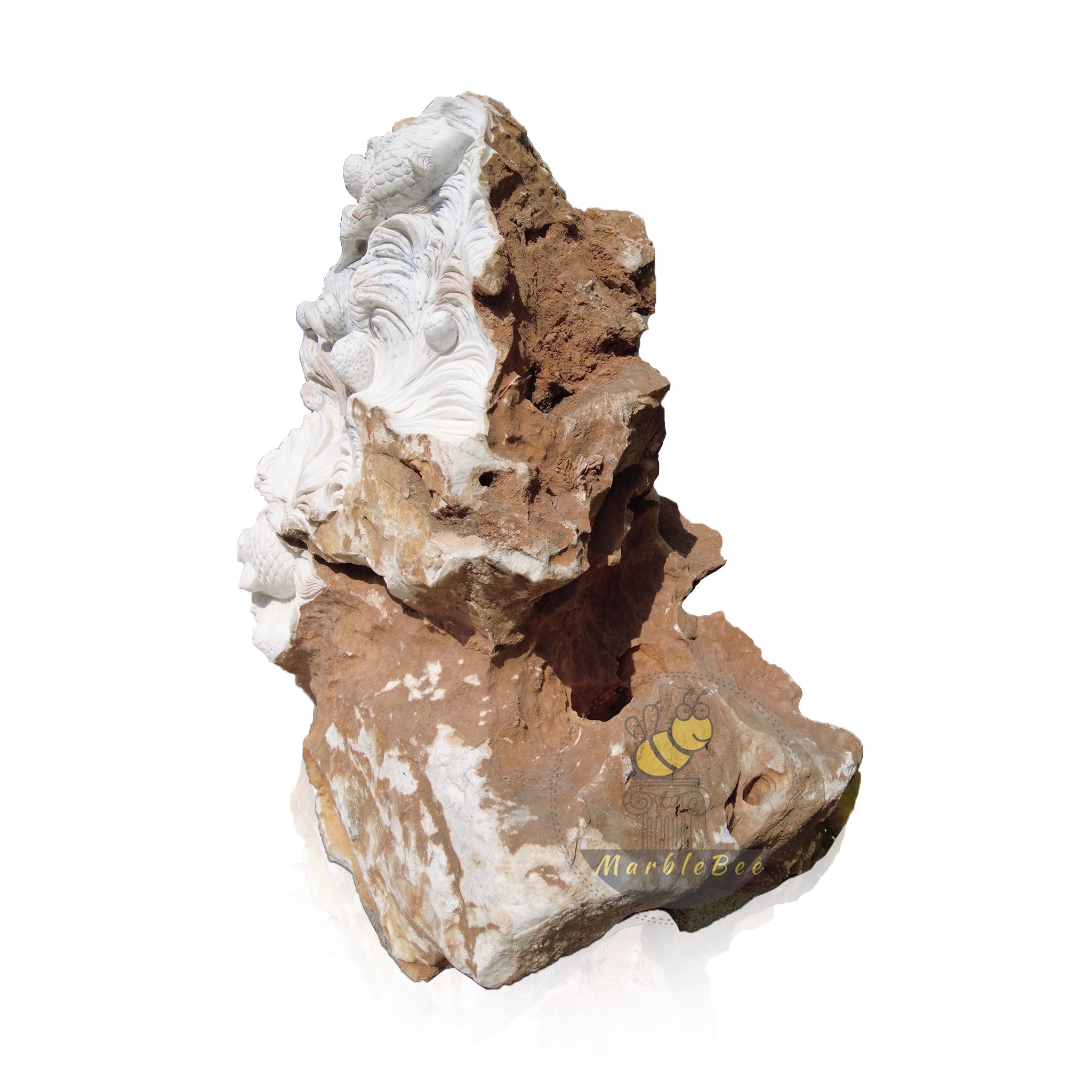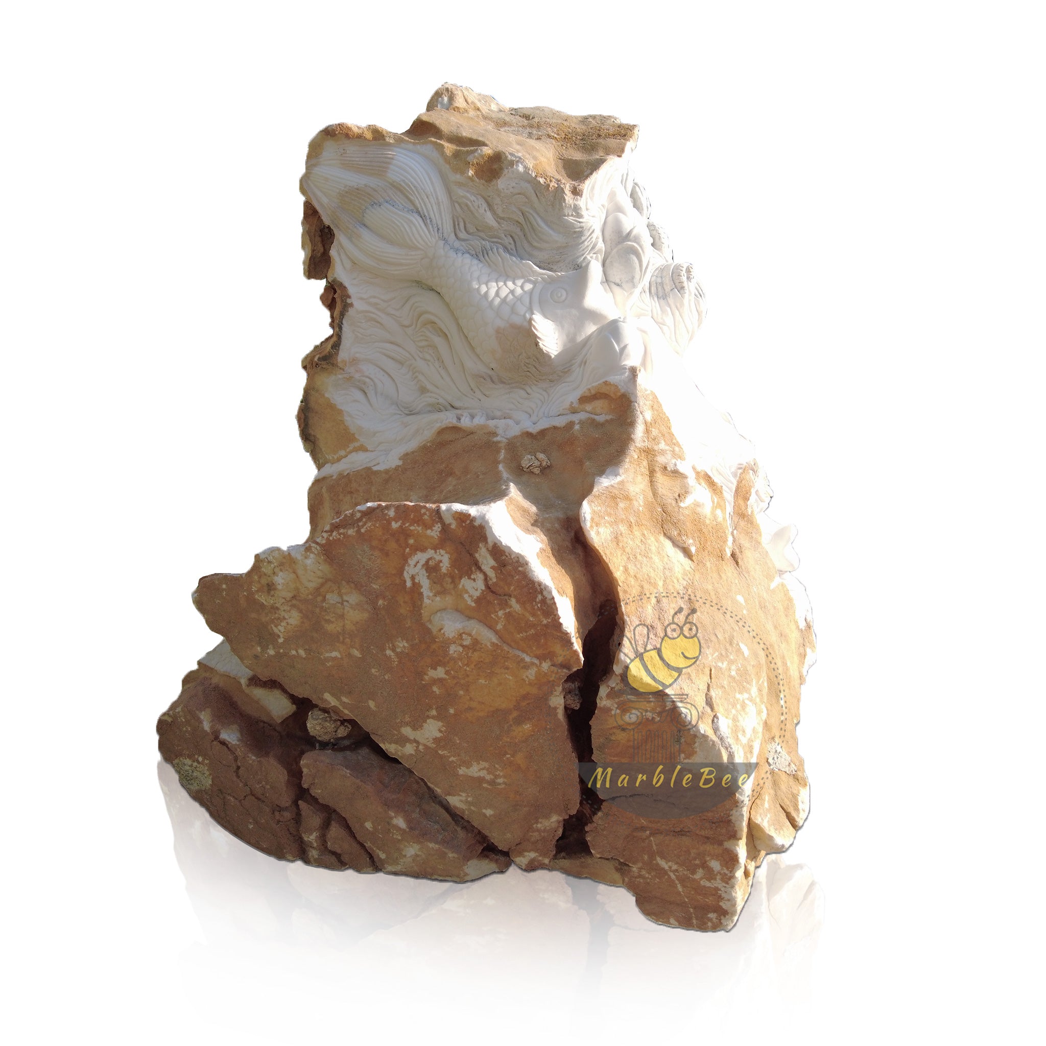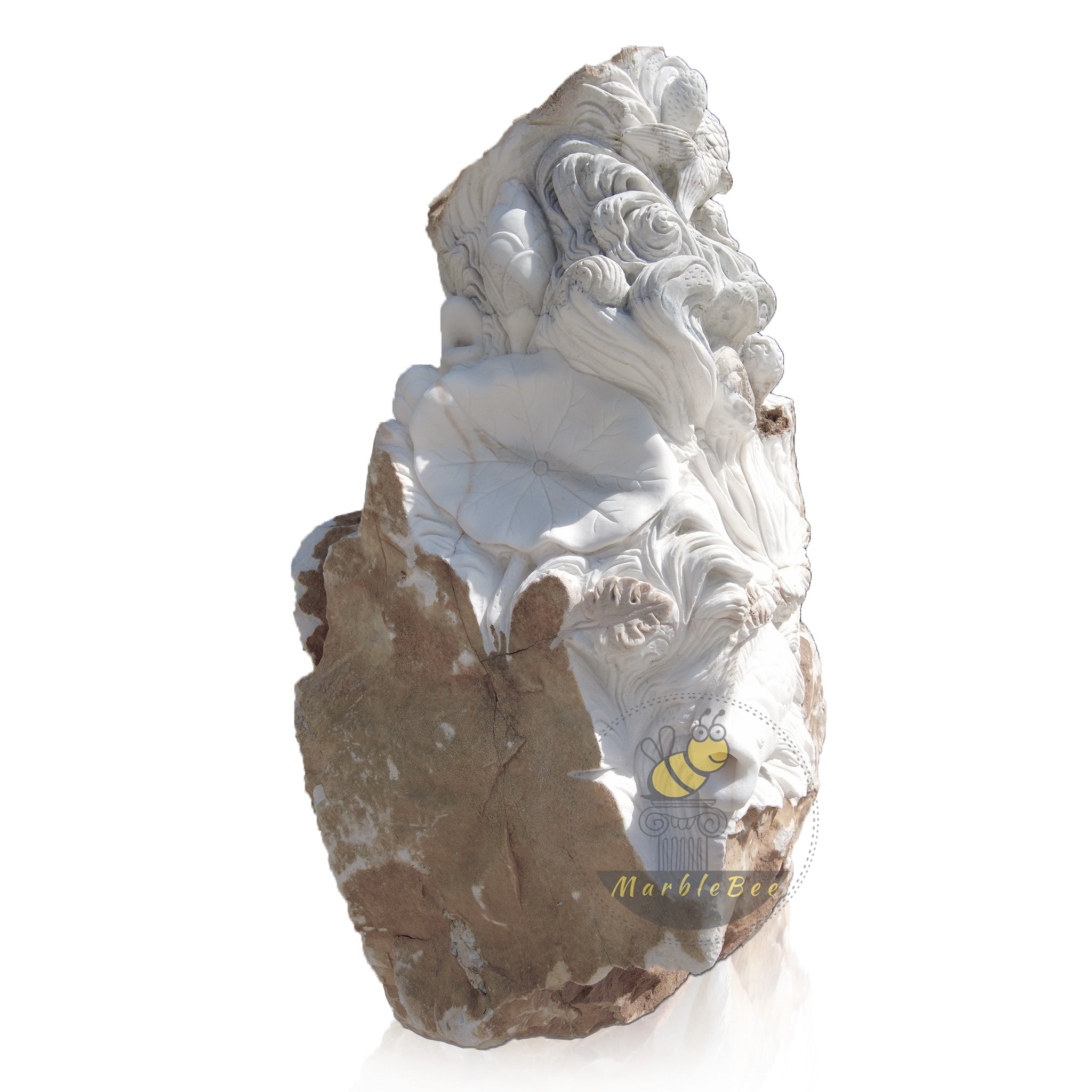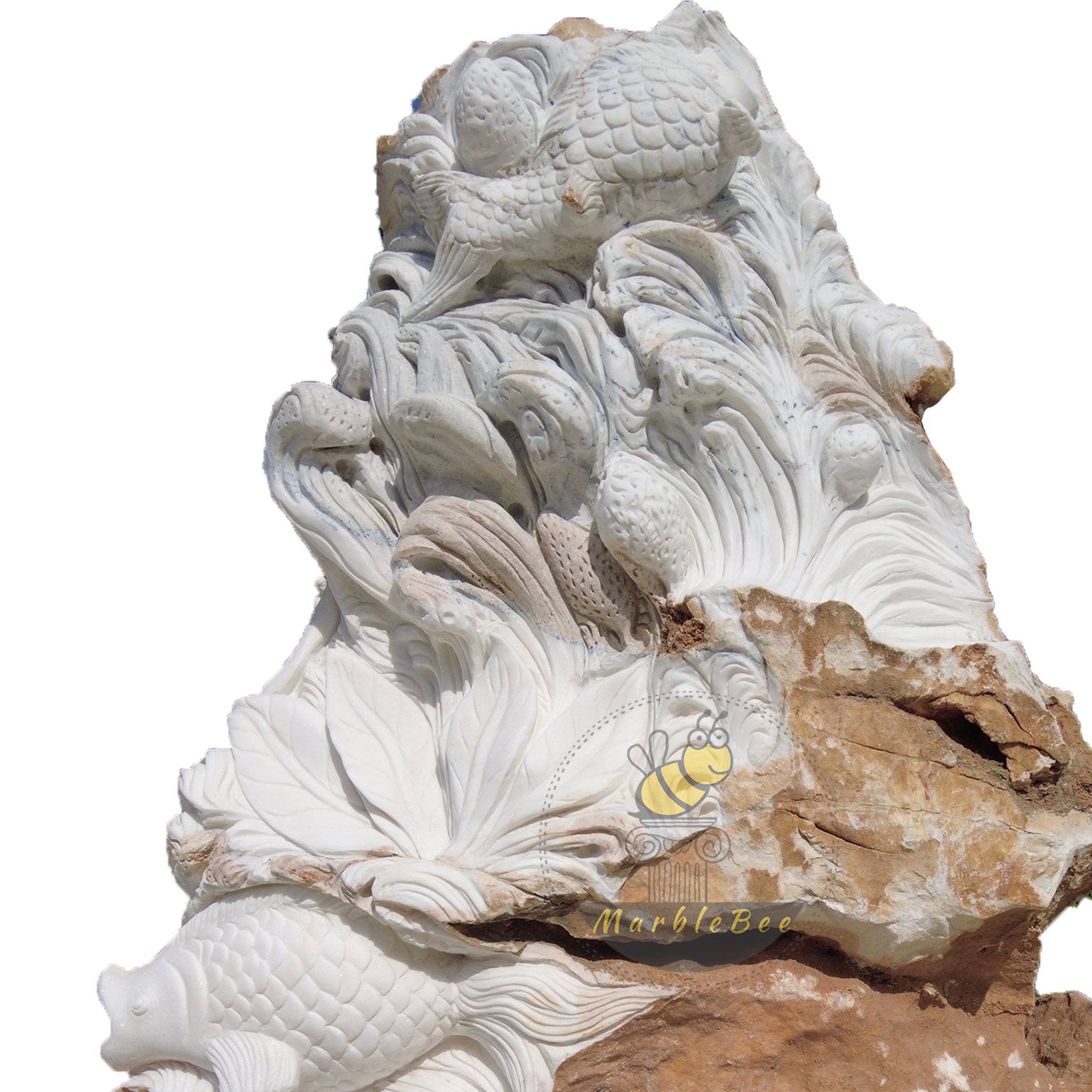This dynamic Koi and Waves Stone Carving seems to live and move in Moon White Marble. Intricate fish and lotuses emerge from the raw stone, creating a unique natural edge relief sculpture for your garden