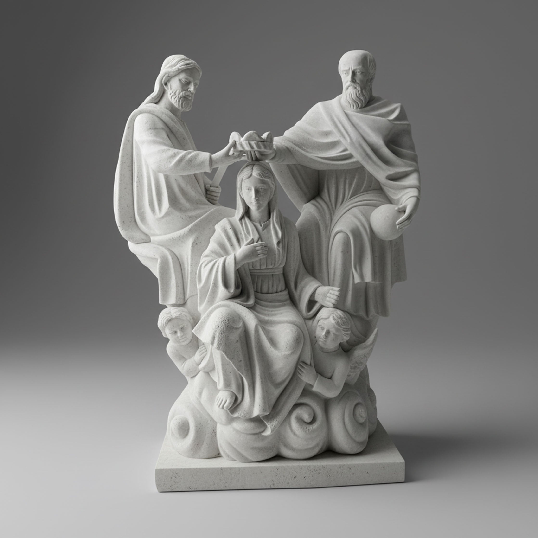This large marble sculpture features a complex, multi-figure build depicting the Coronation of the Virgin Mary by the Holy Trinity. Hand-carved from pristine white marble, the sculpture has a wide, sturdy base that transitions into a cloud-like foundation. An eccentric feature is the inclusion of two winged cherubs at the base, looking upward with detailed, youthful expressions. The figures of Christ and God the Father flank Mary, creating a balanced, tiered silhouette. The stone is finished to a soft, silky texture, highlighting the intricate crown and the delicate flowing robes of the heavenly assembly.