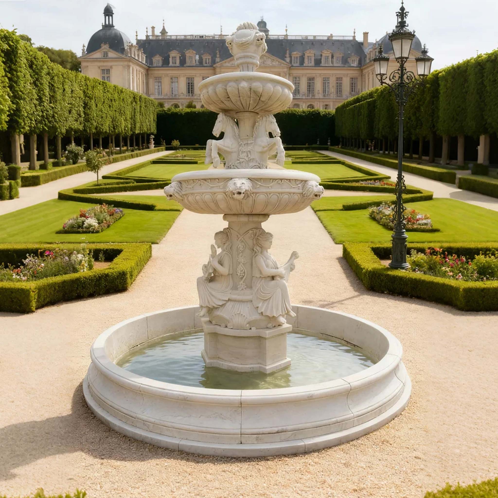 Enhance your outdoor space with this exquisitely carved two-tiered marble fountain. Featuring elegant female figures gracefully playing instruments at its base, the fountain rises to a middle tier adorned with spirited horses, and culminates in a beautifully fluted upper bowl. Lion head spouts add a classic touch to the main basin. Crafted from pristine natural marble, this fountain combines artistic beauty with the soothing sound of water, creating a tranquil and luxurious atmosphere for any garden or courtyard.